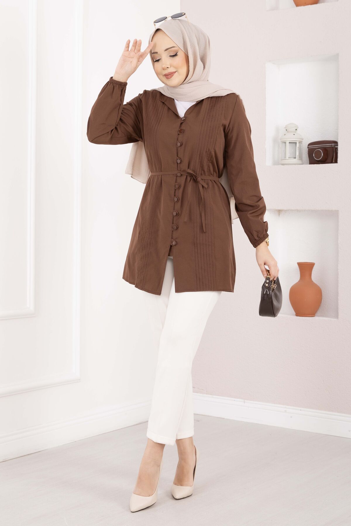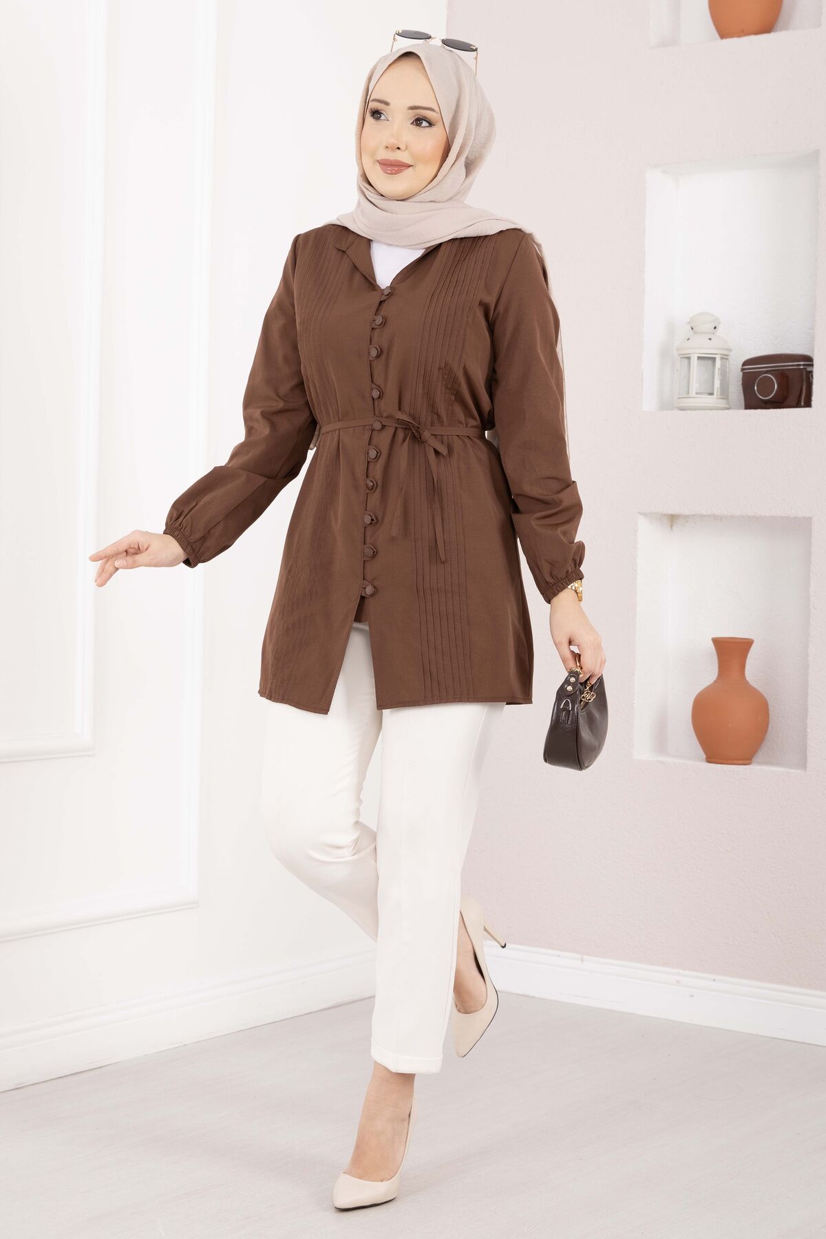 Nervür Detaylı Bağcıklı Gömlek Kahve