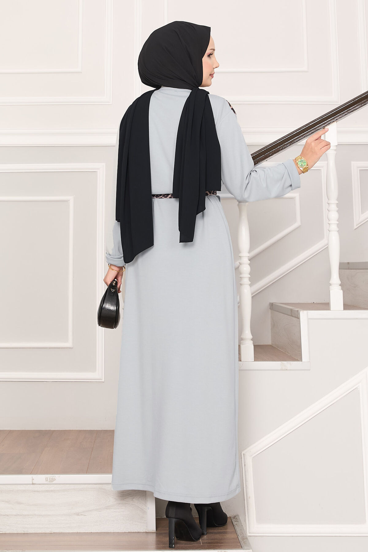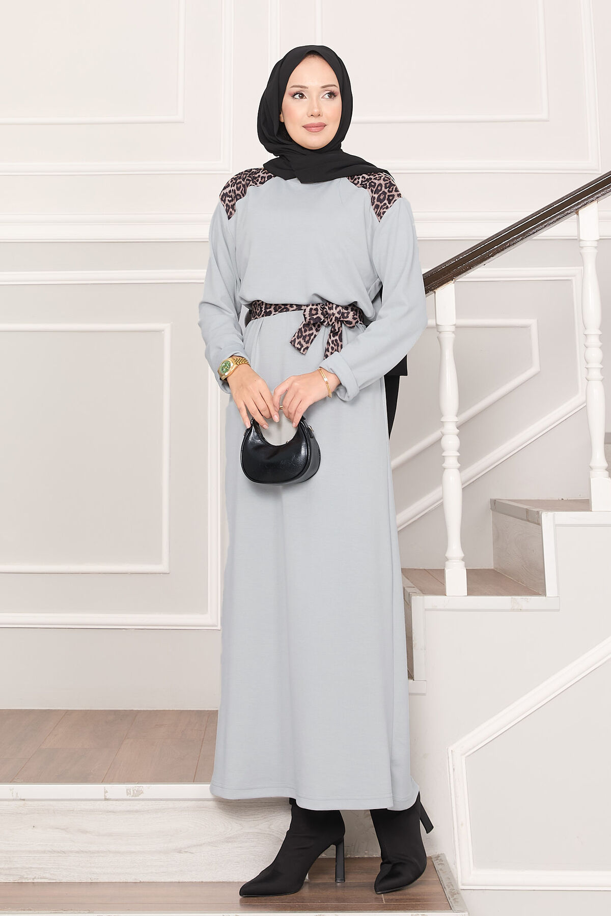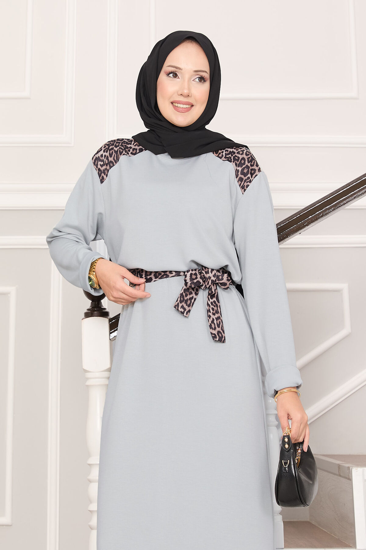 Omuz Leopar Garnili Kuşaklı Oyşo Elbise Gri Yorumları
