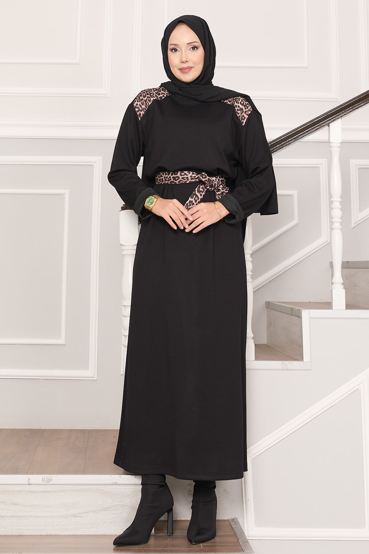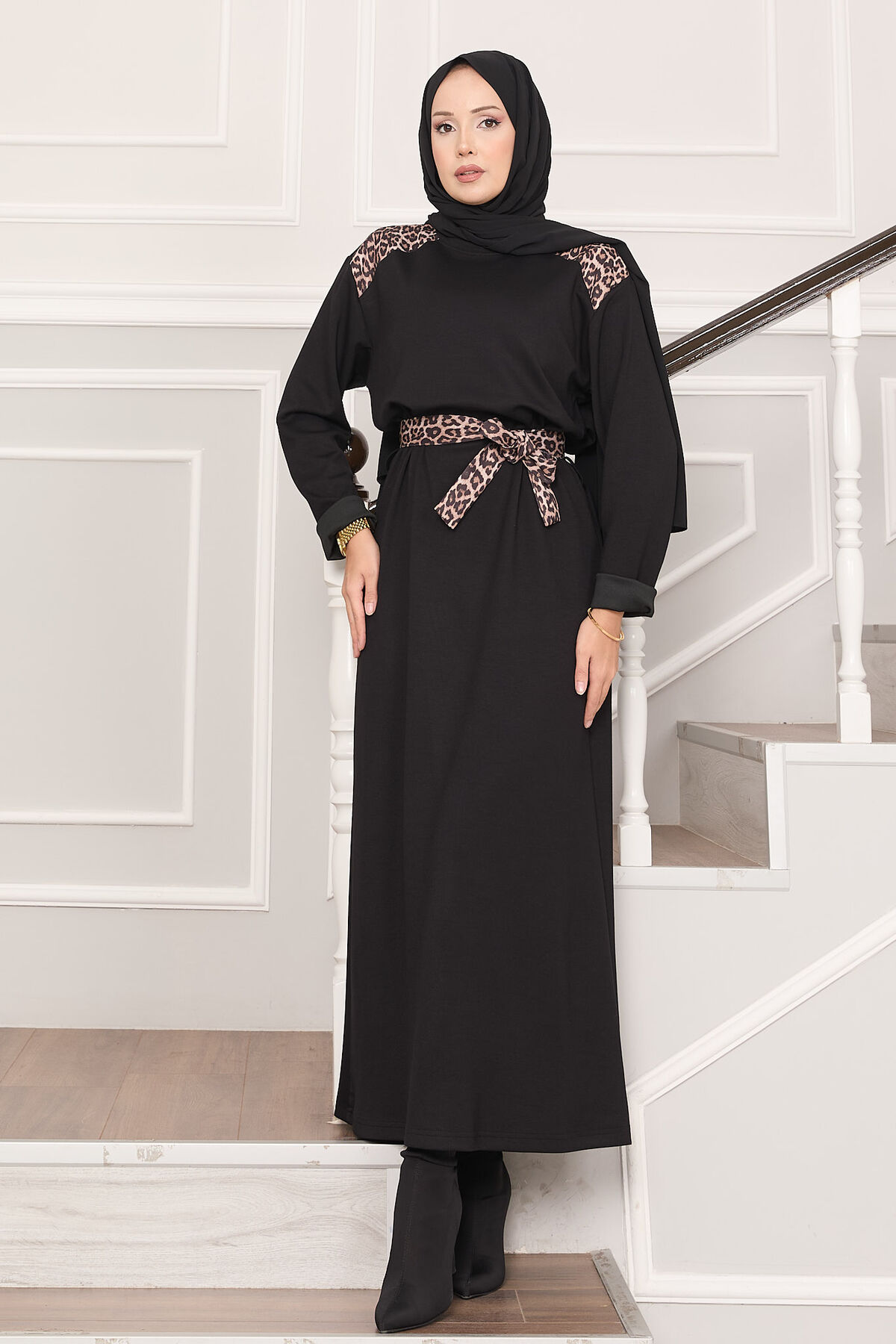 Omuz Leopar Garnili Kuşaklı Oyşo Elbise Siyah