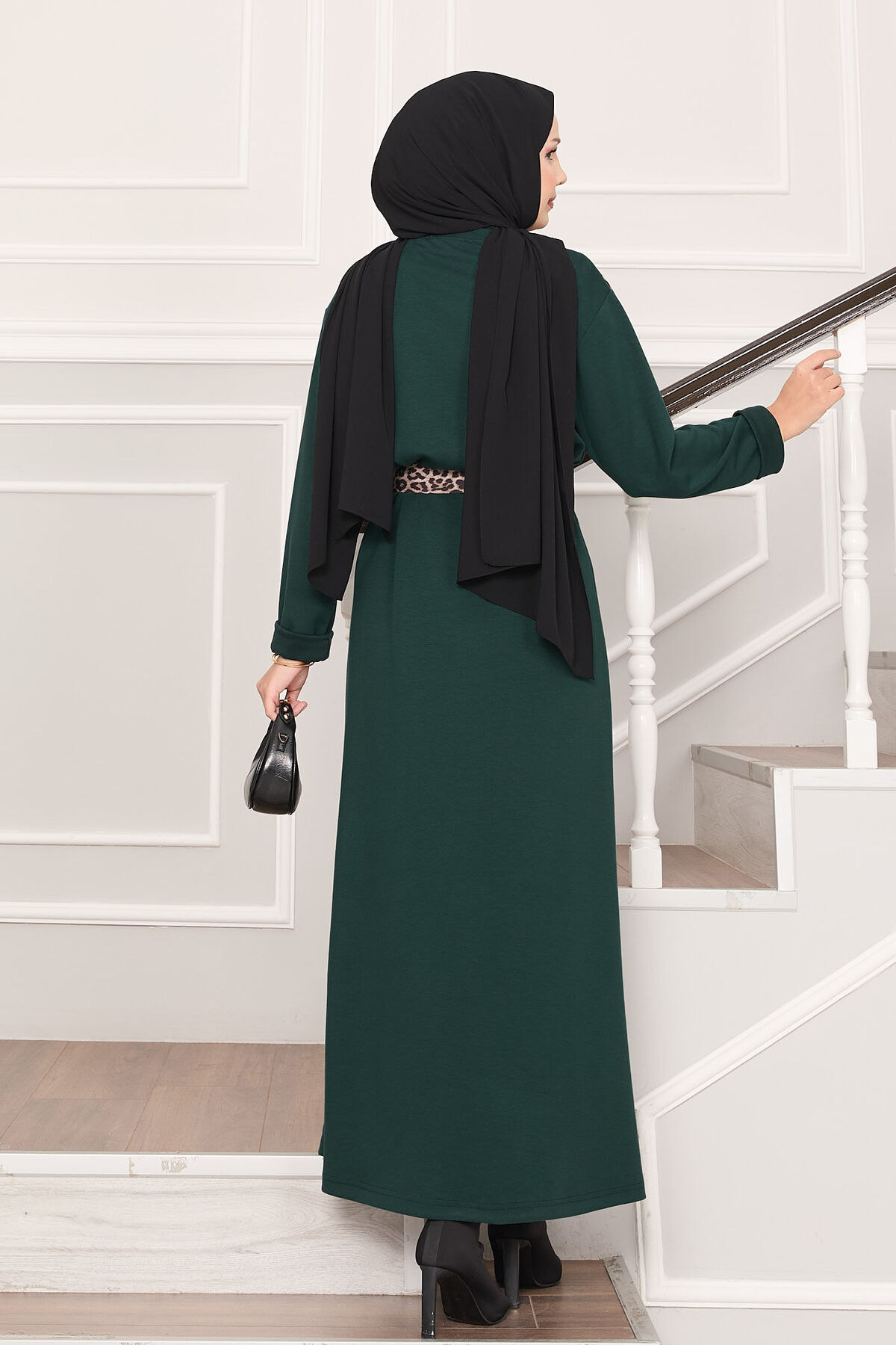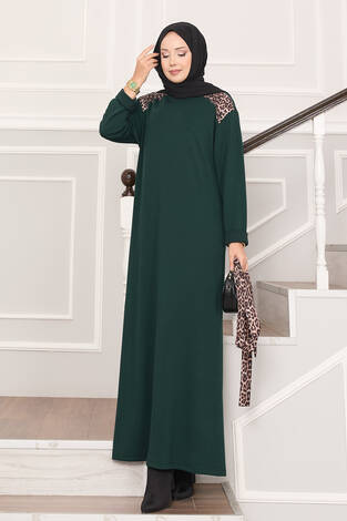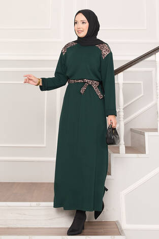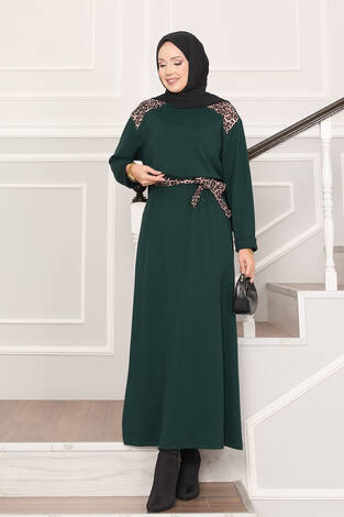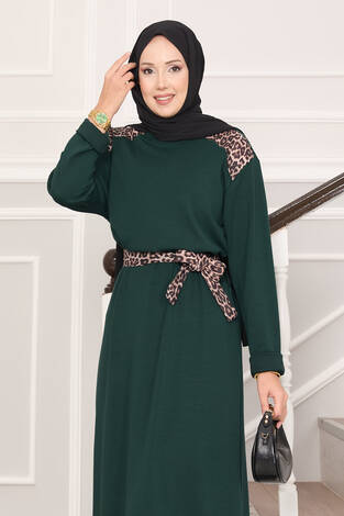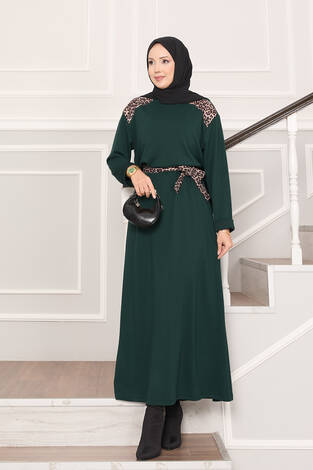 Omuz Leopar Garnili Kuşaklı Oyşo Elbise Zümrüt