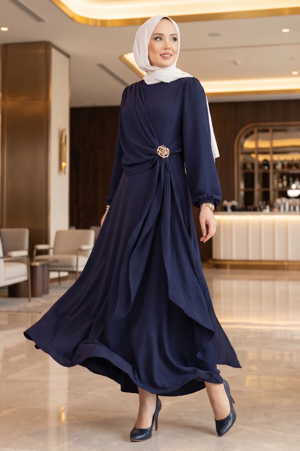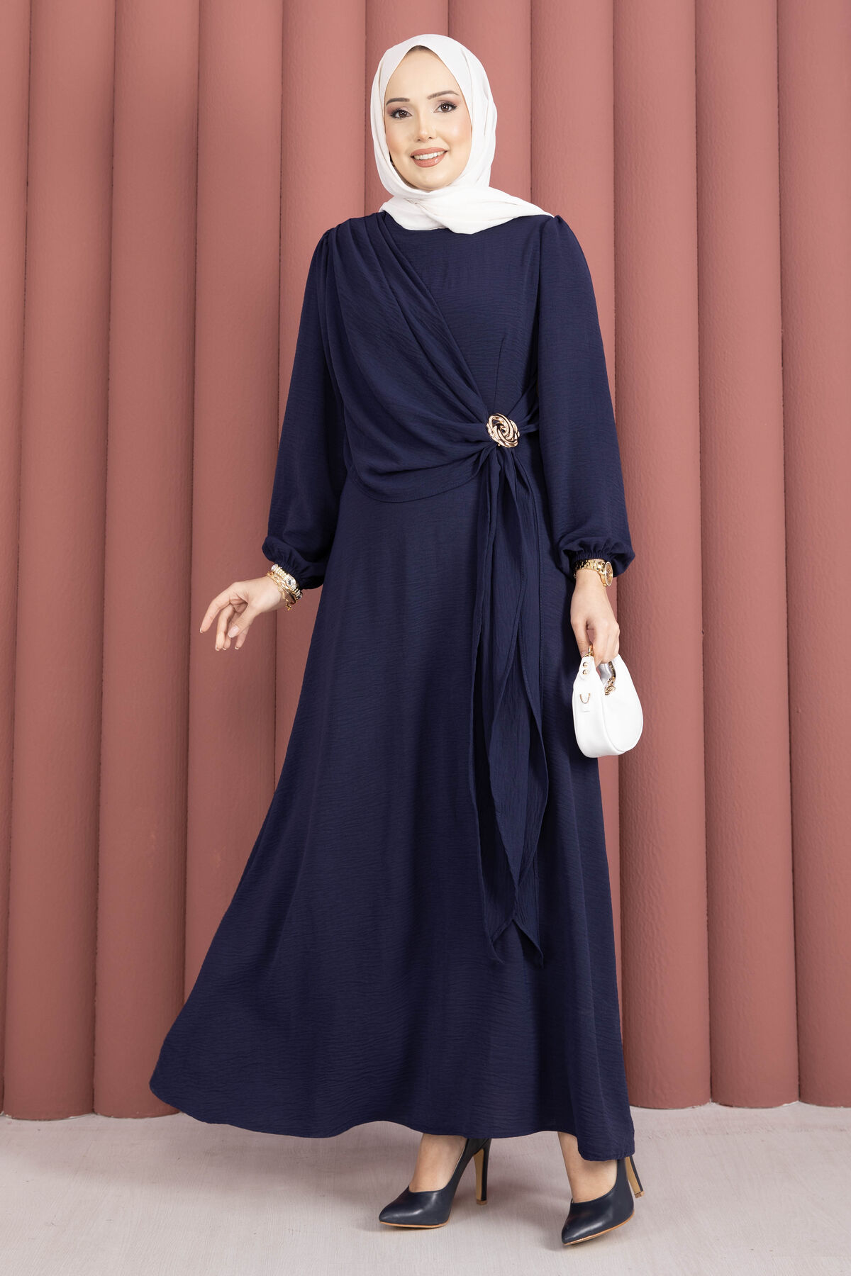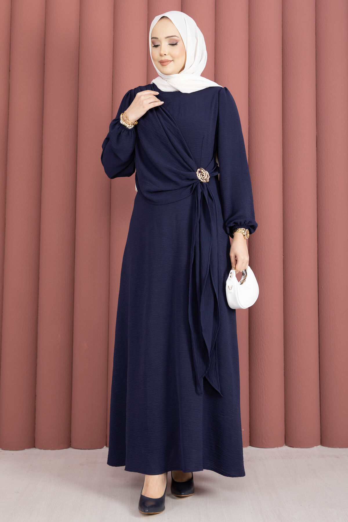 Omuzdan Allerli Yandan Bağlamalı Tesettür Elbise Lacivert