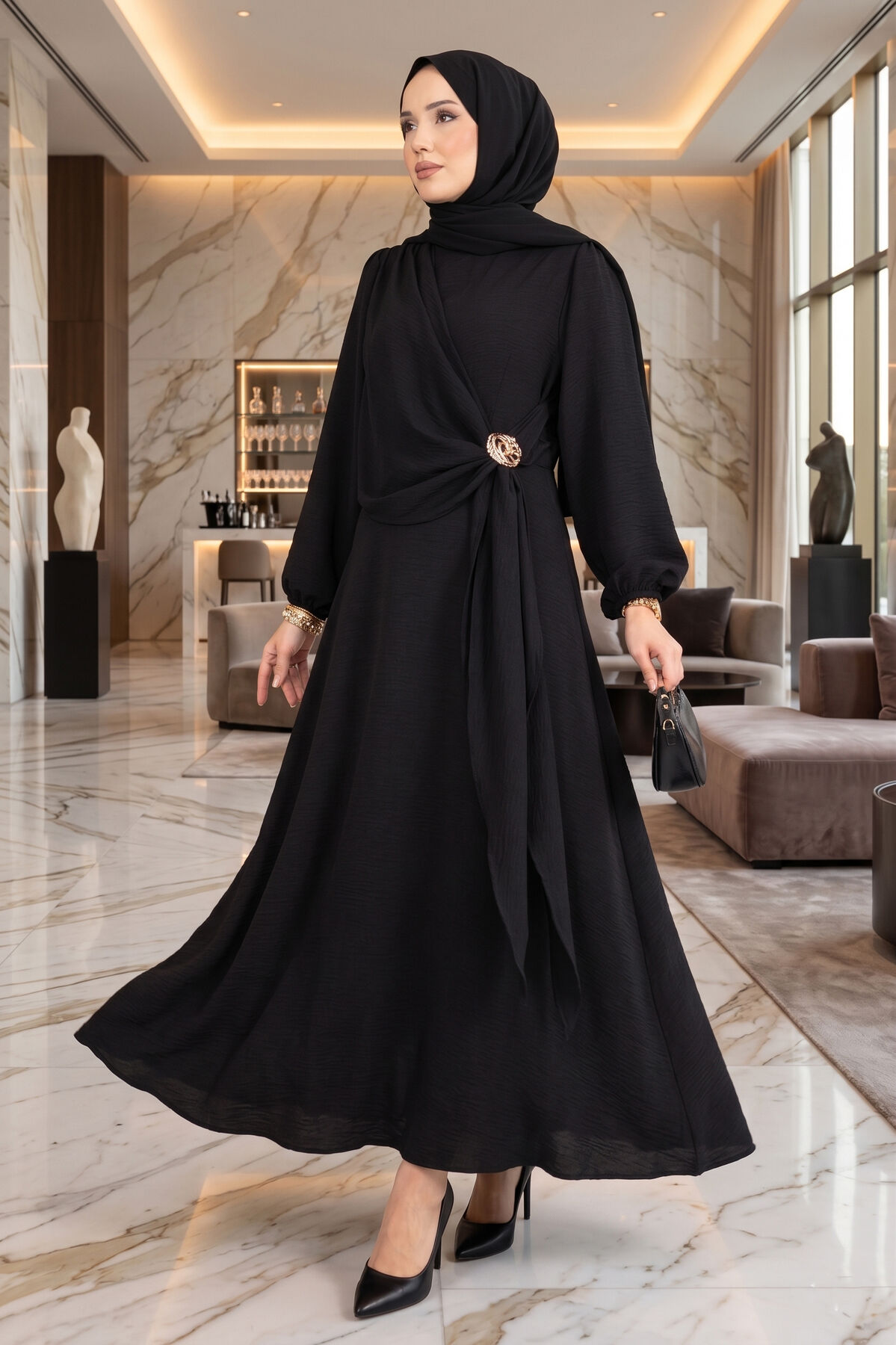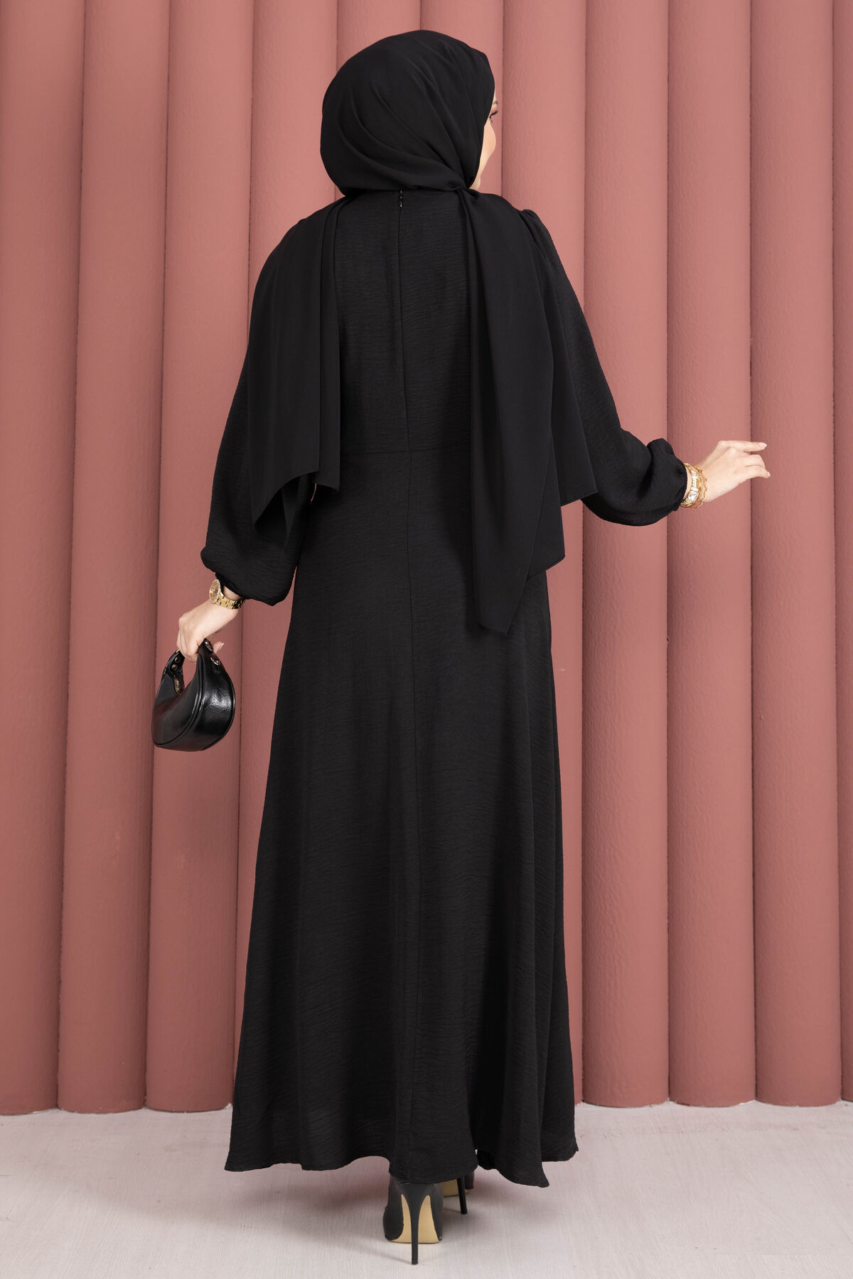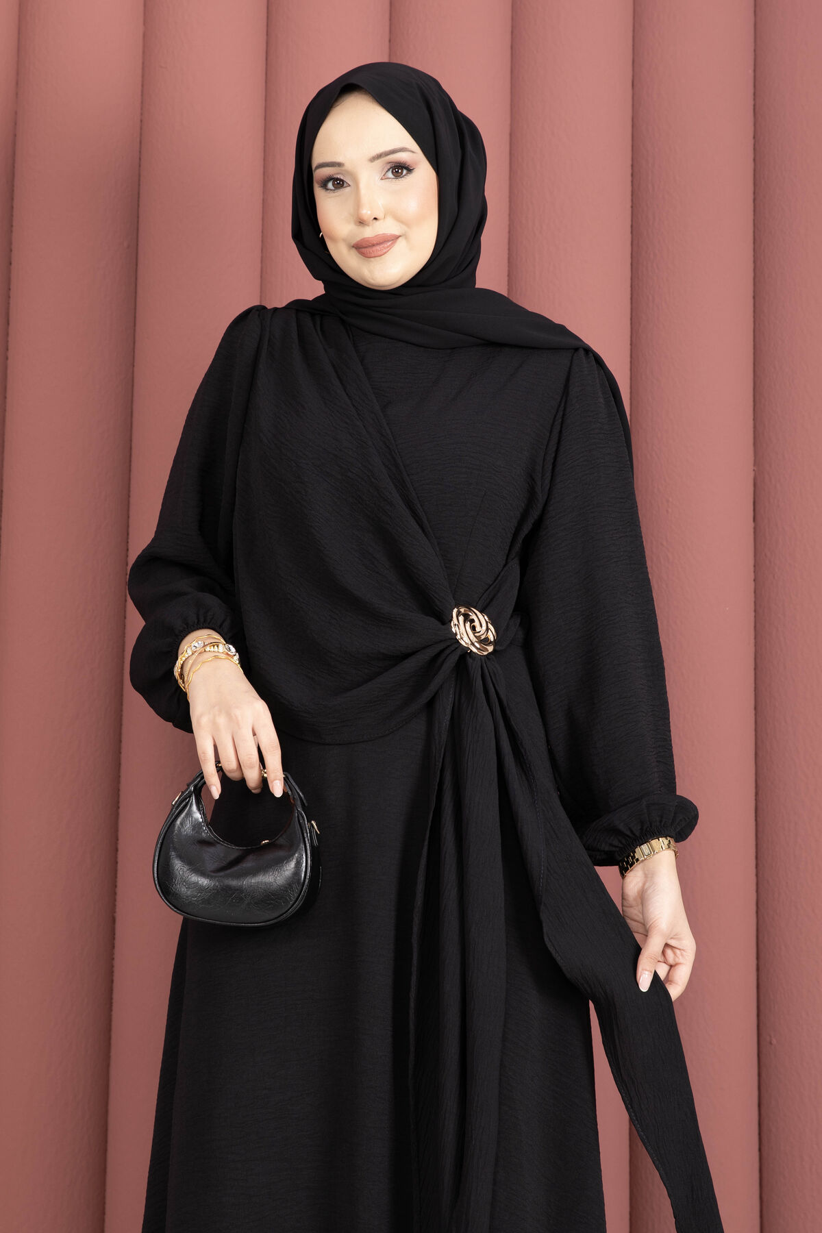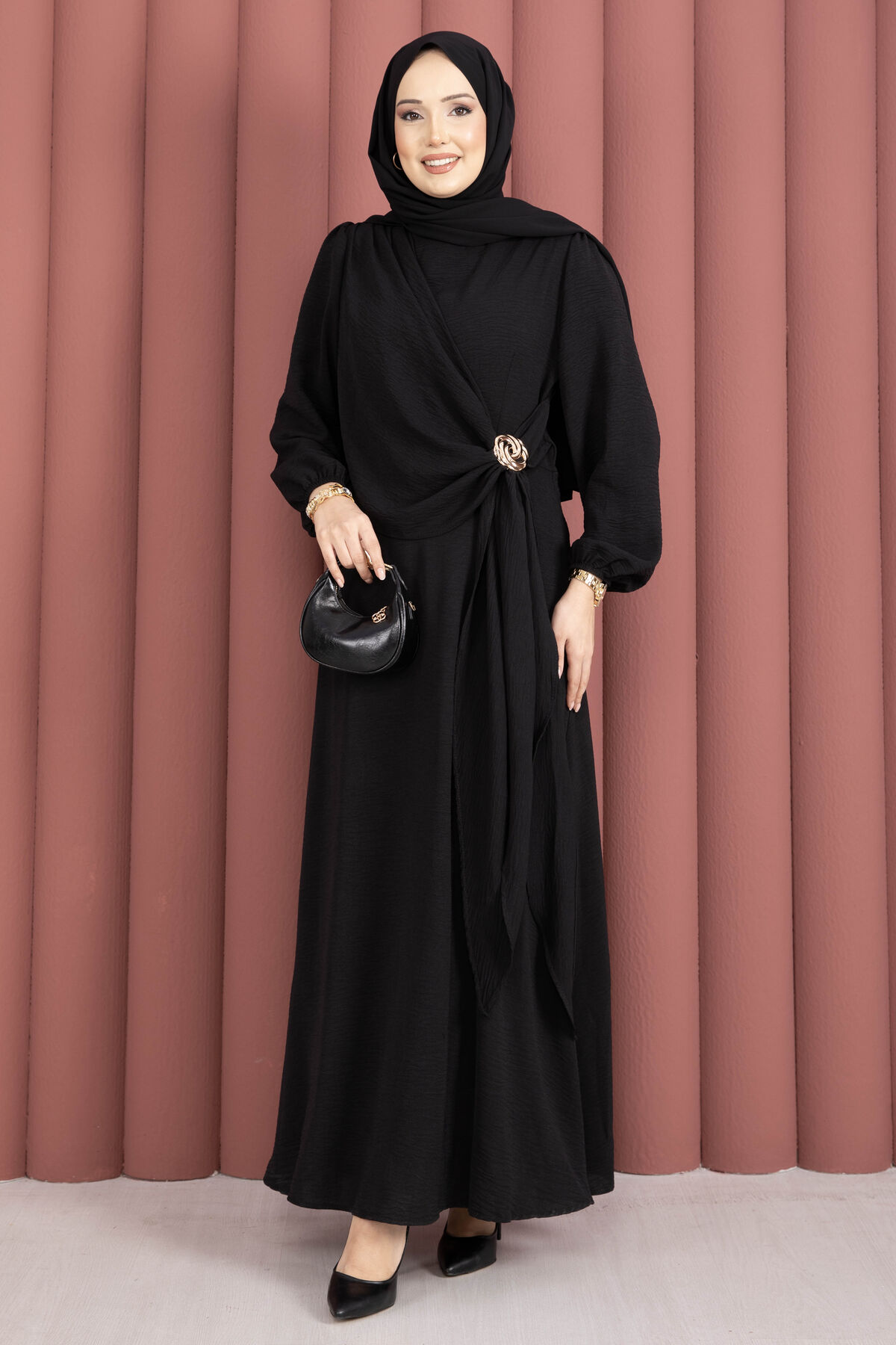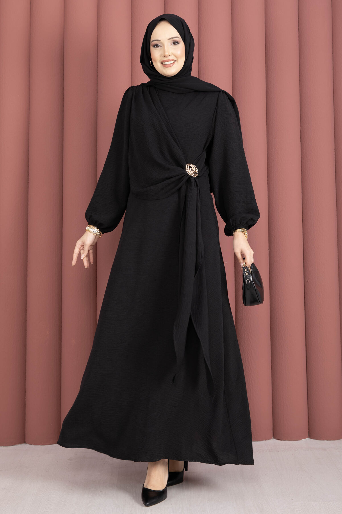 Omuzdan Allerli Yandan Bağlamalı Tesettür Elbise Siyah