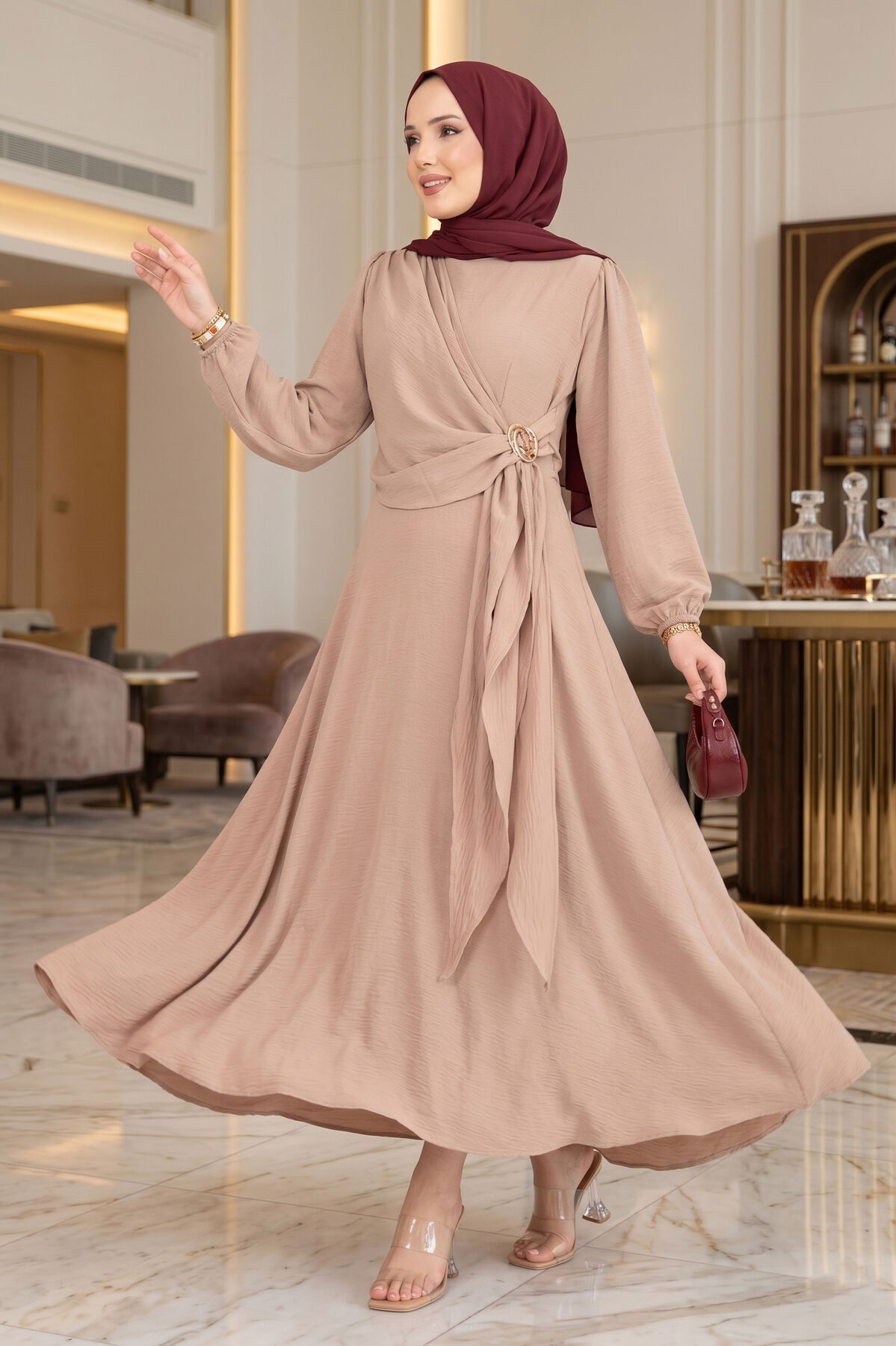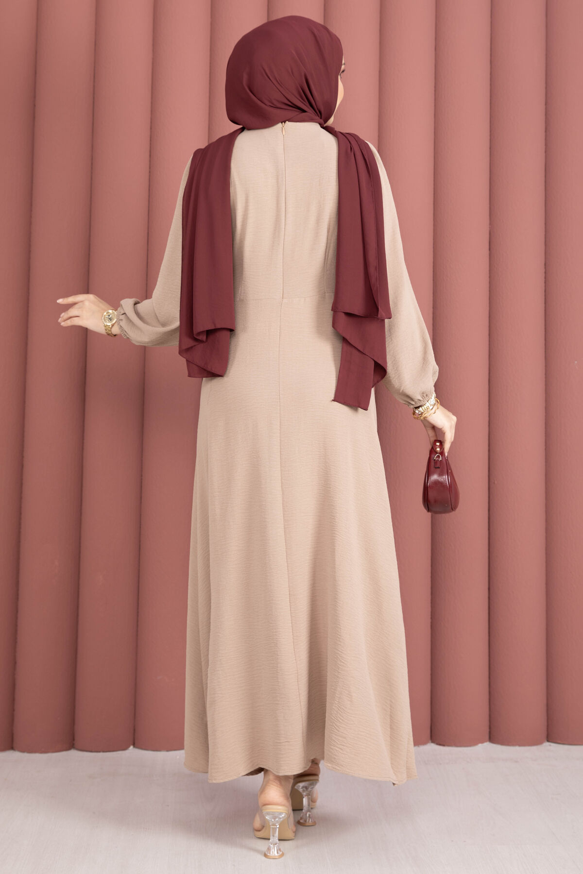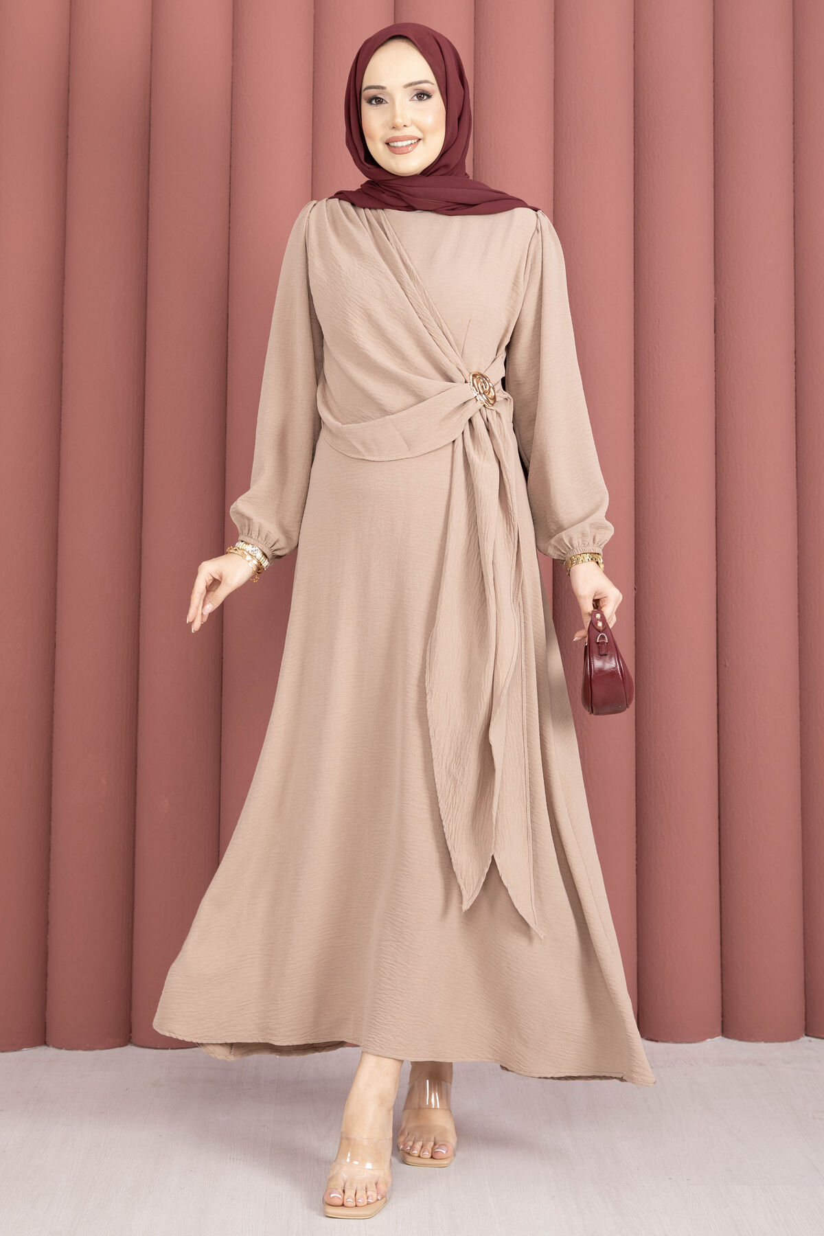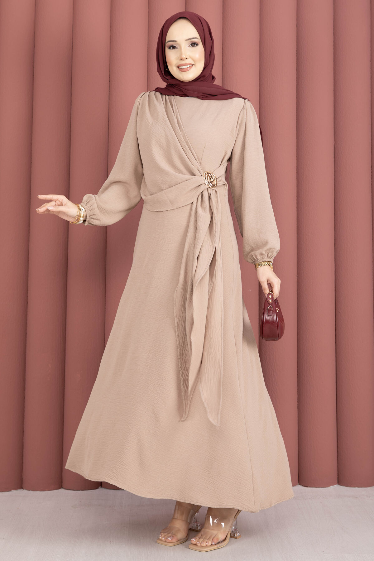 Omuzdan Allerli Yandan Bağlamalı Tesettür Elbise Vizon