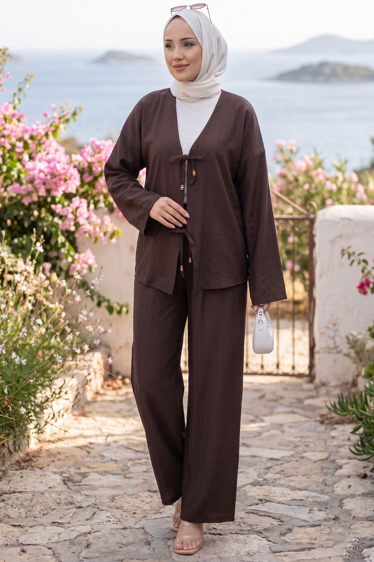 Önden Bağcık Detaylı Pantolonlu İkili Takım Kahve