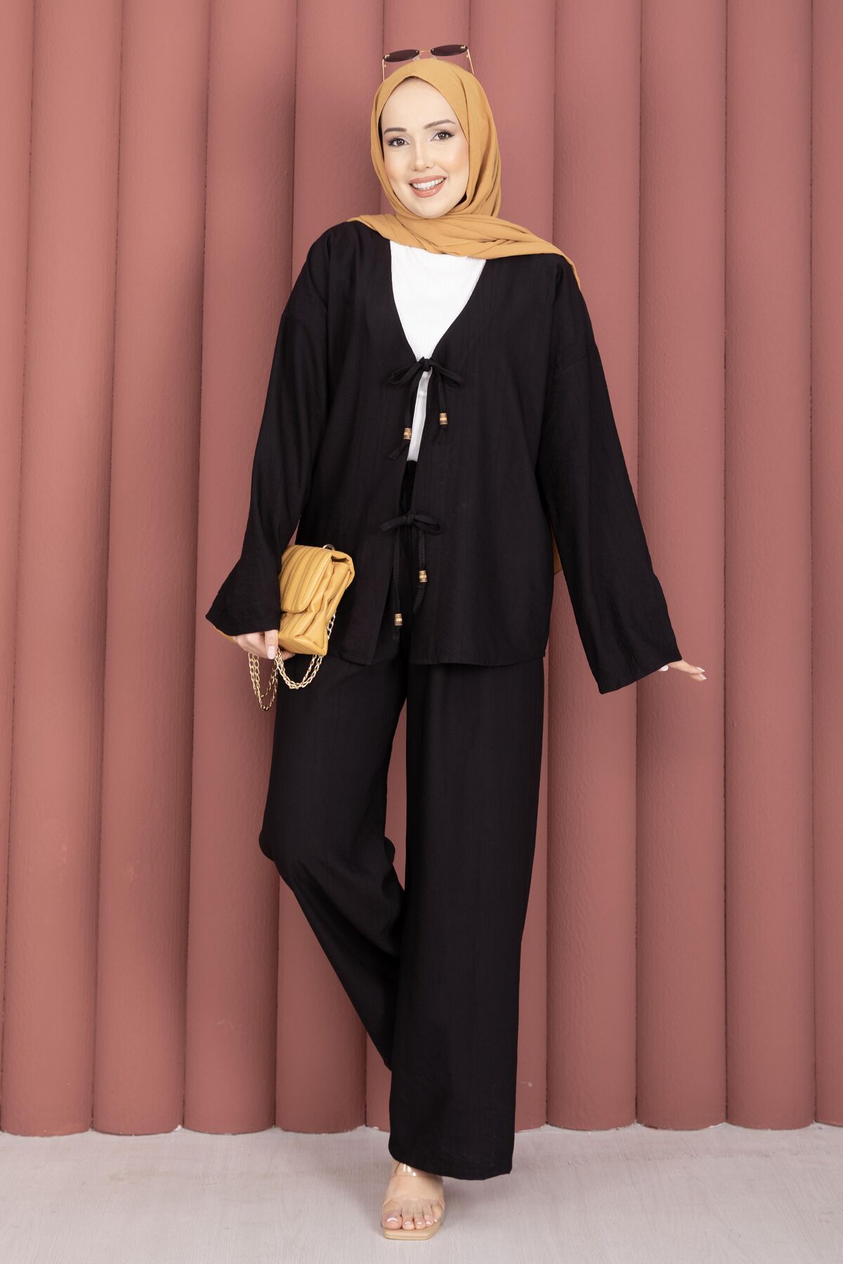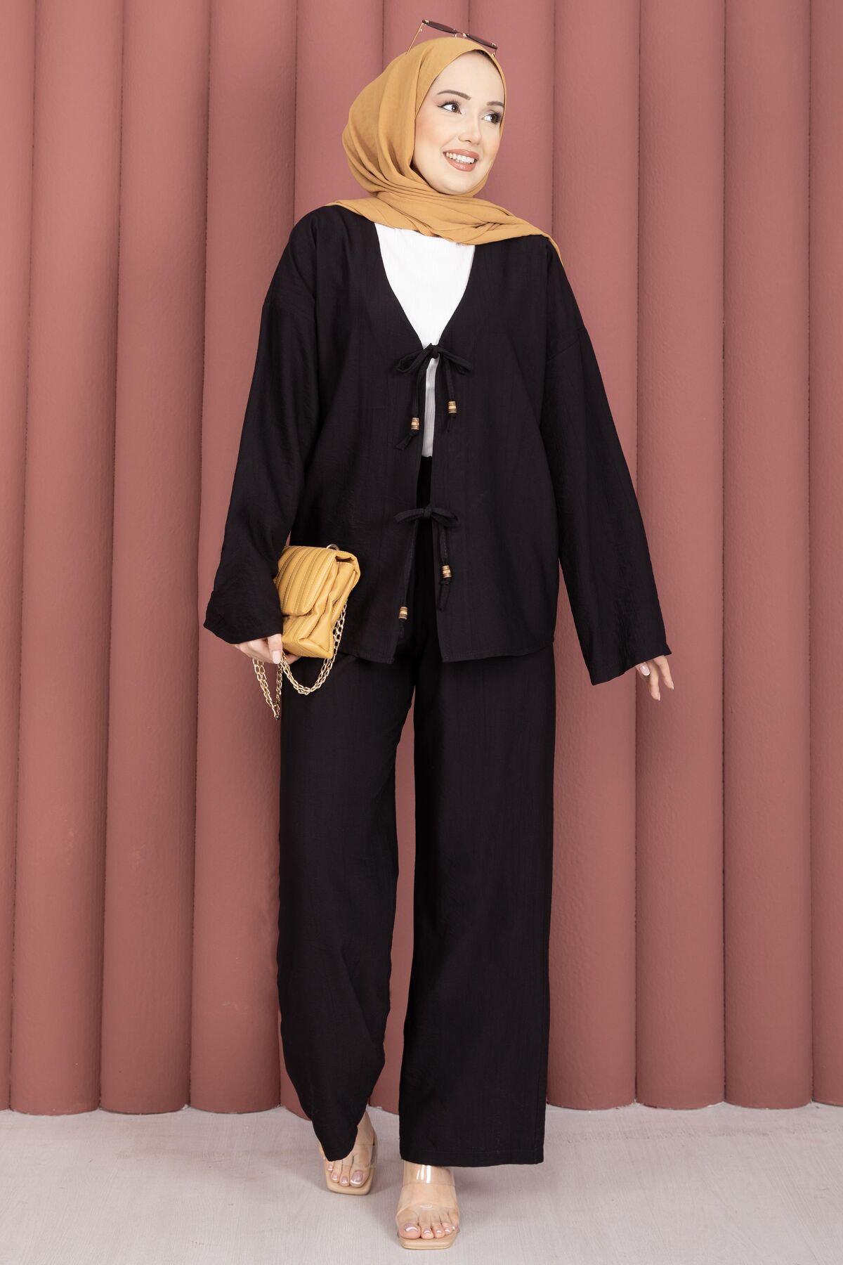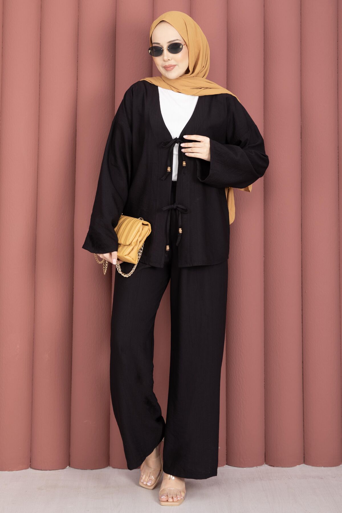 Önden Bağcık Detaylı Pantolonlu İkili Takım Siyah Yorumları
