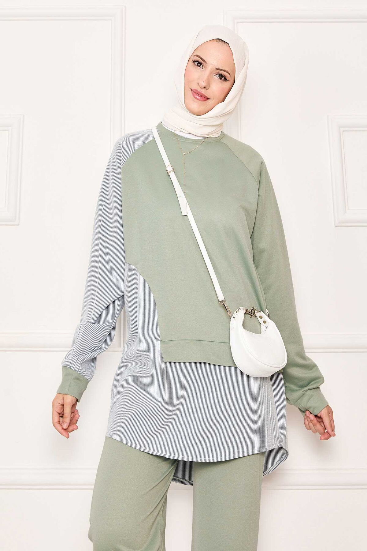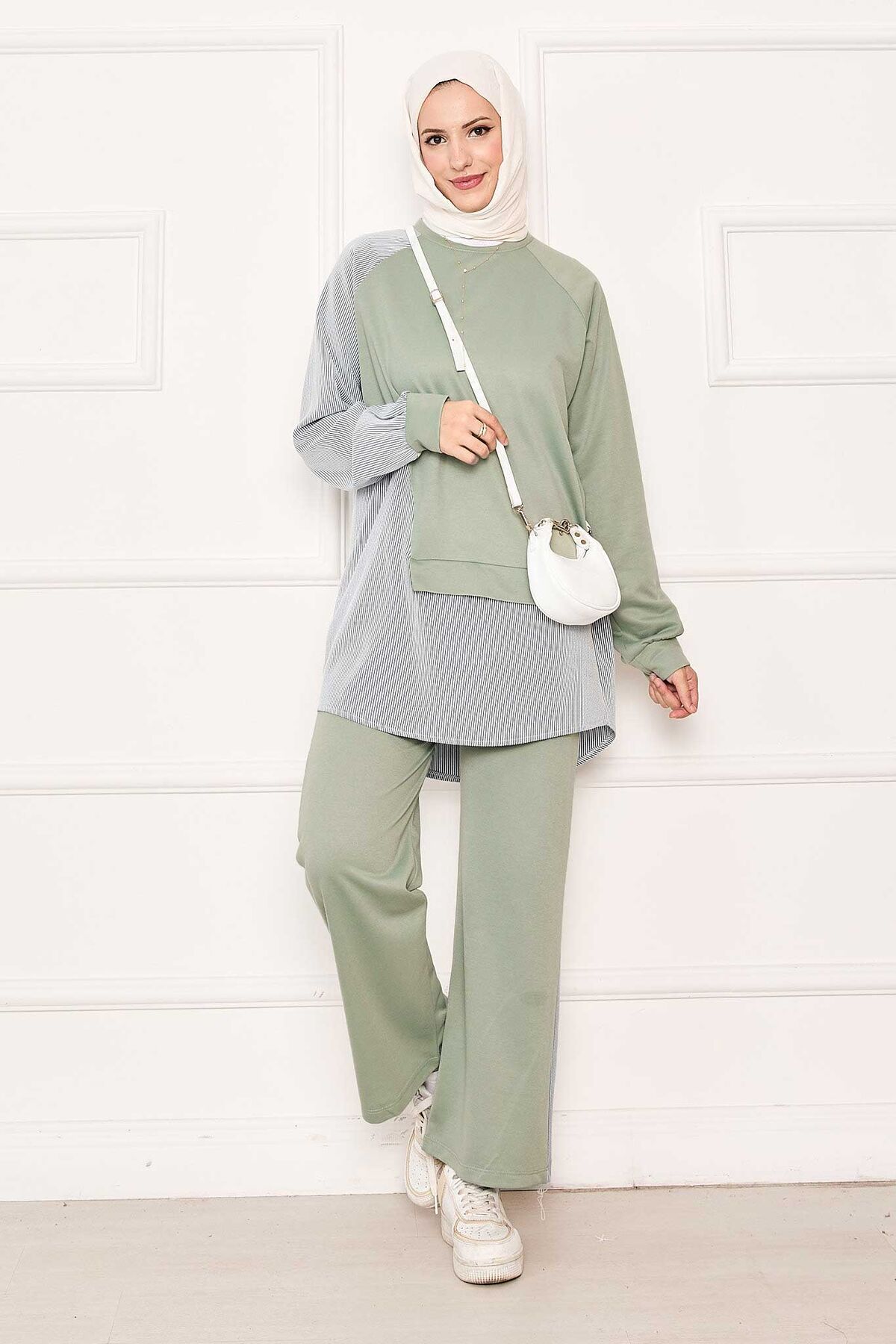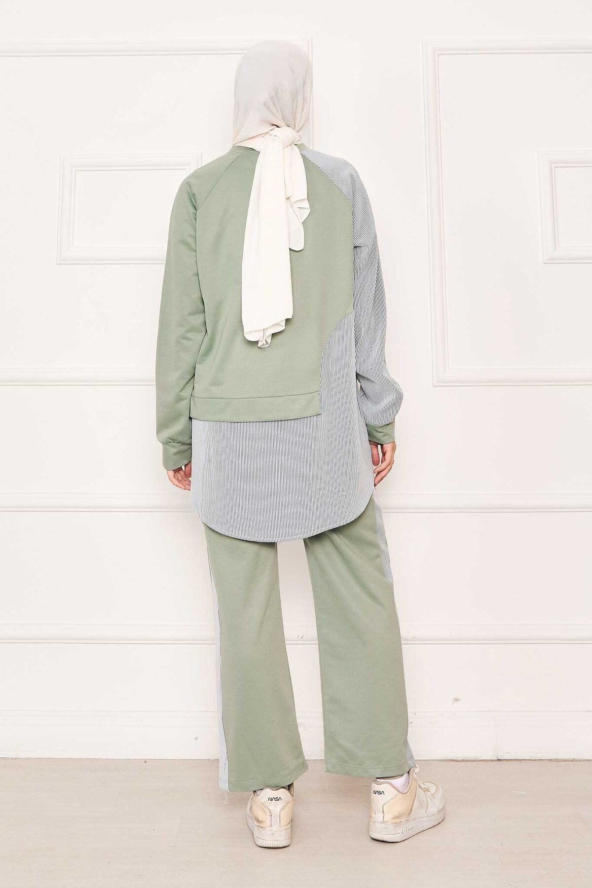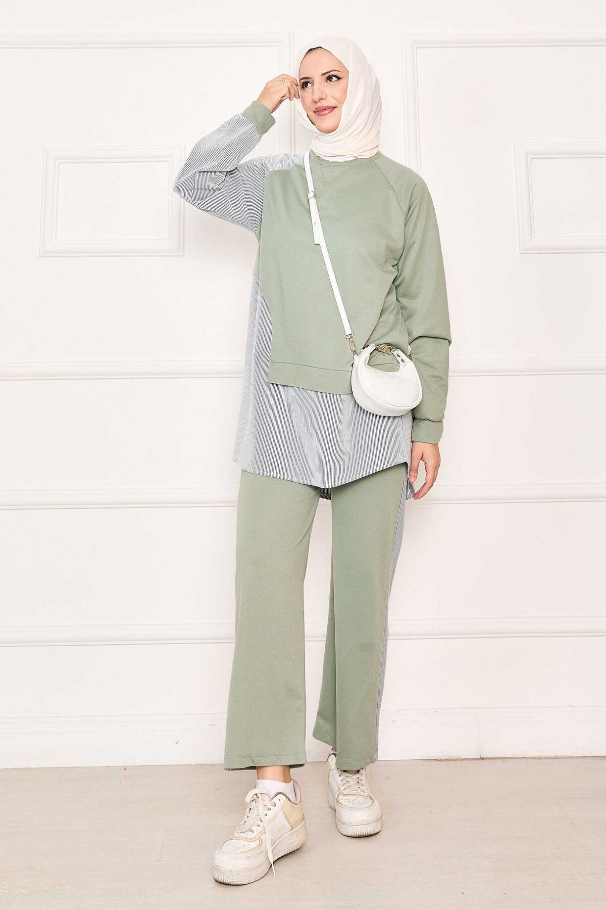 - Ürün mevsimliktir. Tunik pantolon olmak üzere iki parçadan oluşmaktadır. Çizgi detaylı asimetrik bir tasarımı mevcut çizgili garni detaylı spor kombin, pantolon belden lastiklidir. İç göstermez.