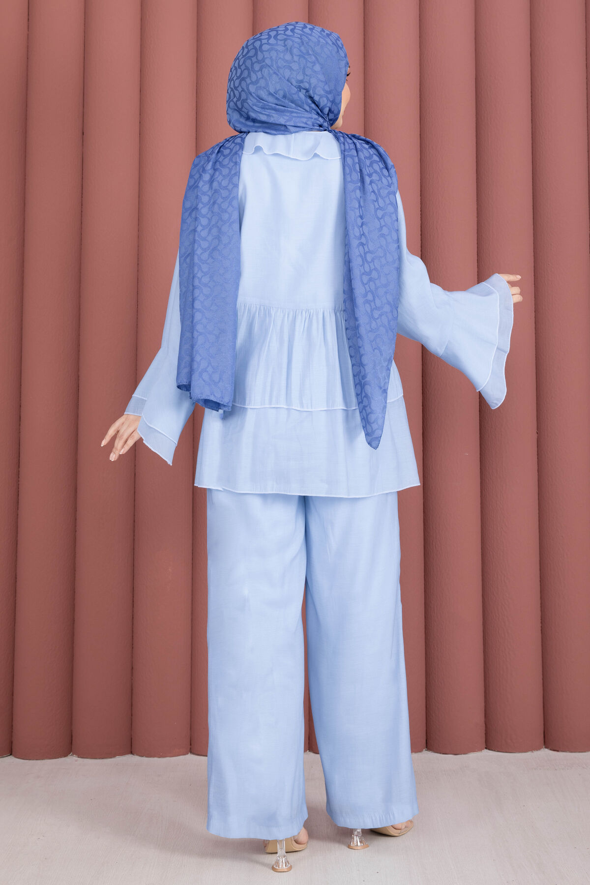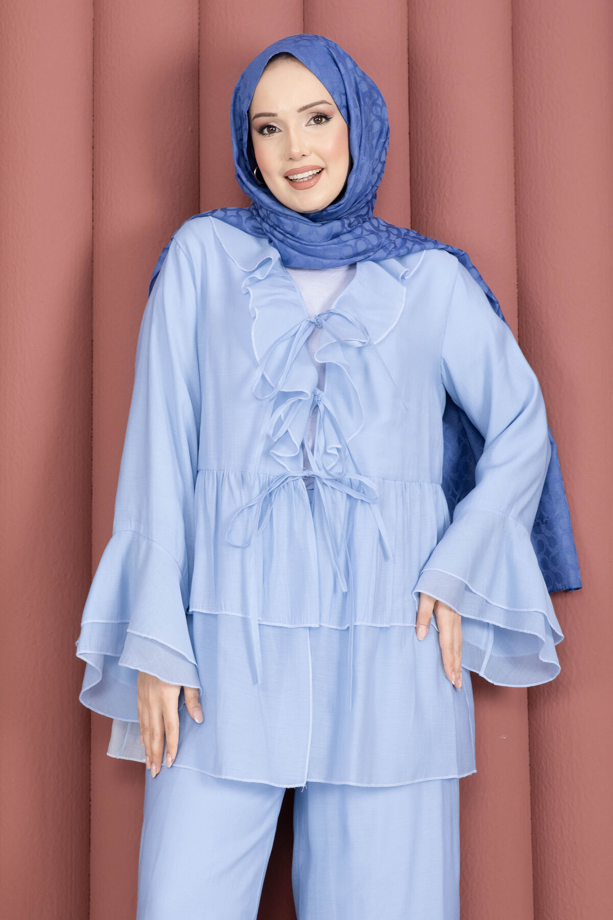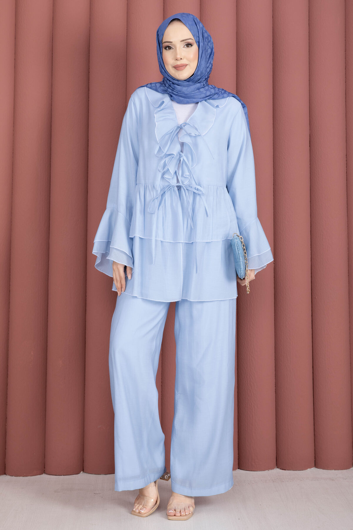 Önü Bağcık Detaylı Kolları Volanlı Kimono İkili Takım Bebe Mavisi