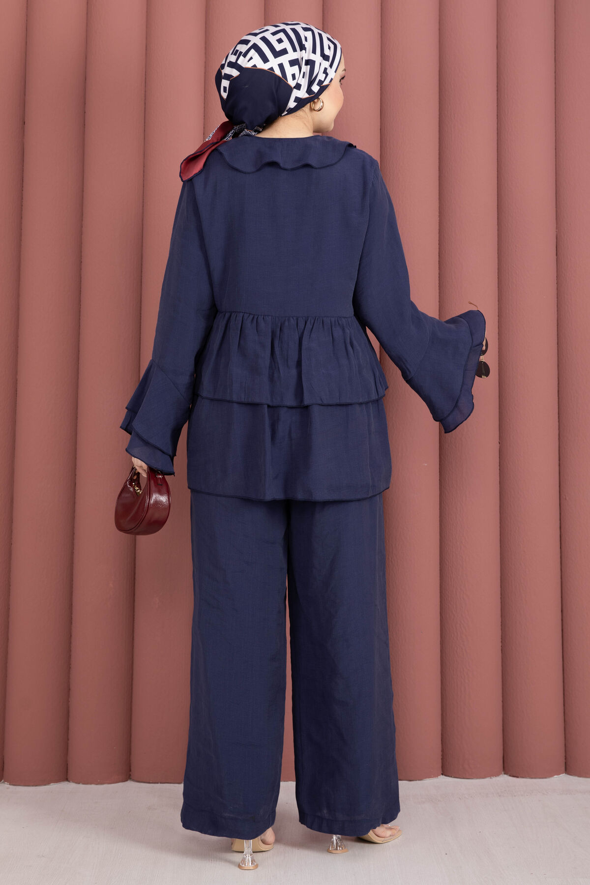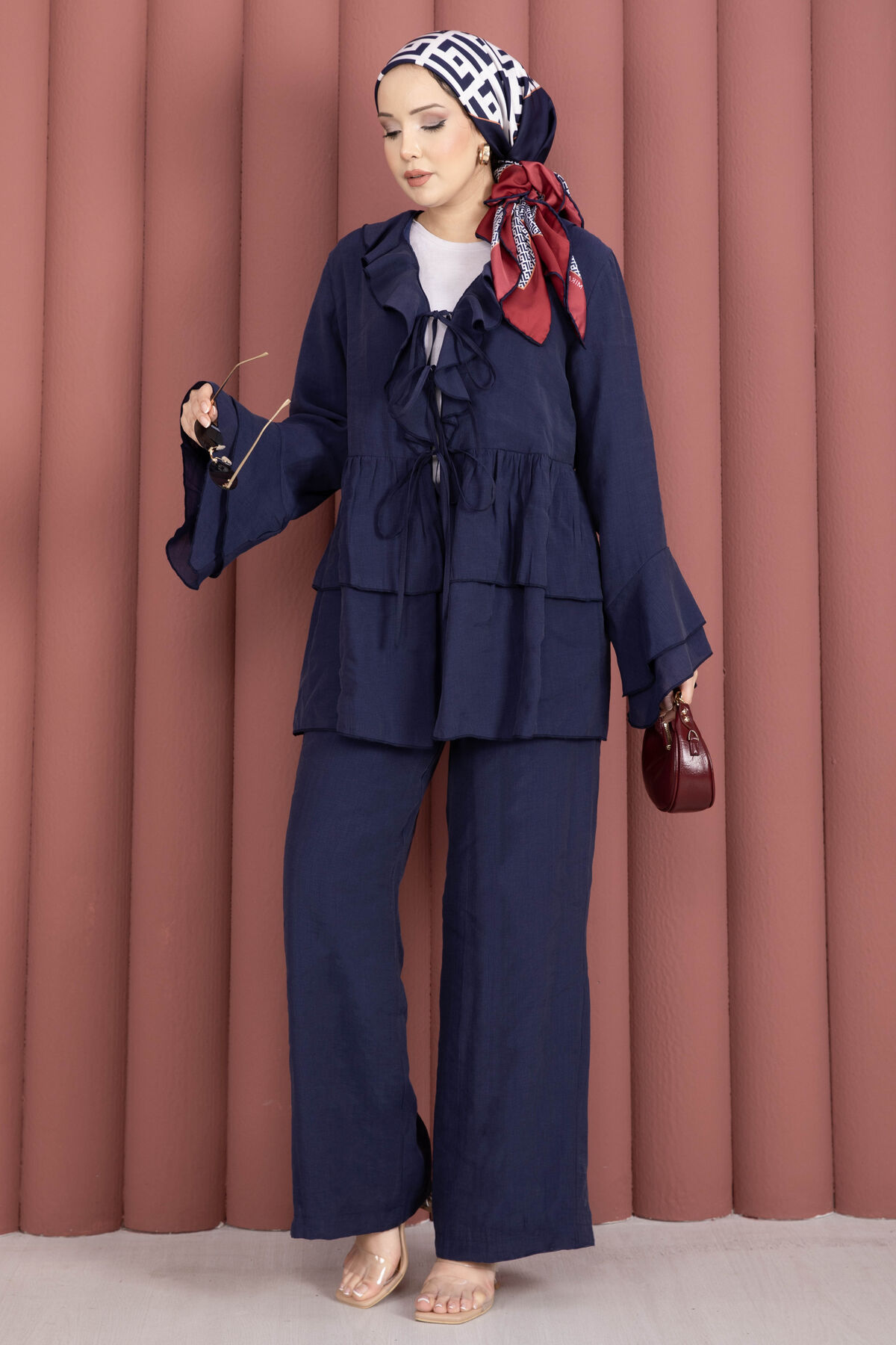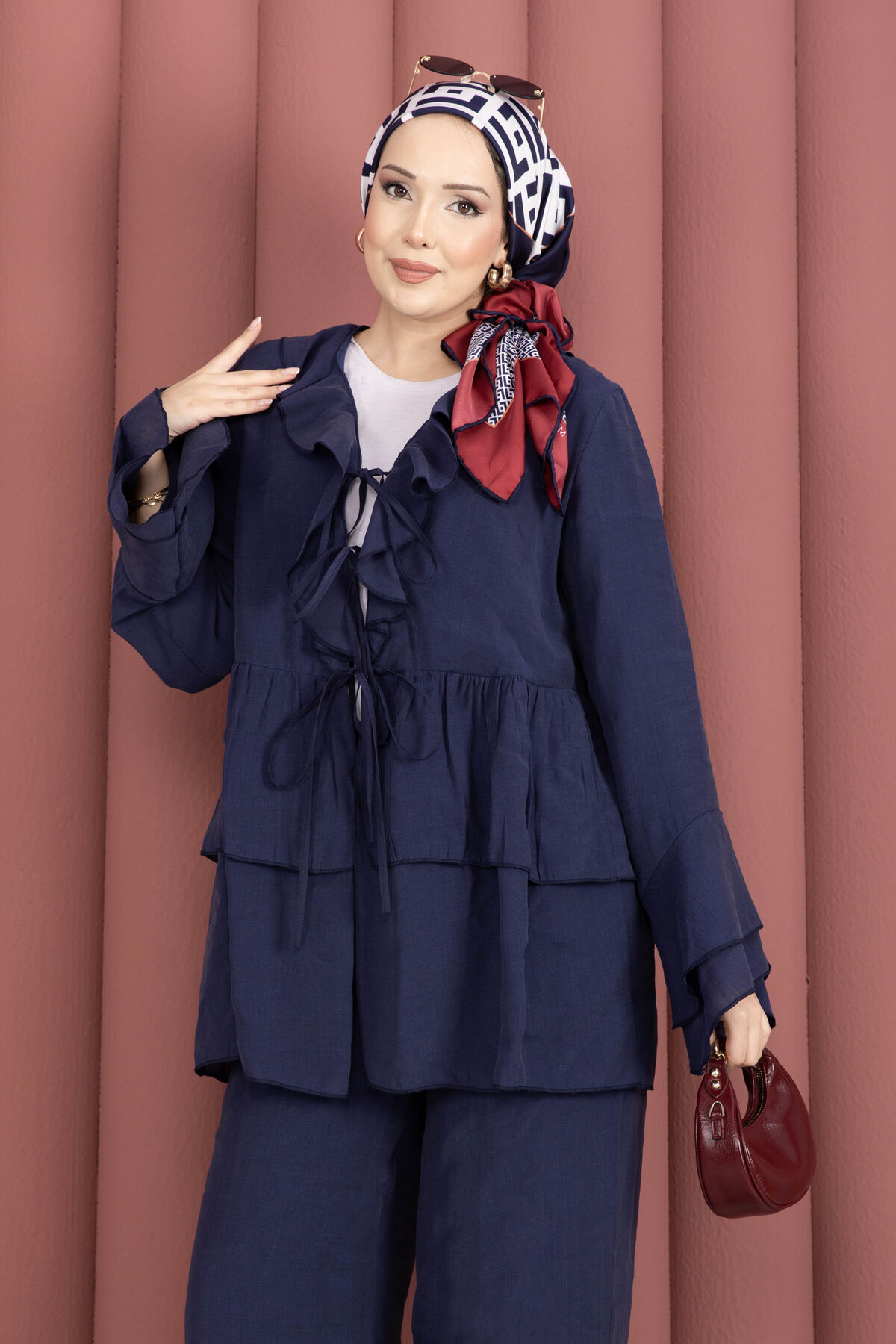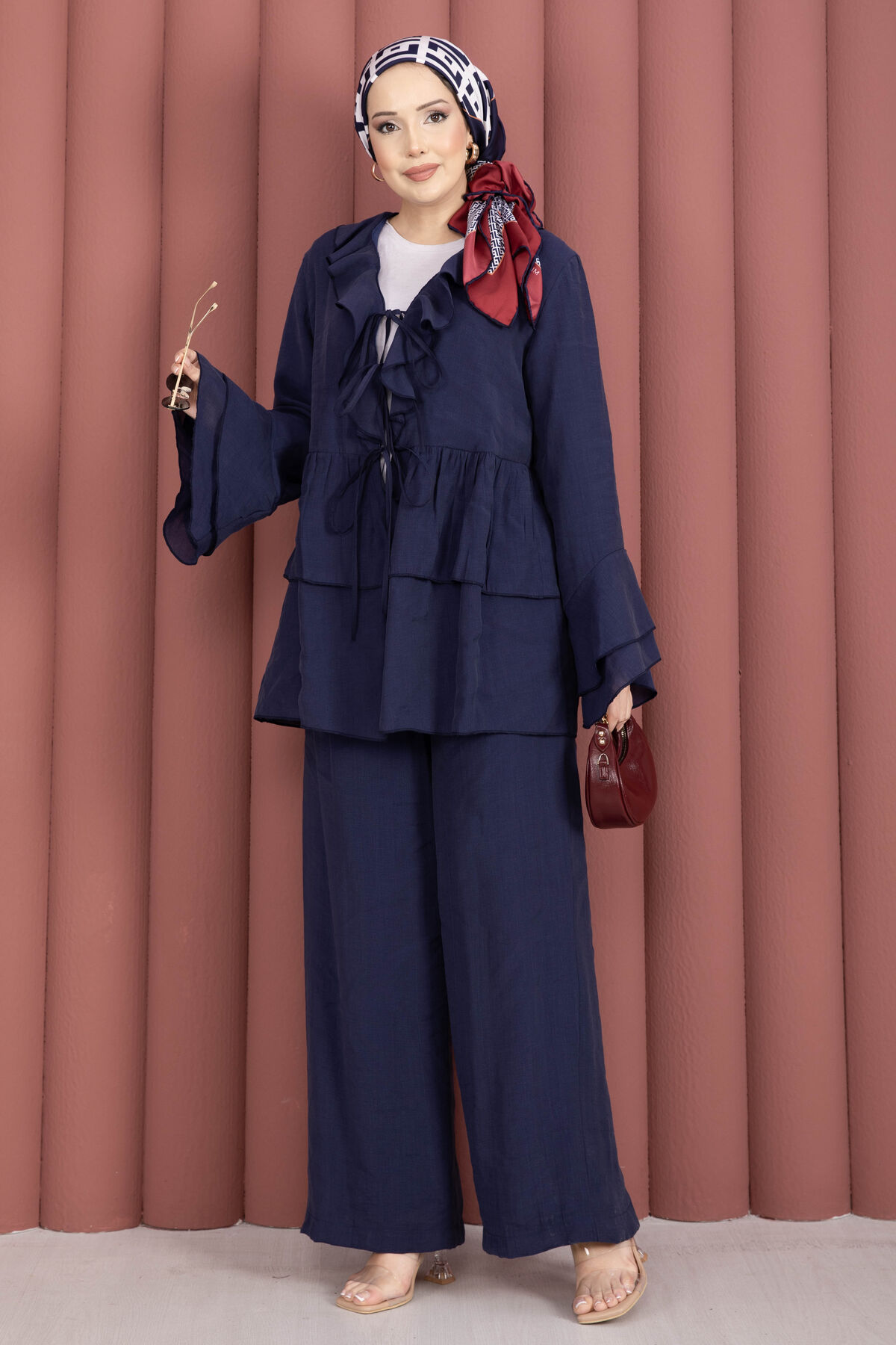 Önü Bağcık Detaylı Kolları Volanlı Kimono İkili Takım Lacivert Yorumları