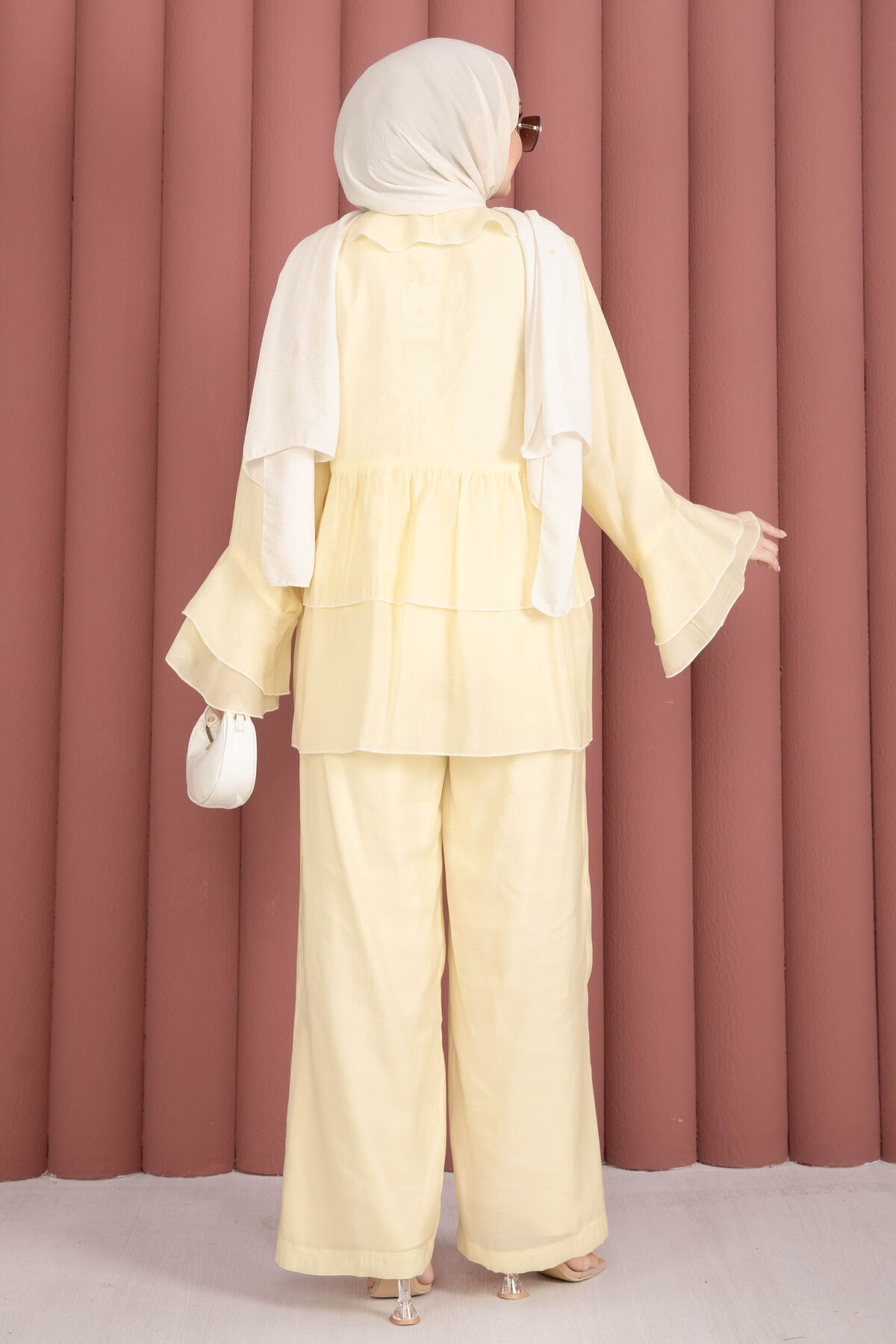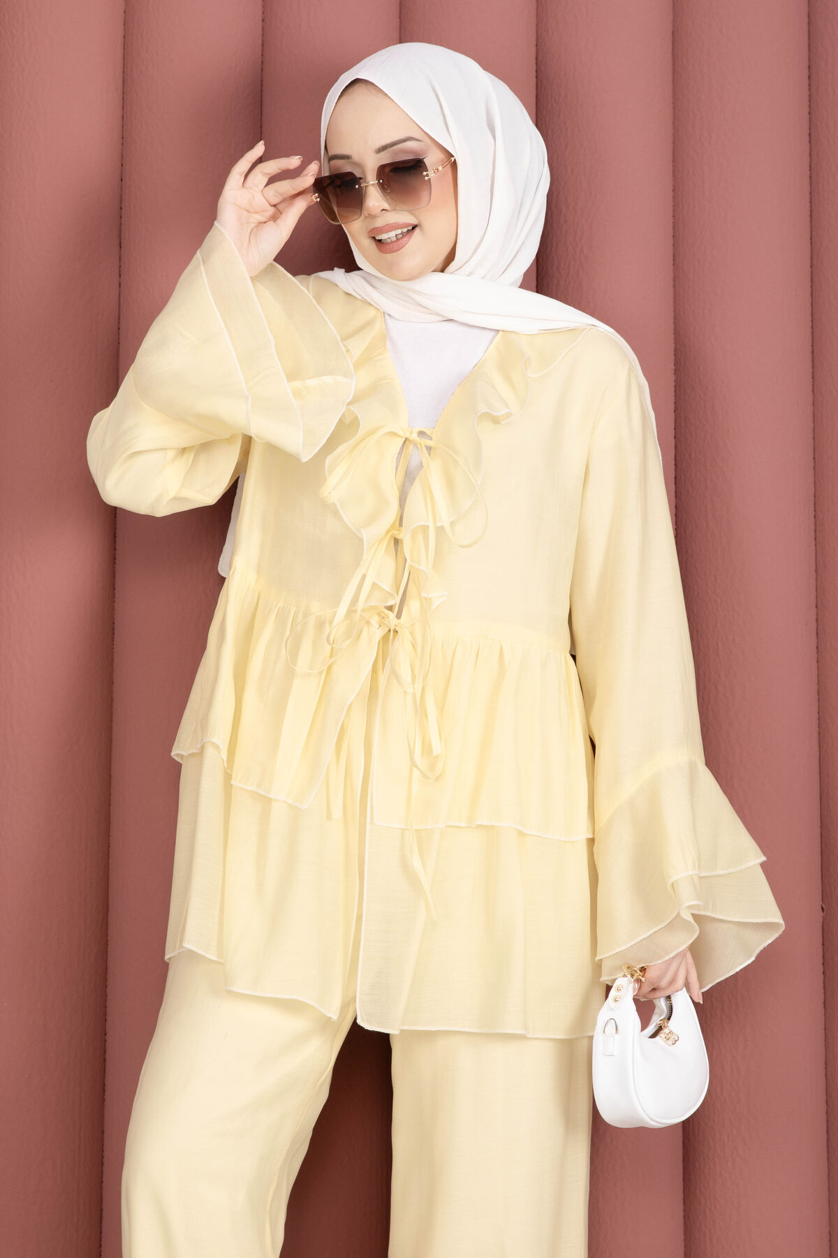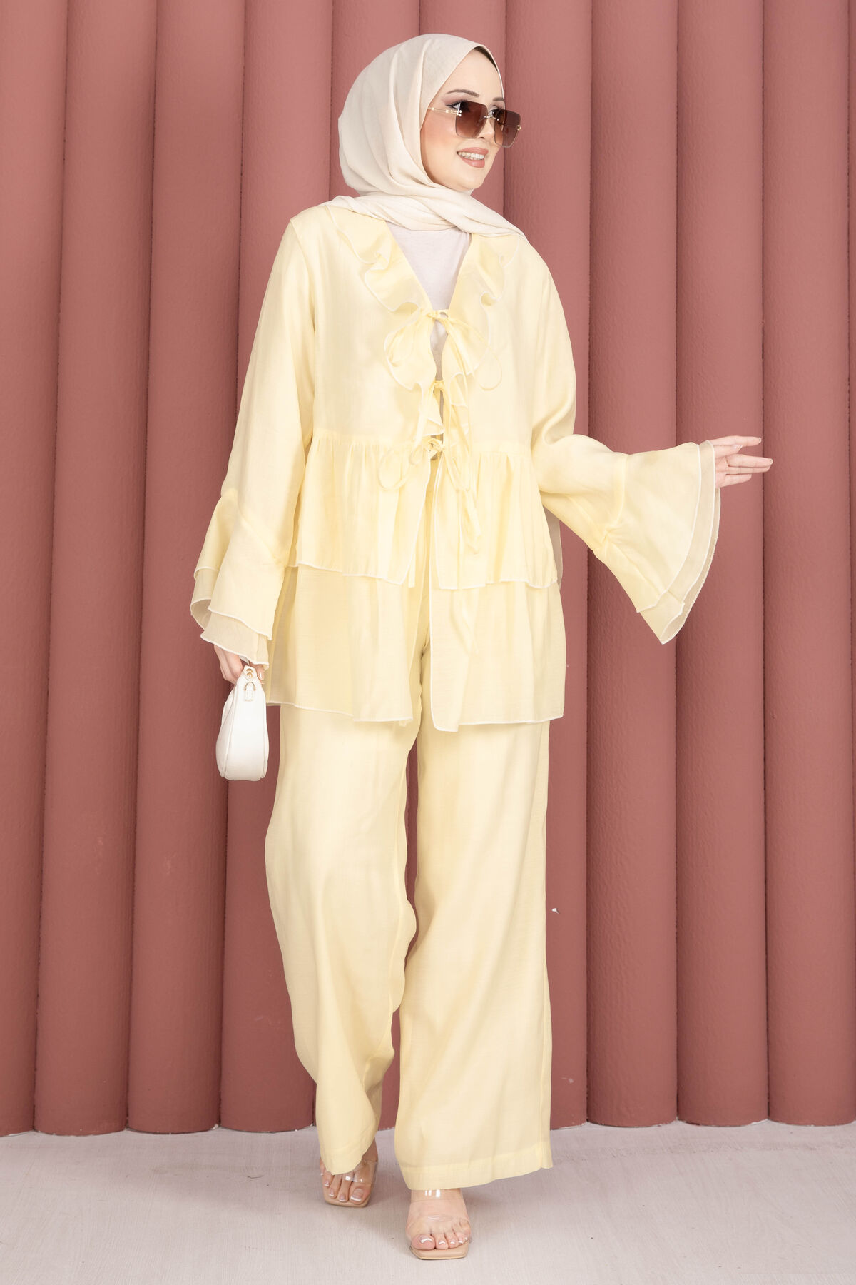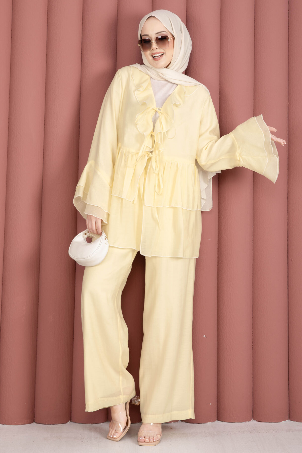 Önü Bağcık Detaylı Kolları Volanlı Kimono İkili Takım Sarı