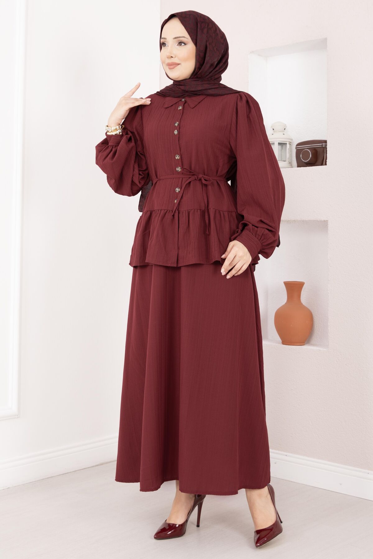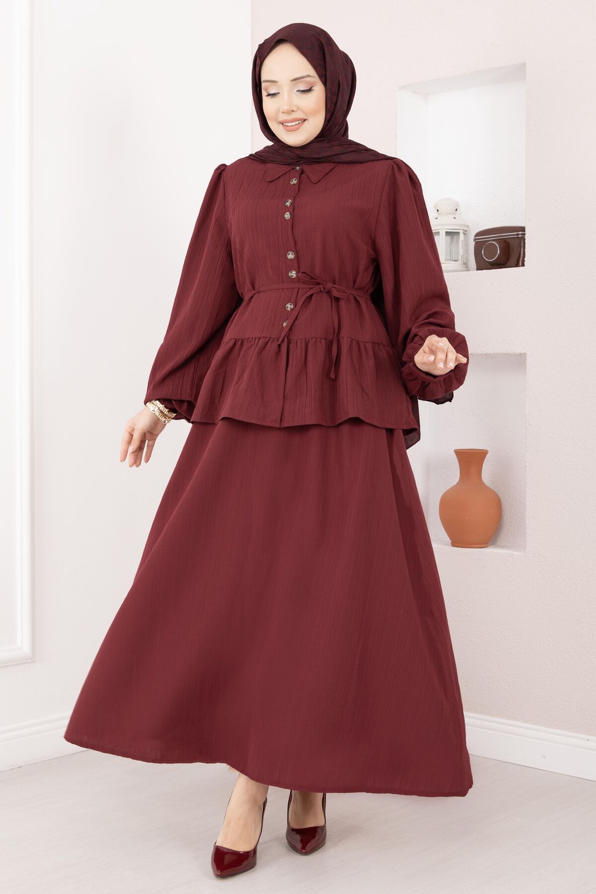 Önü Düğme Detaylı Etekli İkili Takım Bordo