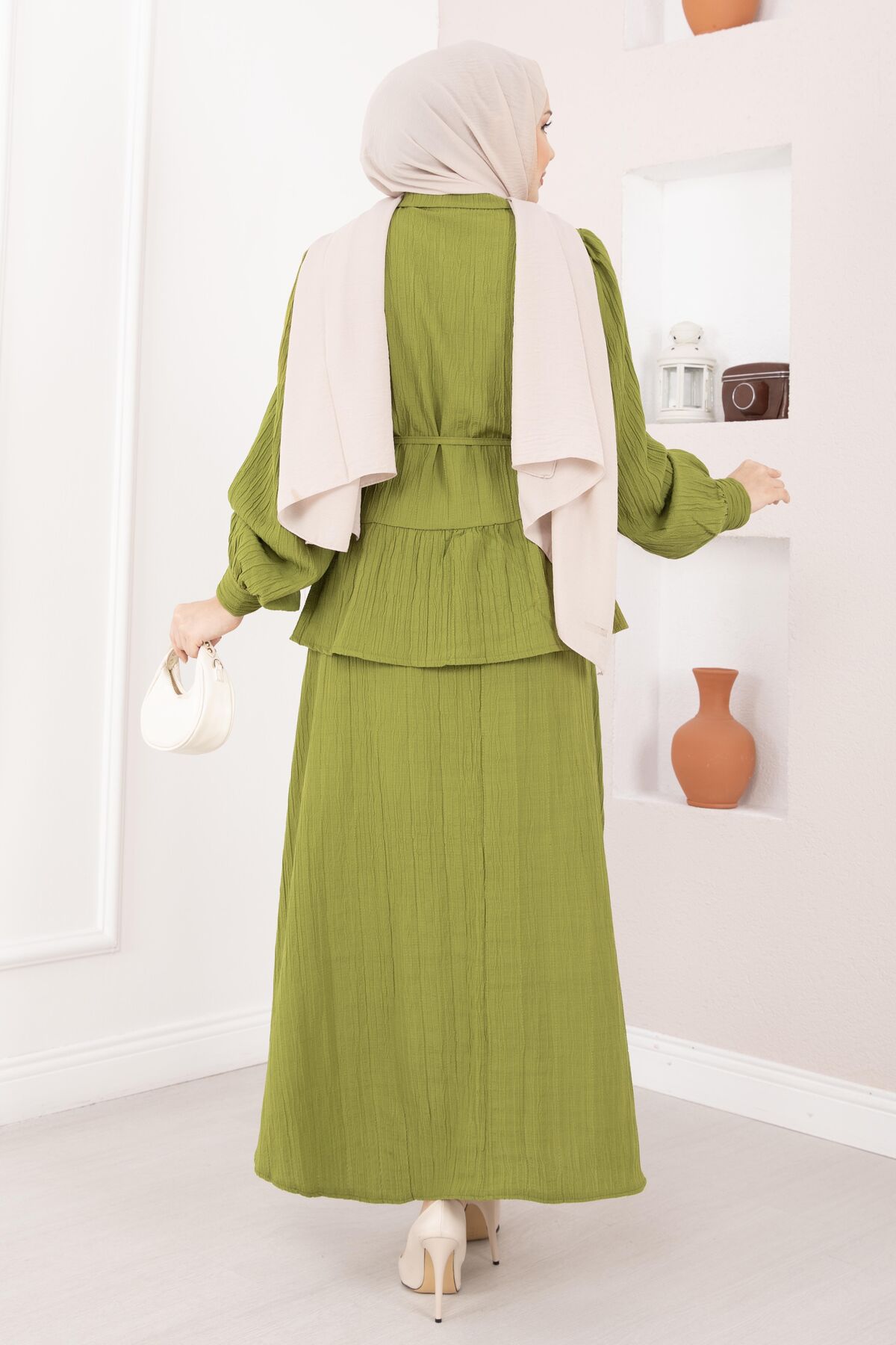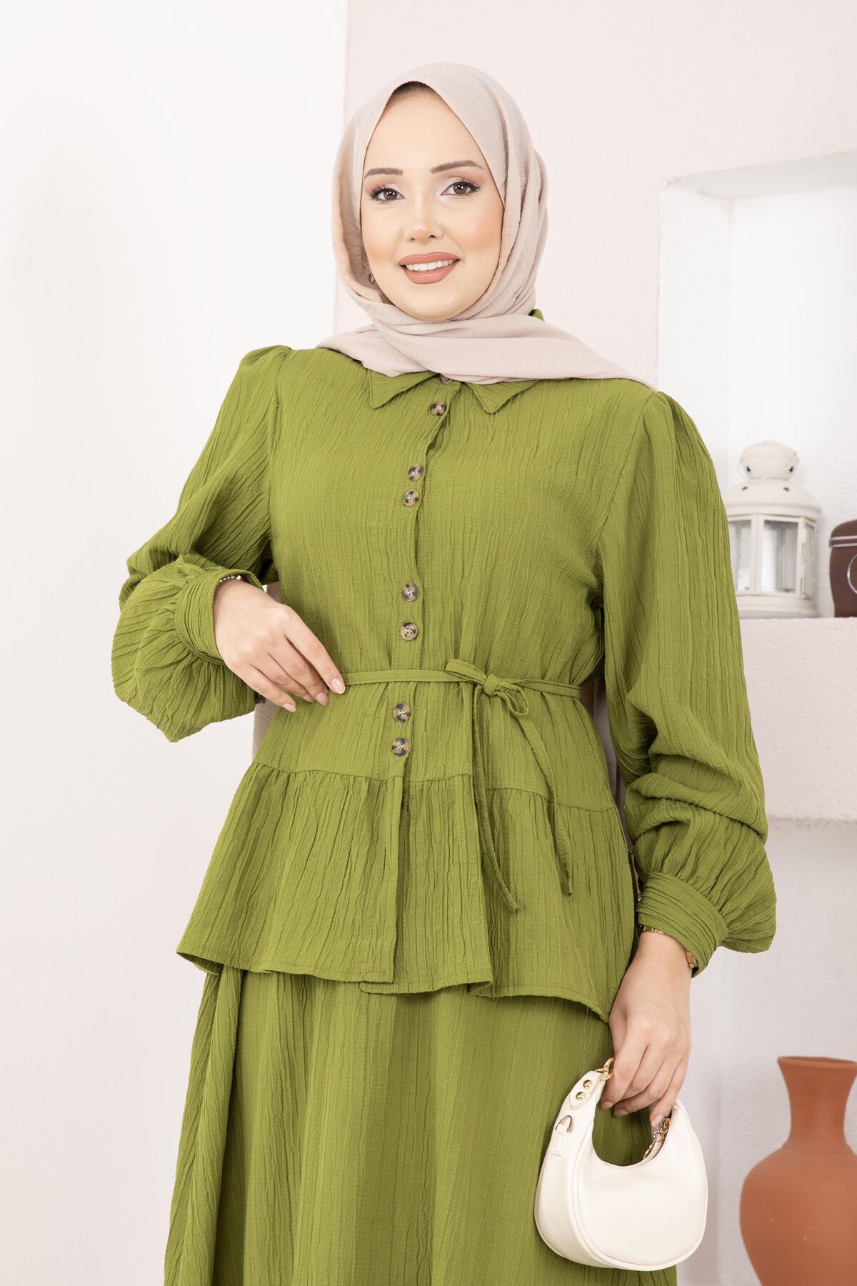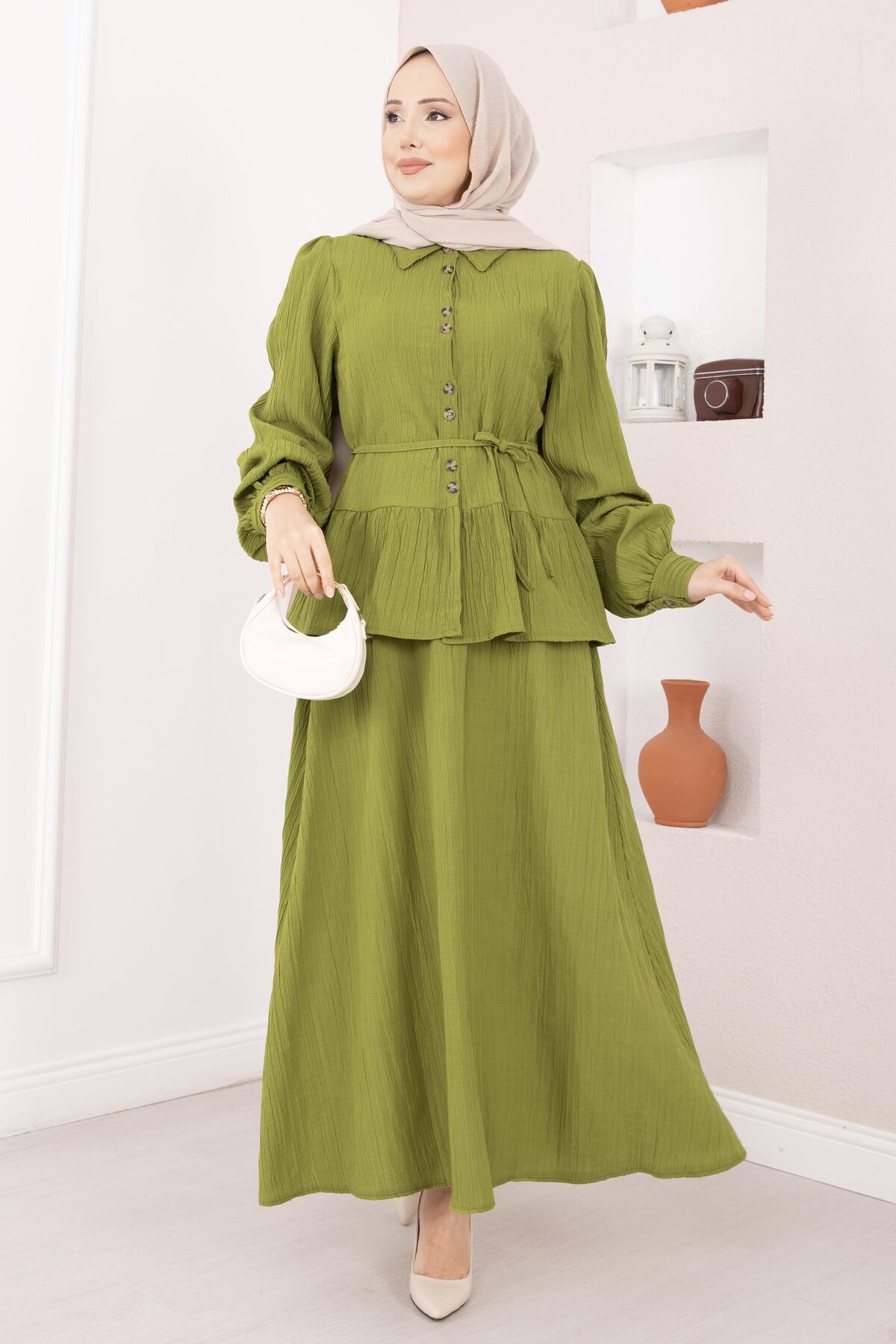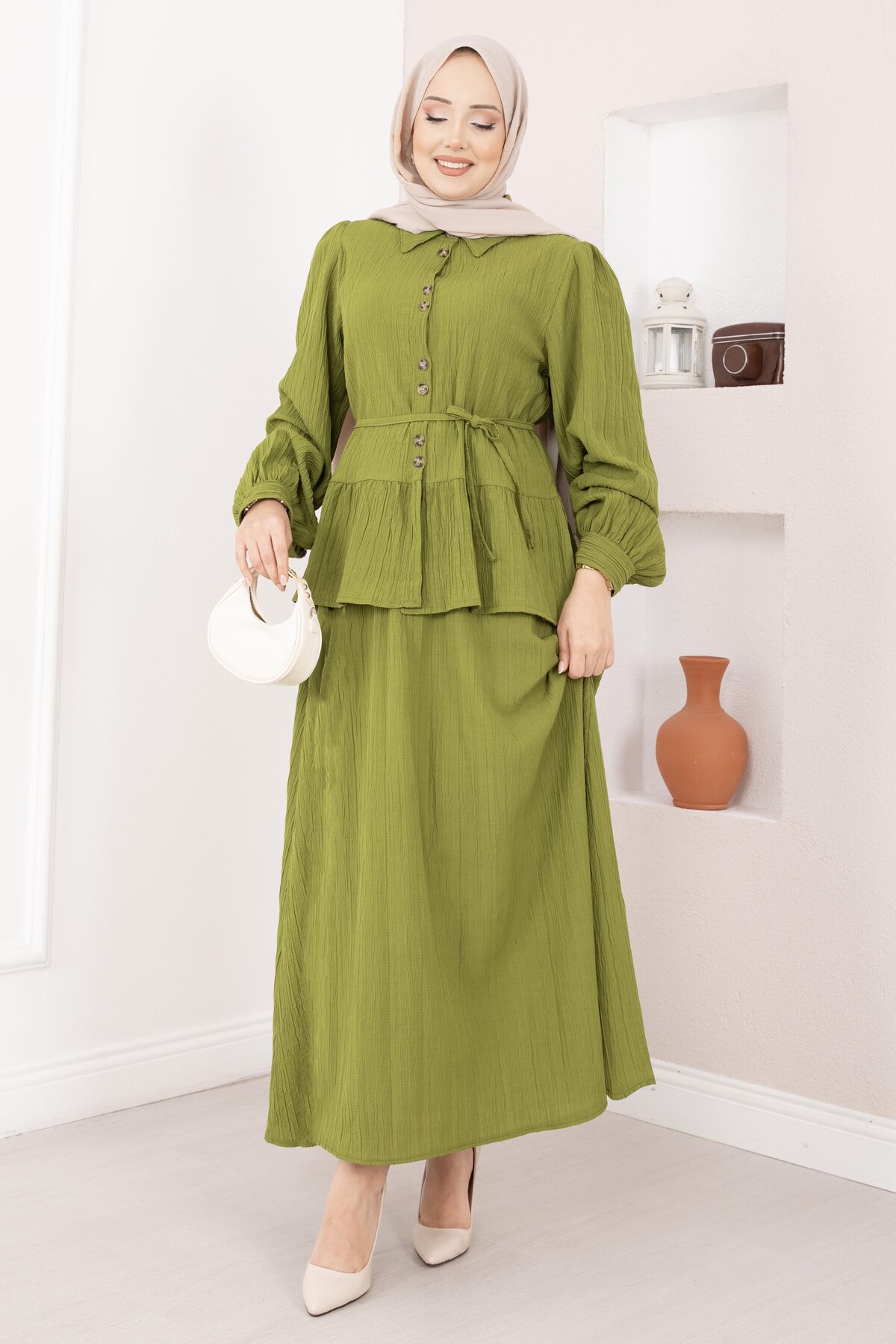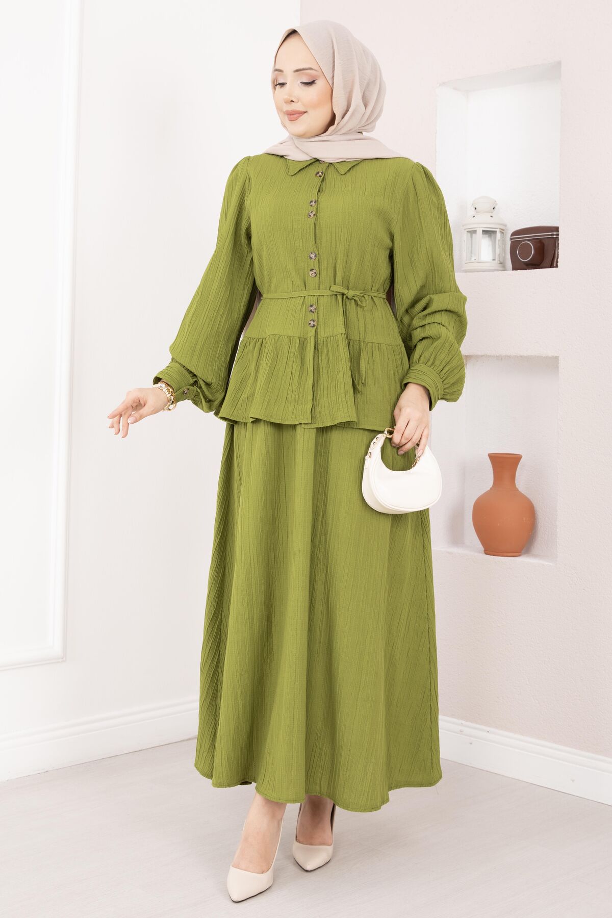 Önü Düğme Detaylı Etekli İkili Takım Yağ Yeşil