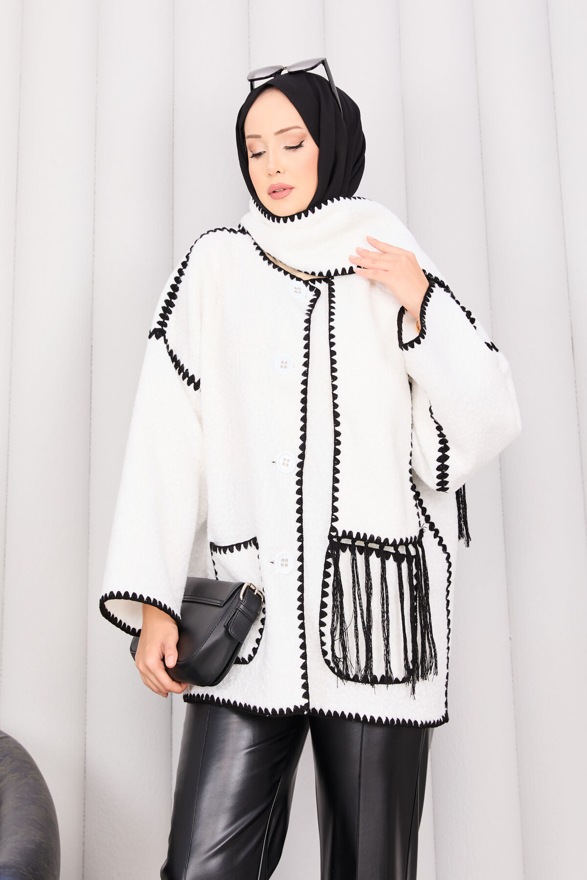 - Ürün Sonbahar & Kış modasıdır. Ürünümüz atkı ve ceket olmak üzere iki parçadan oluşmaktadır.Önü boydan düğmeli çoban dikişli ve çift cep detaylıdır.