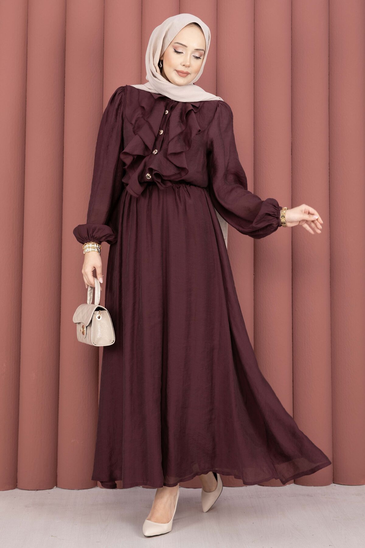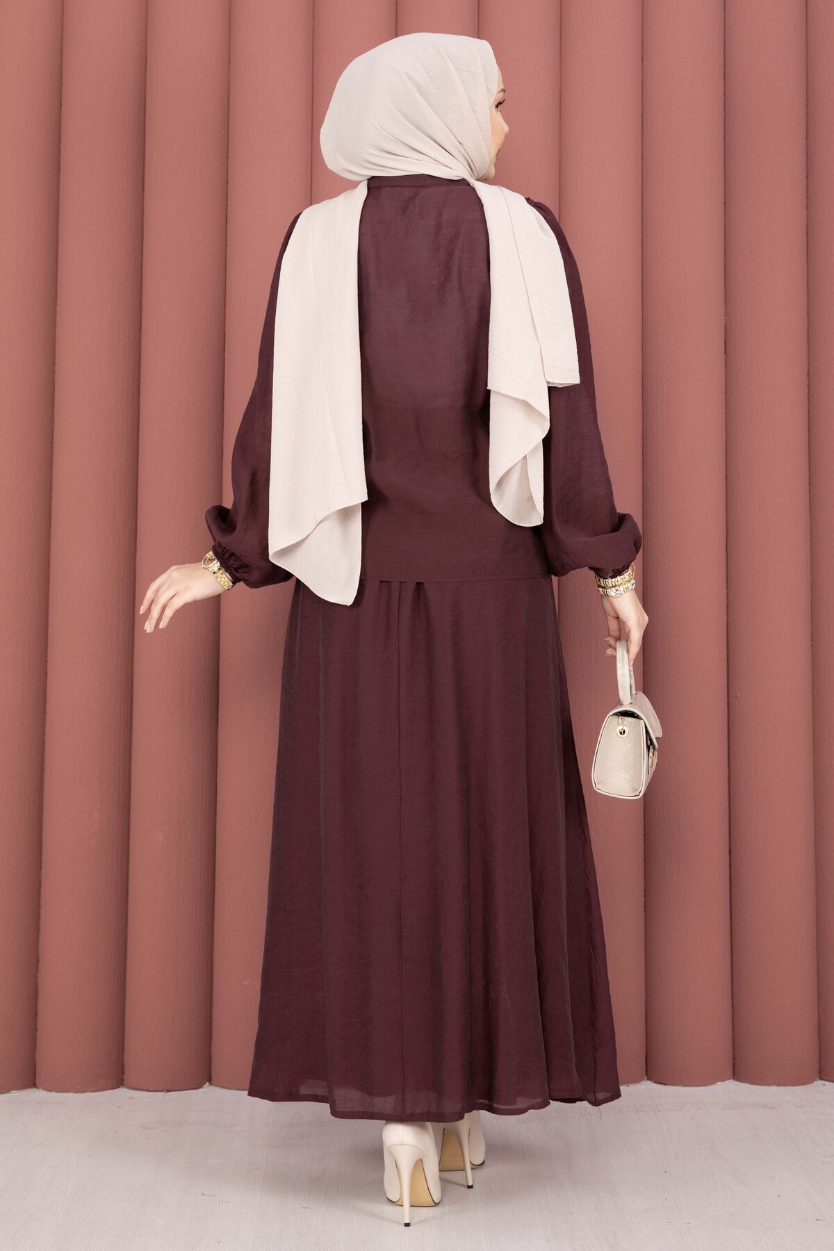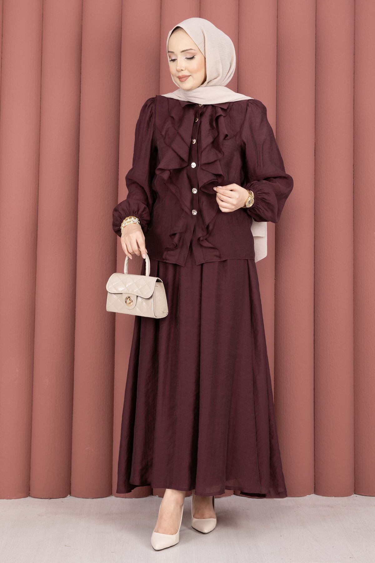 Önü Fırfır Detaylı Etekli Tesettür Takım Mürdüm