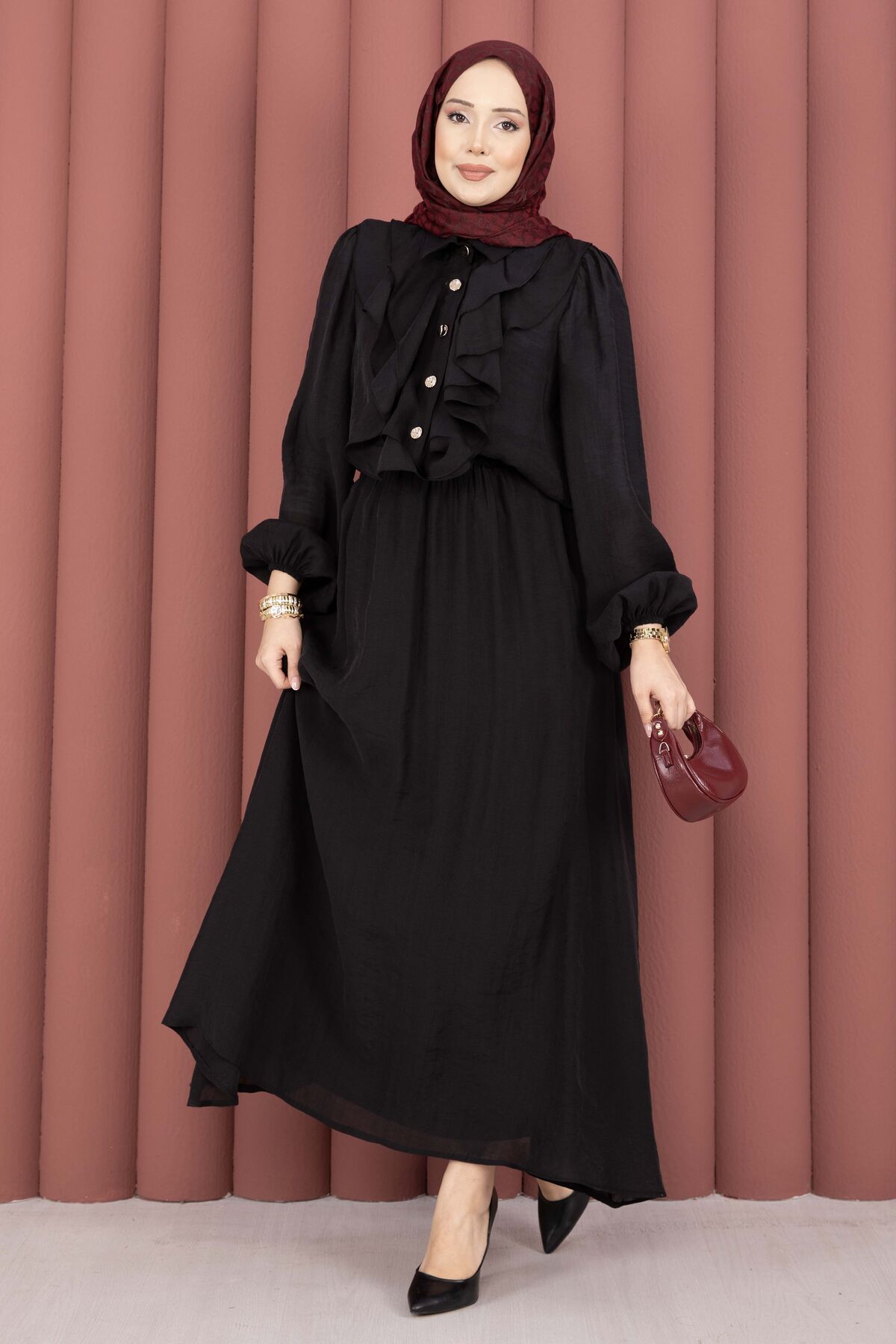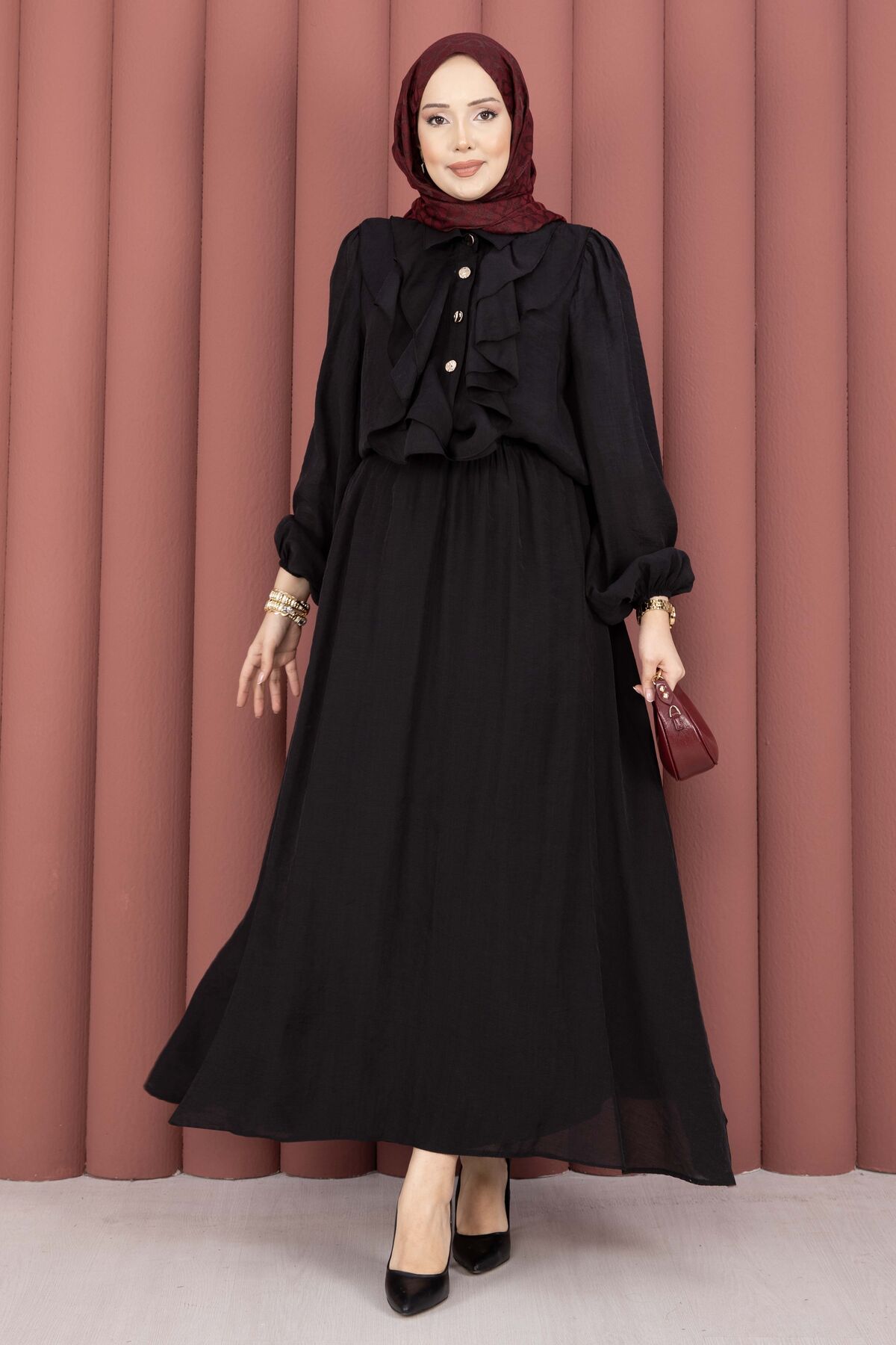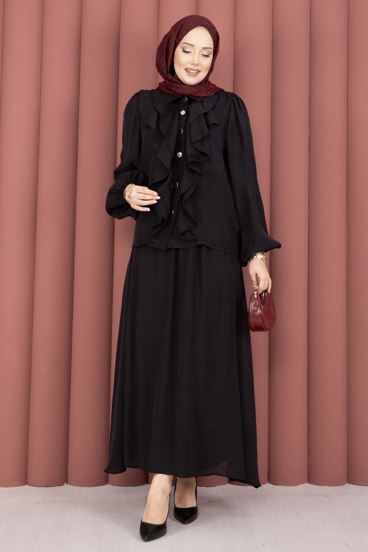 Önü Fırfır Detaylı Etekli Tesettür Takım Siyah