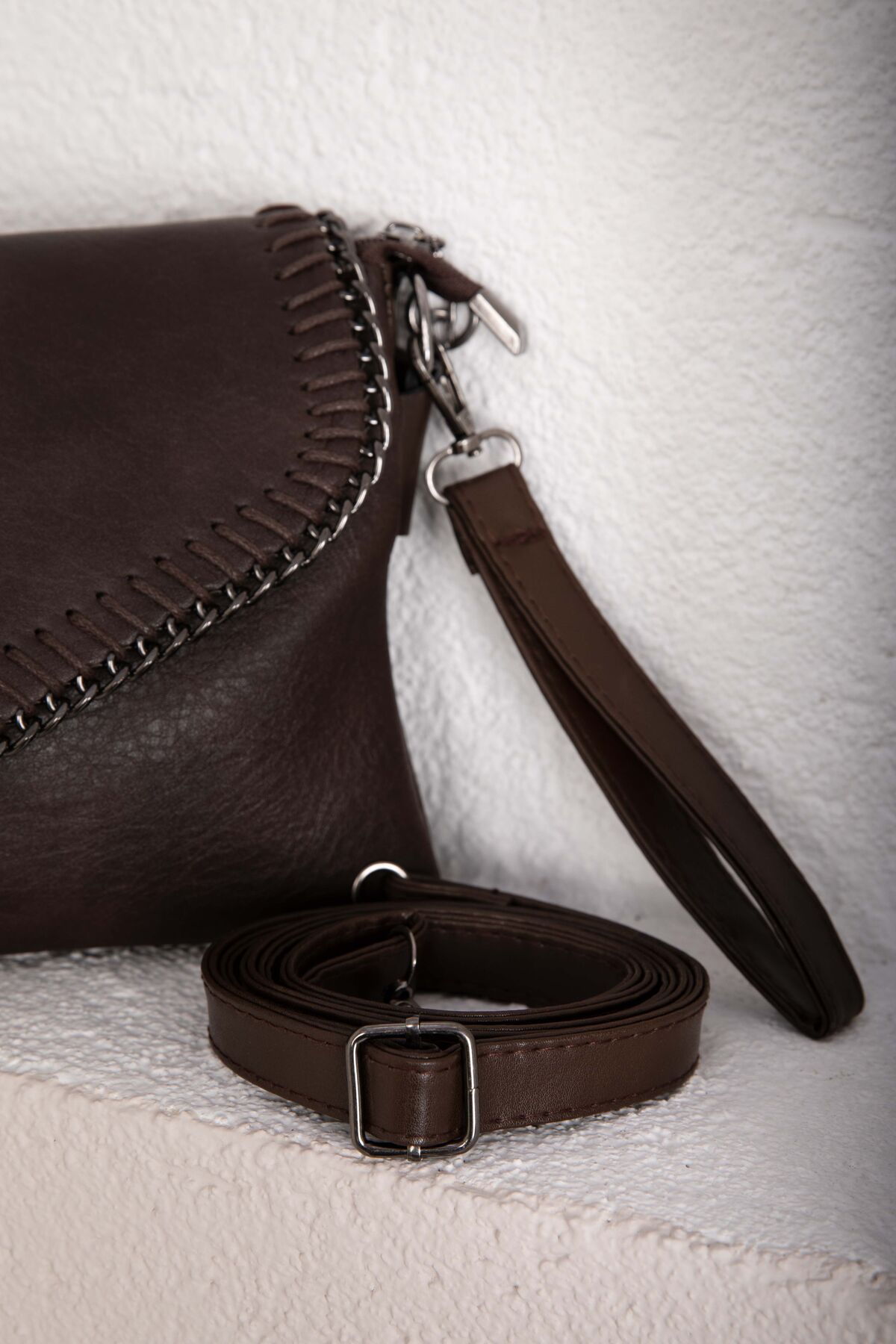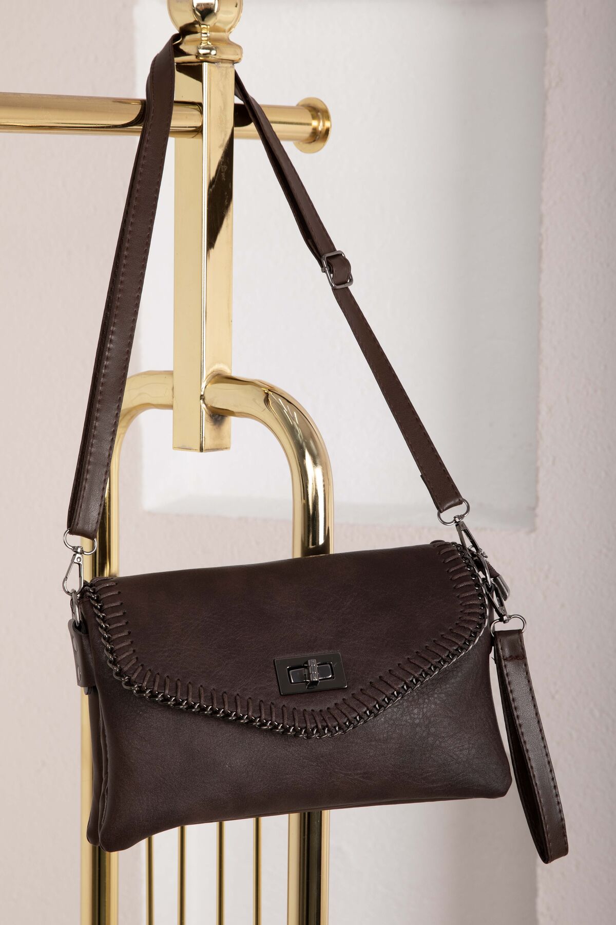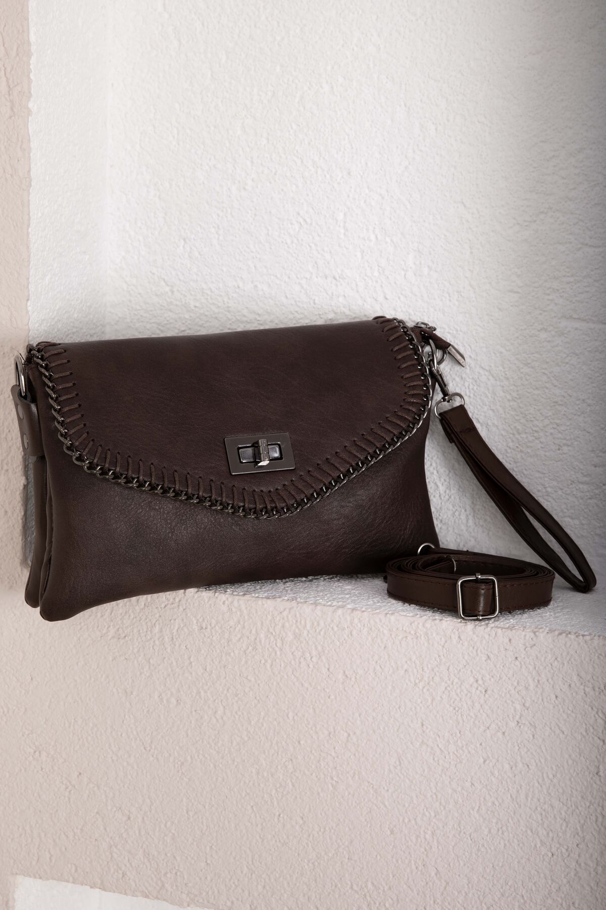 Örgü dikiş detayları ve kapaklı tasarımıyla öne çıkan bu model, modern ve şık bir görünüm sunar. Günlük kombinlerden özel davetlere kadar rahatlıkla tercih edilebilir. Kilitli kapak yapısı sayesinde eşyalarınızı güvenle taşımanıza olanak sağlar.