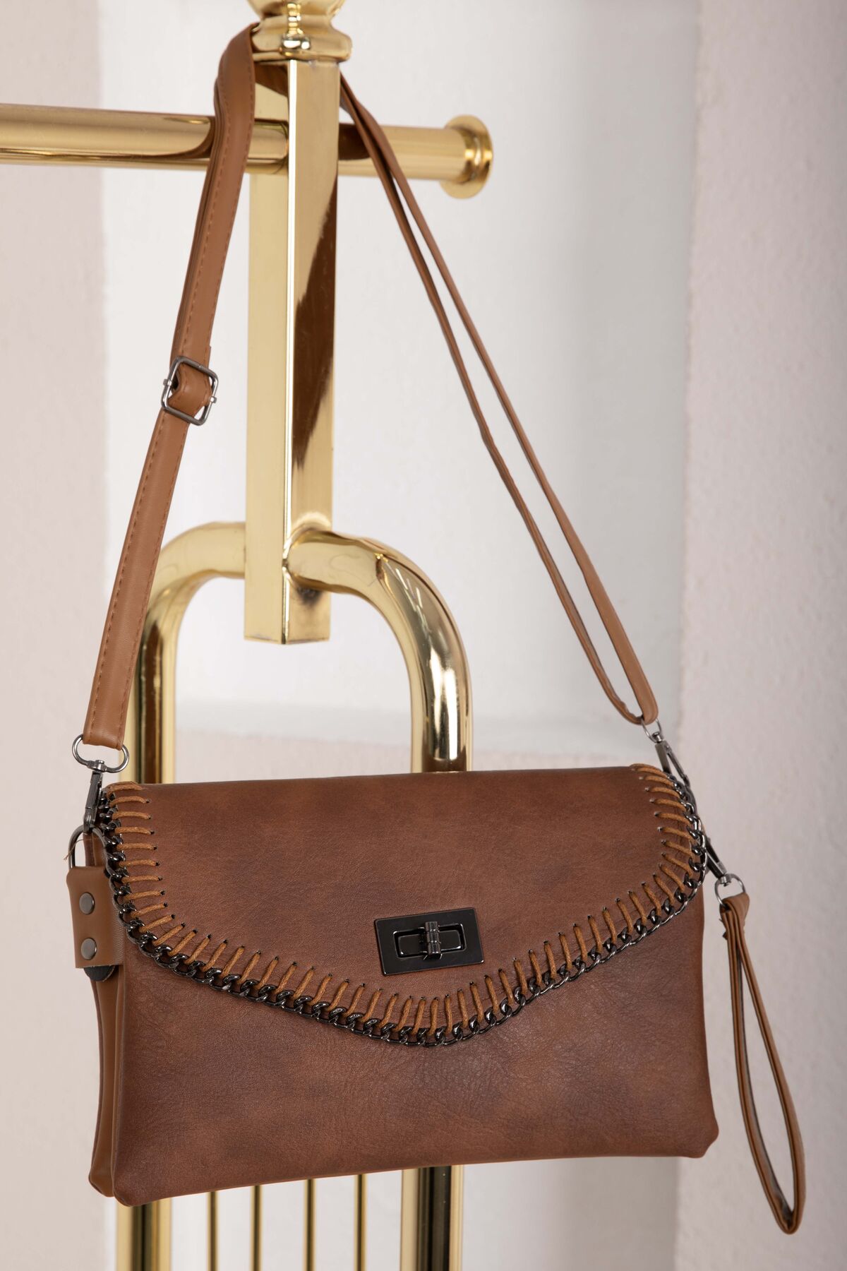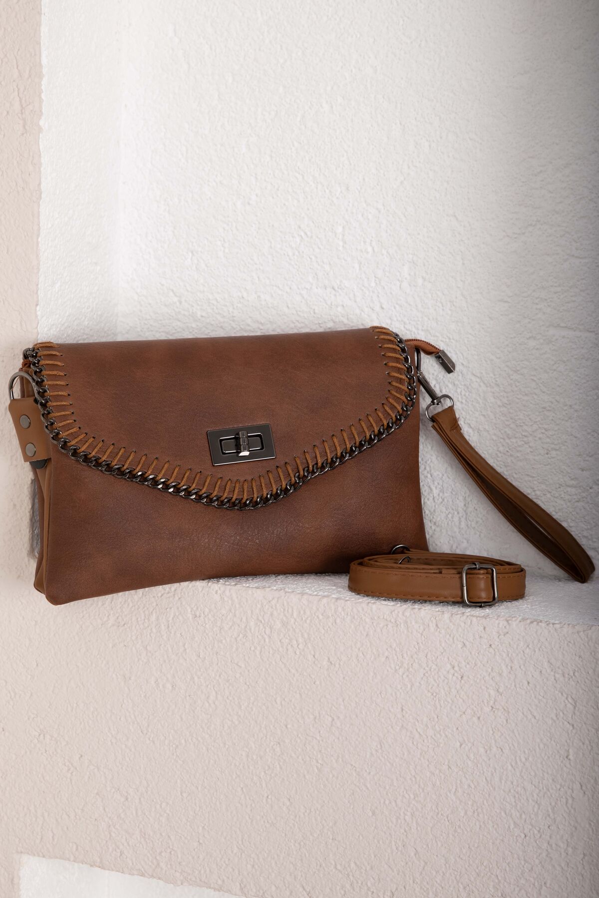 Örgü dikiş detayları ve kapaklı tasarımıyla öne çıkan bu model, modern ve şık bir görünüm sunar. Günlük kombinlerden özel davetlere kadar rahatlıkla tercih edilebilir. Kilitli kapak yapısı sayesinde eşyalarınızı güvenle taşımanıza olanak sağlar.