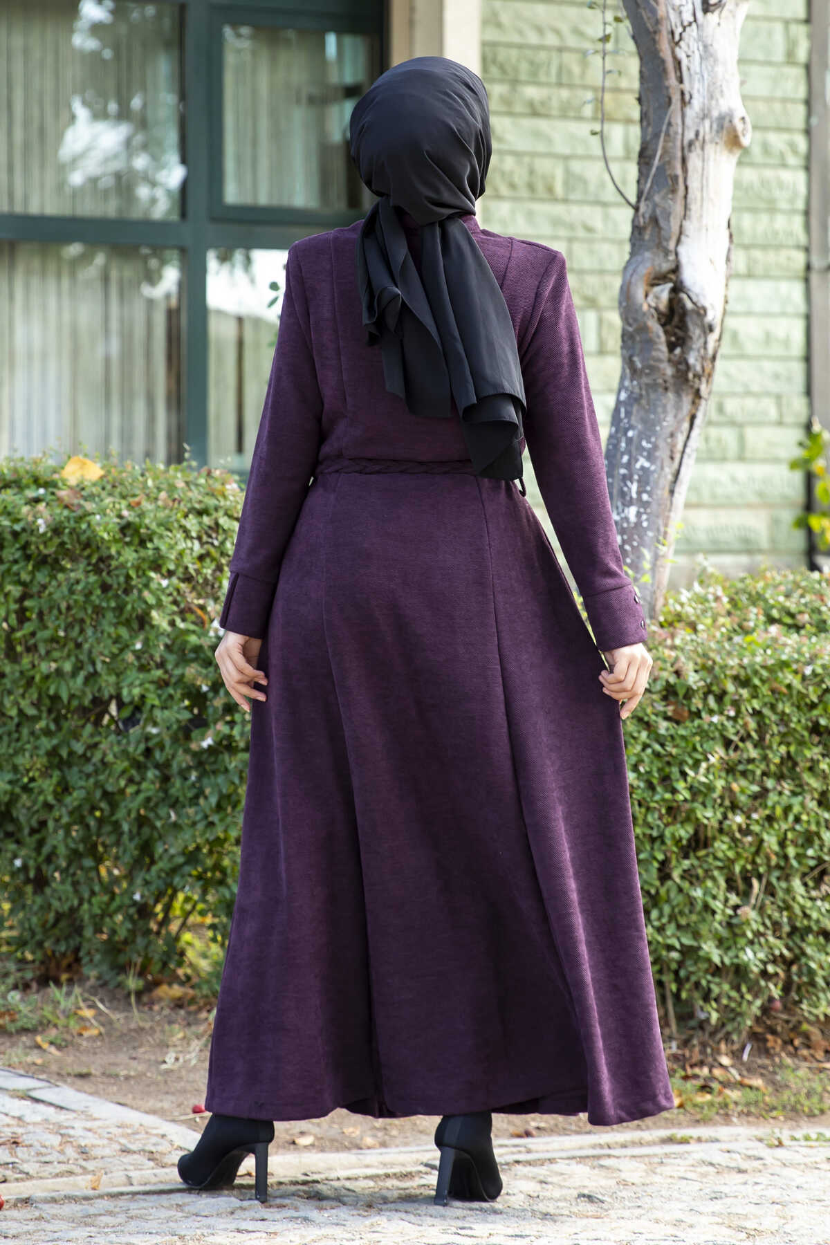Örgü Kemerli Kışlık Tesettür Ferace Mor