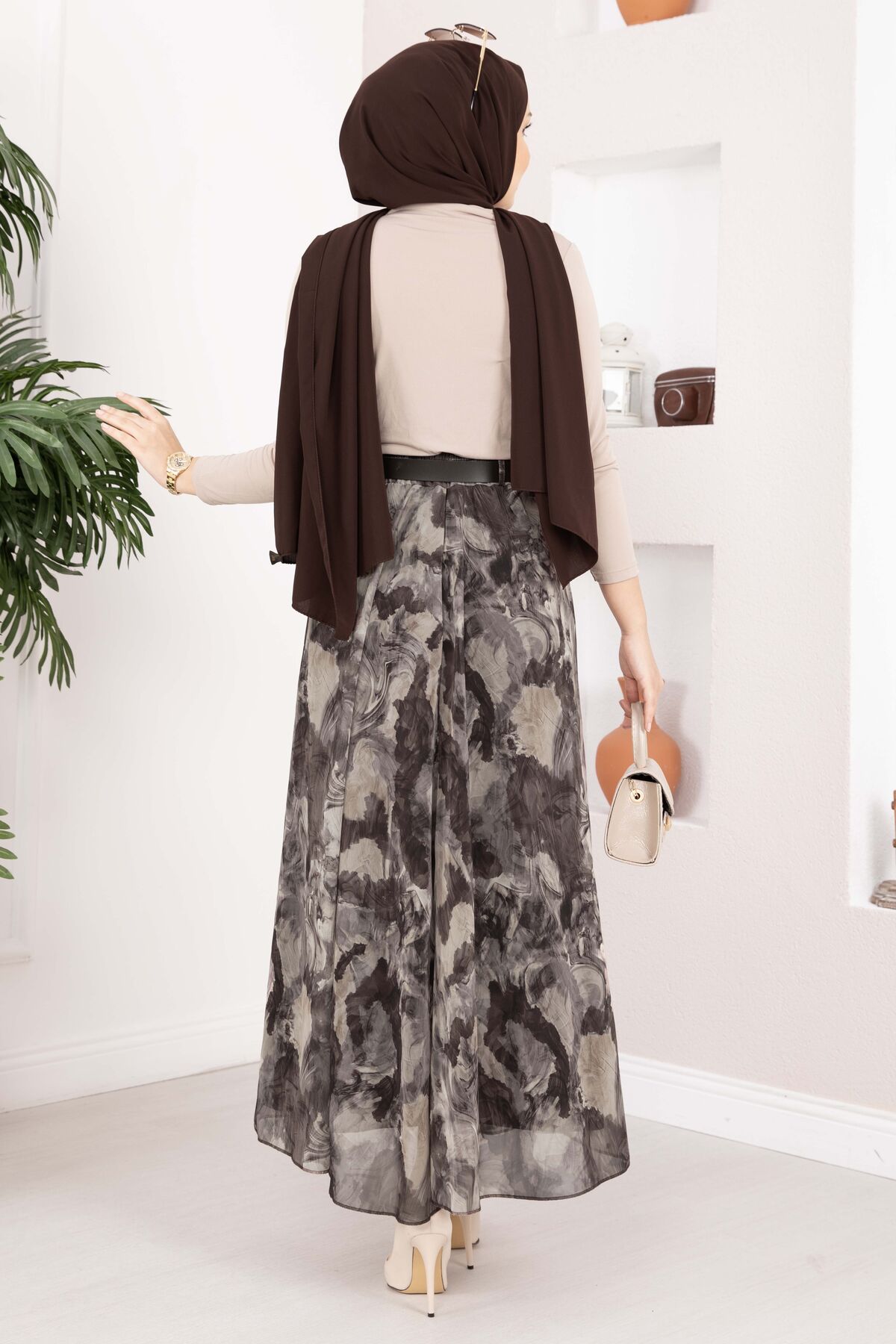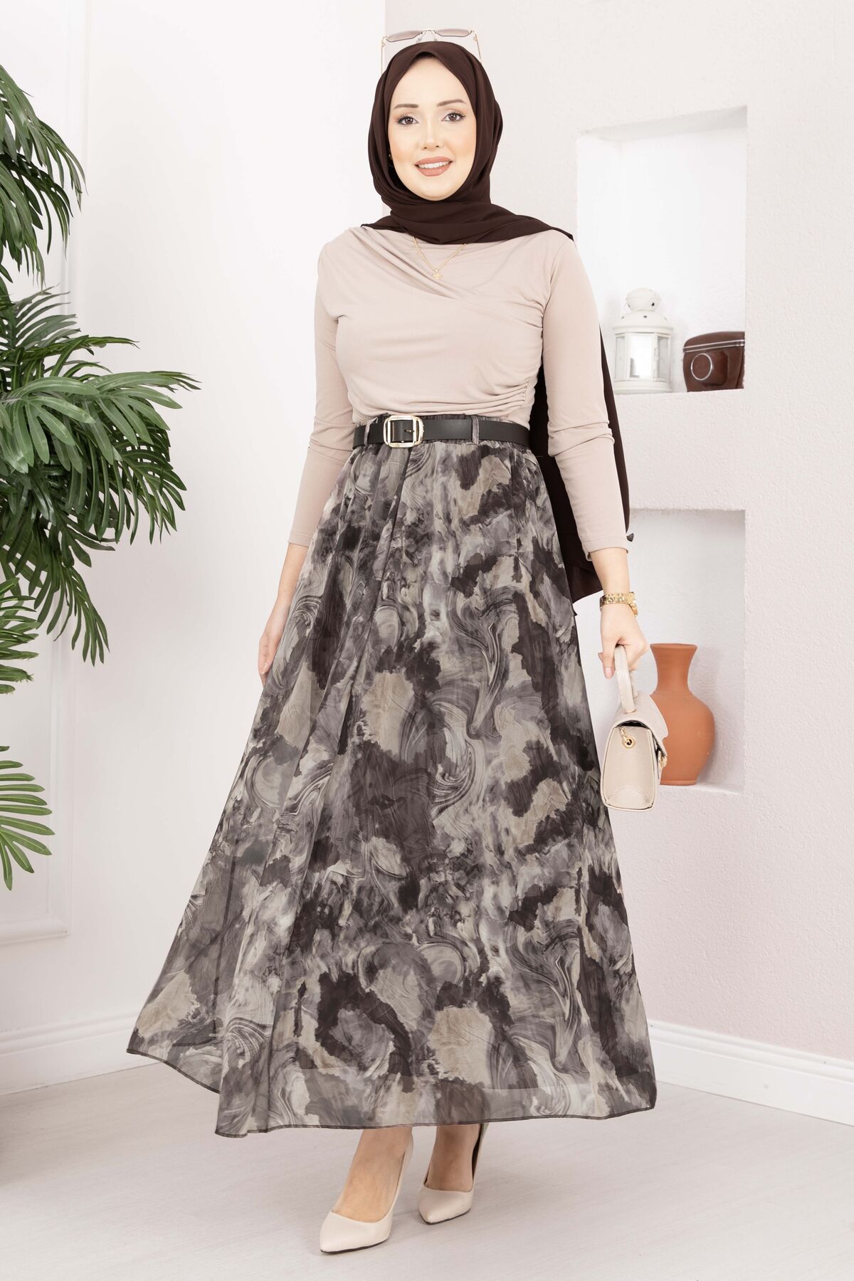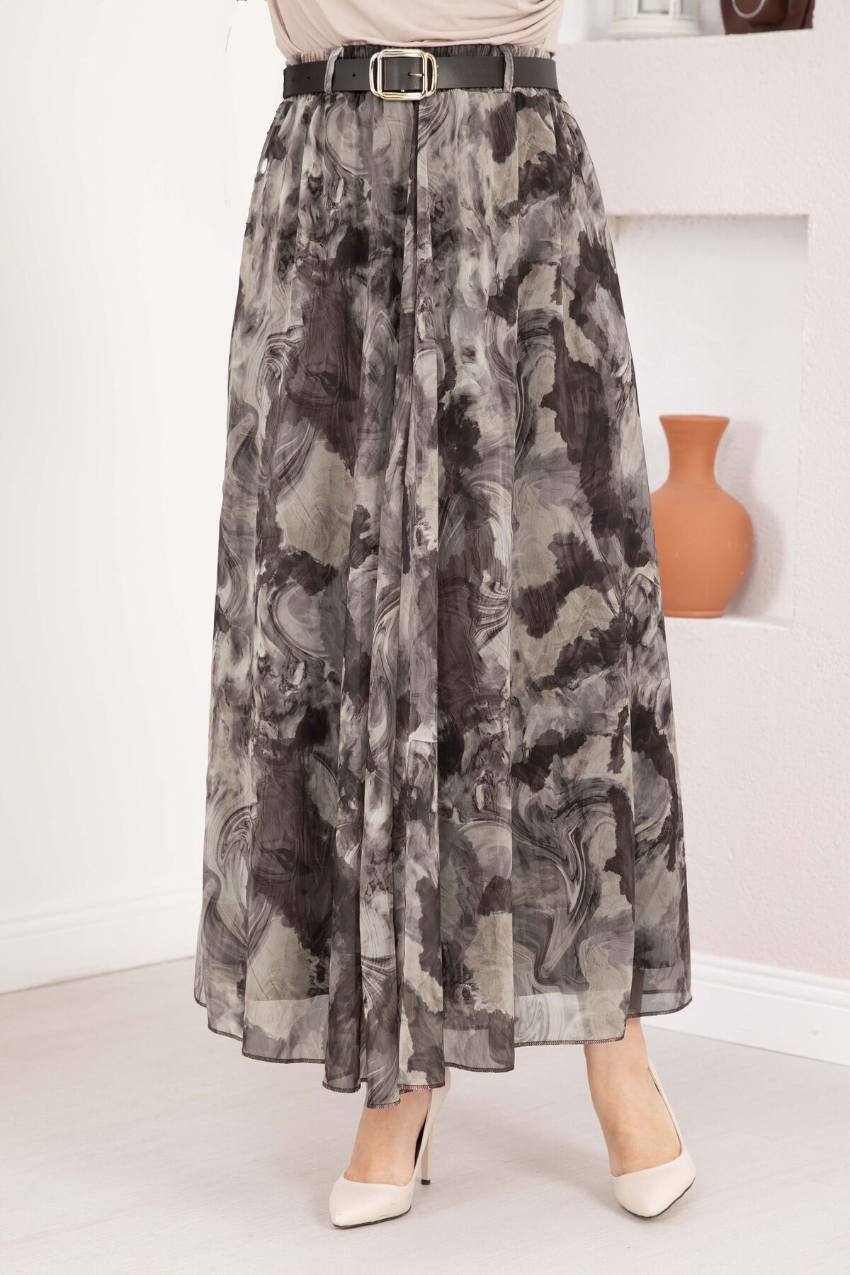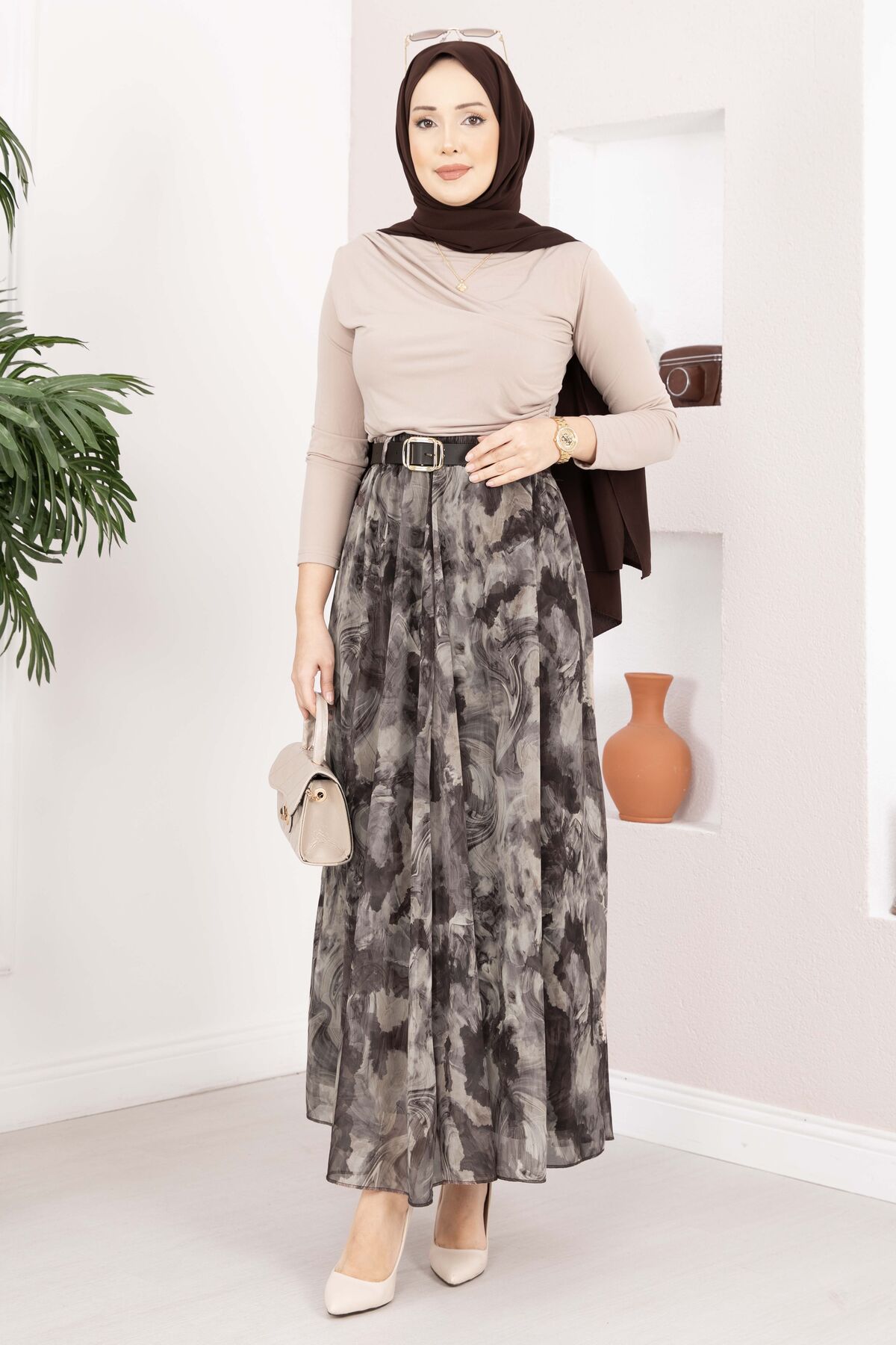 Otantik Desen Kemerli Şifon Etek Vizon