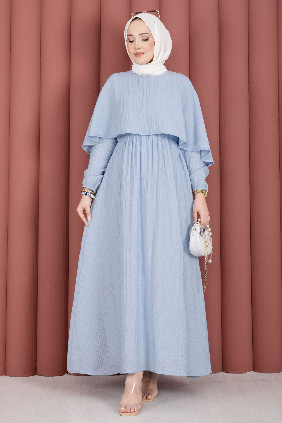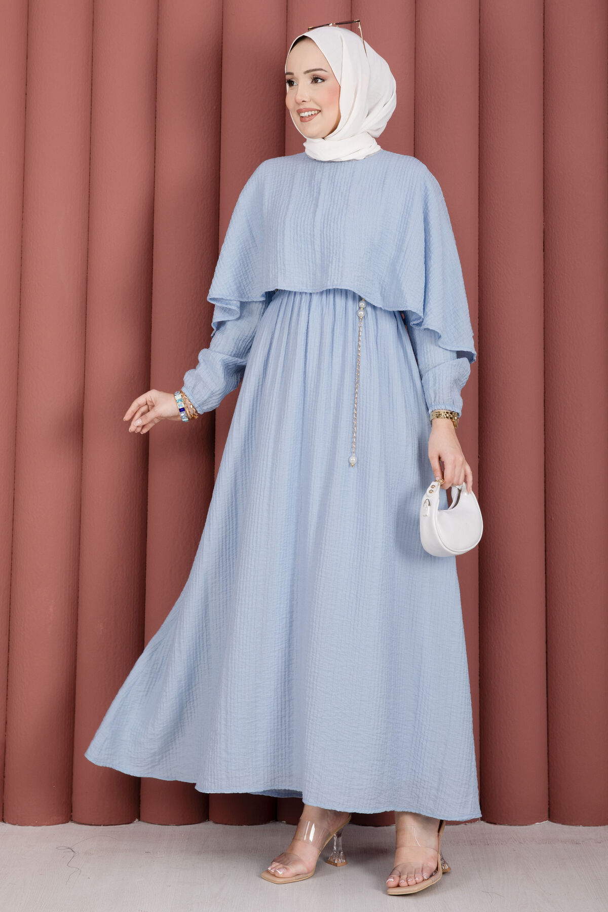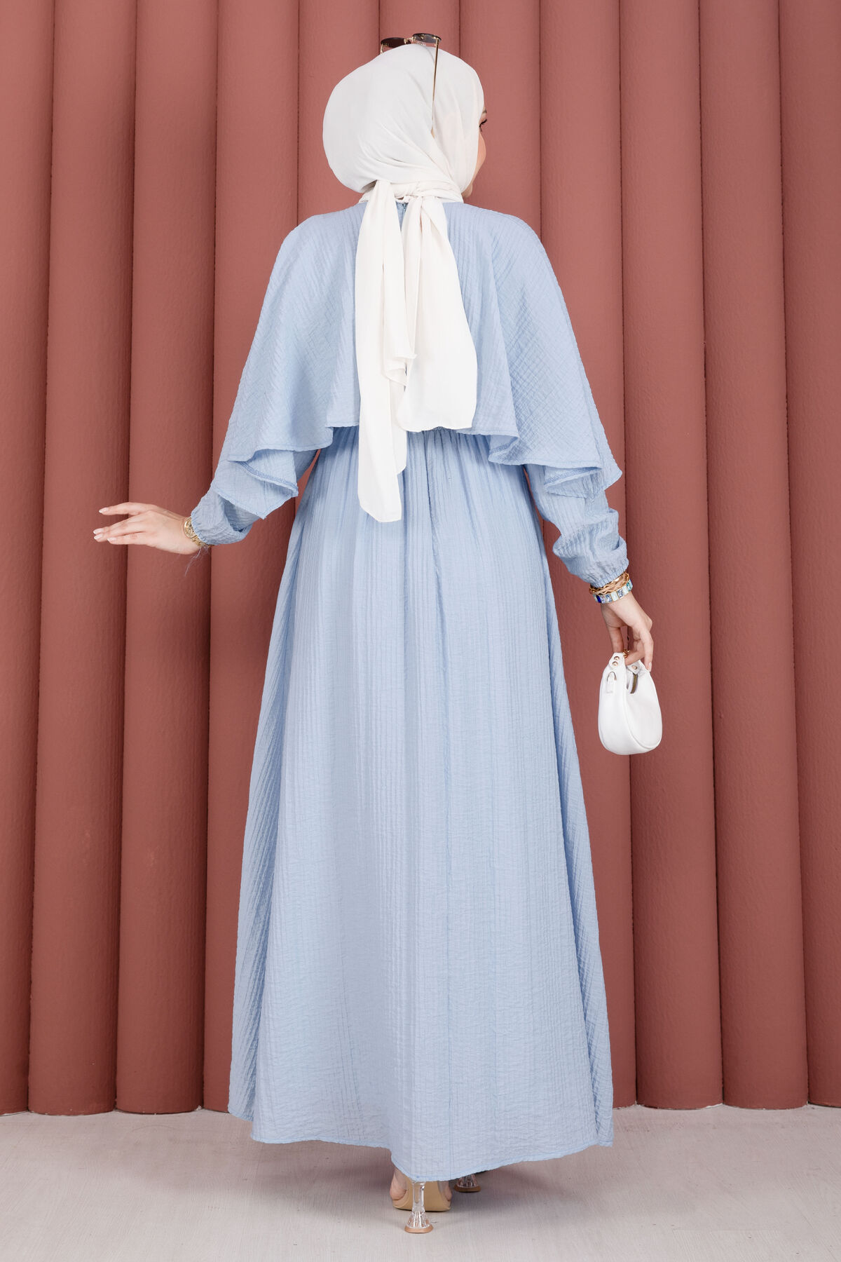 Şıklığı ve rahatlığı bir araya getiren Pelerin Yaka Beli Lastikli Astarlı Yazlık Elbise, gofre kumaşın kendine has dokusu sayesinde zarif ve modern bir görünüm sunar. Kendinden pelerin detayıyla farklılaşan bu model, yaz aylarında hem günlük kullanıma hem de özel davetlere uyum sağlar. Beli lastikli yapısı konforlu bir kullanım sunarken, astarlı oluşu iç göstermeyen şık bir duruş sağlar.