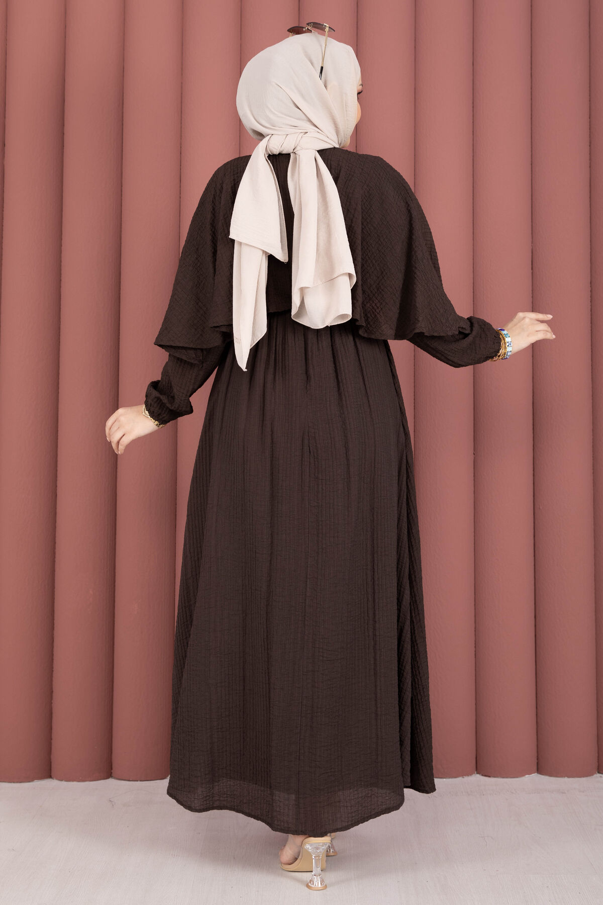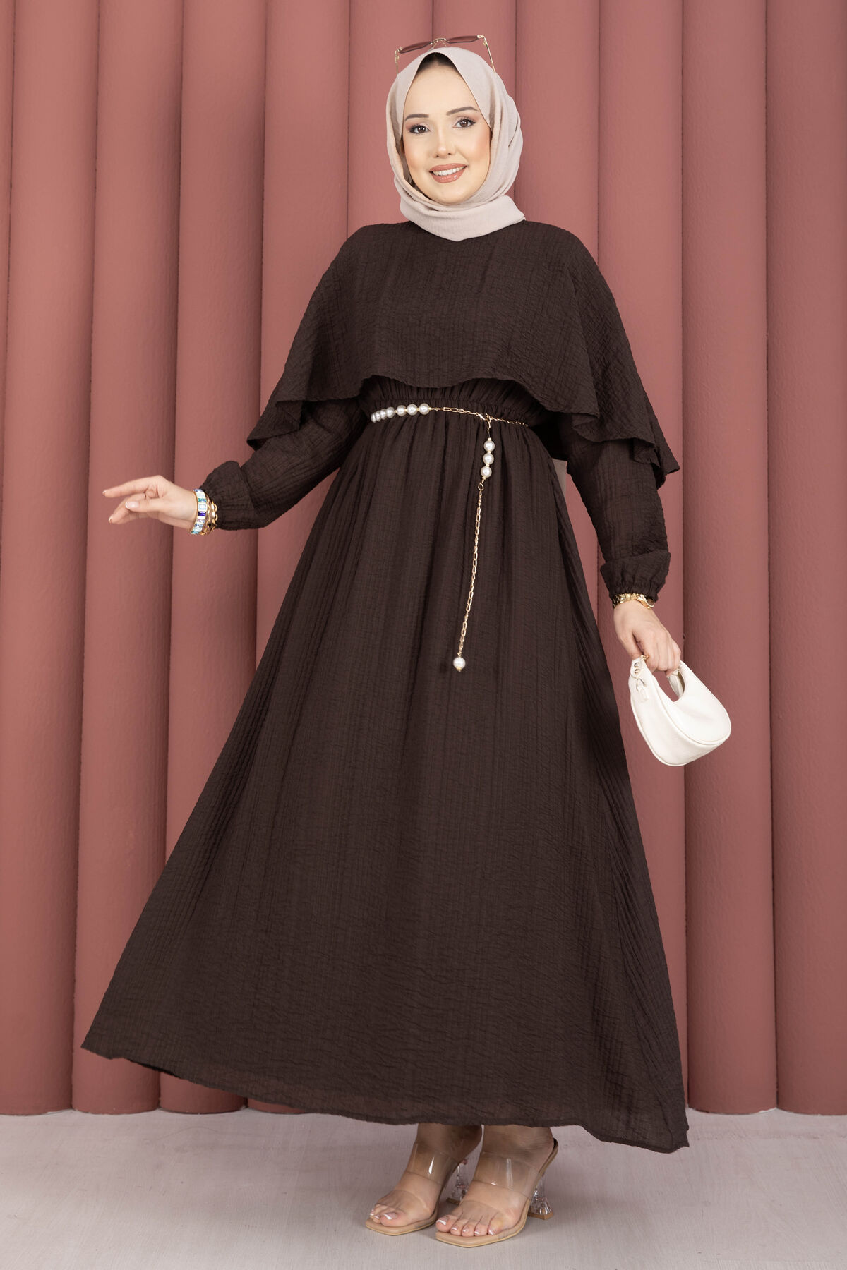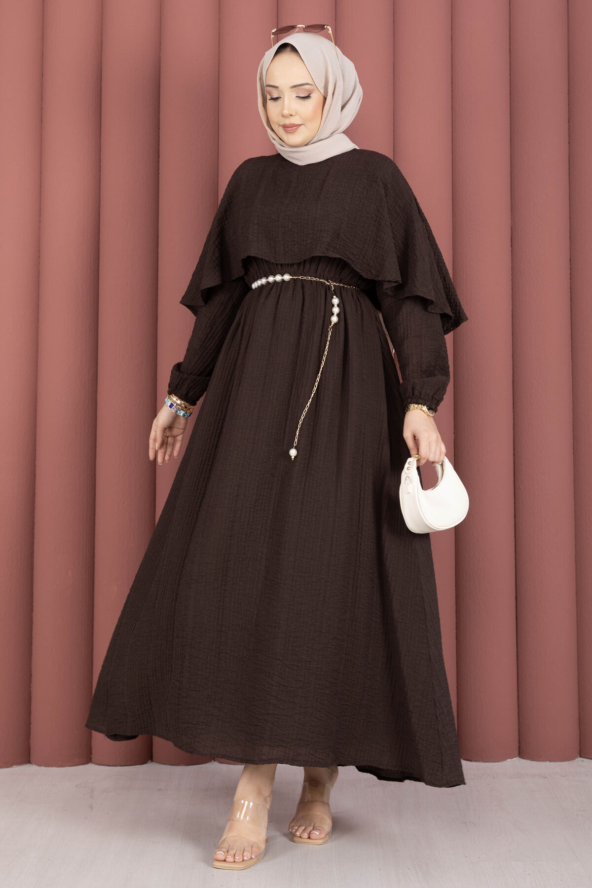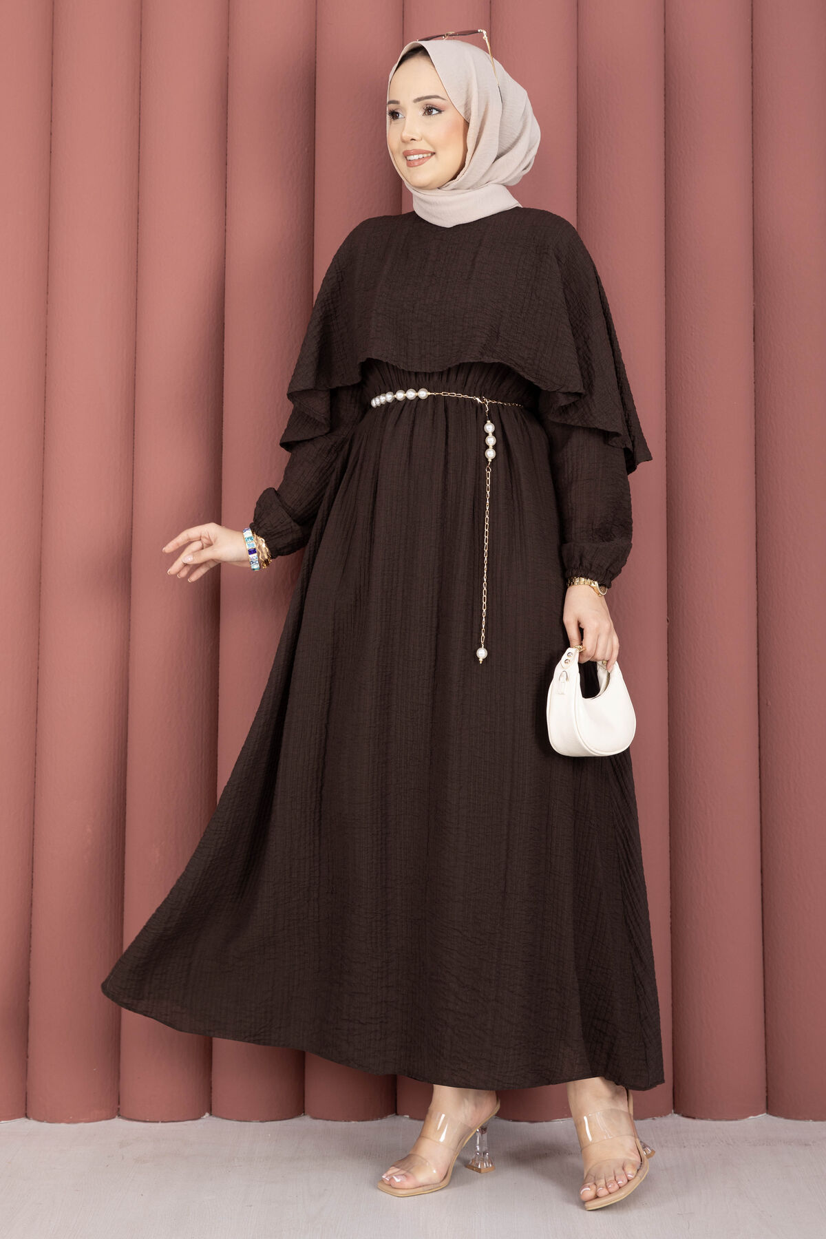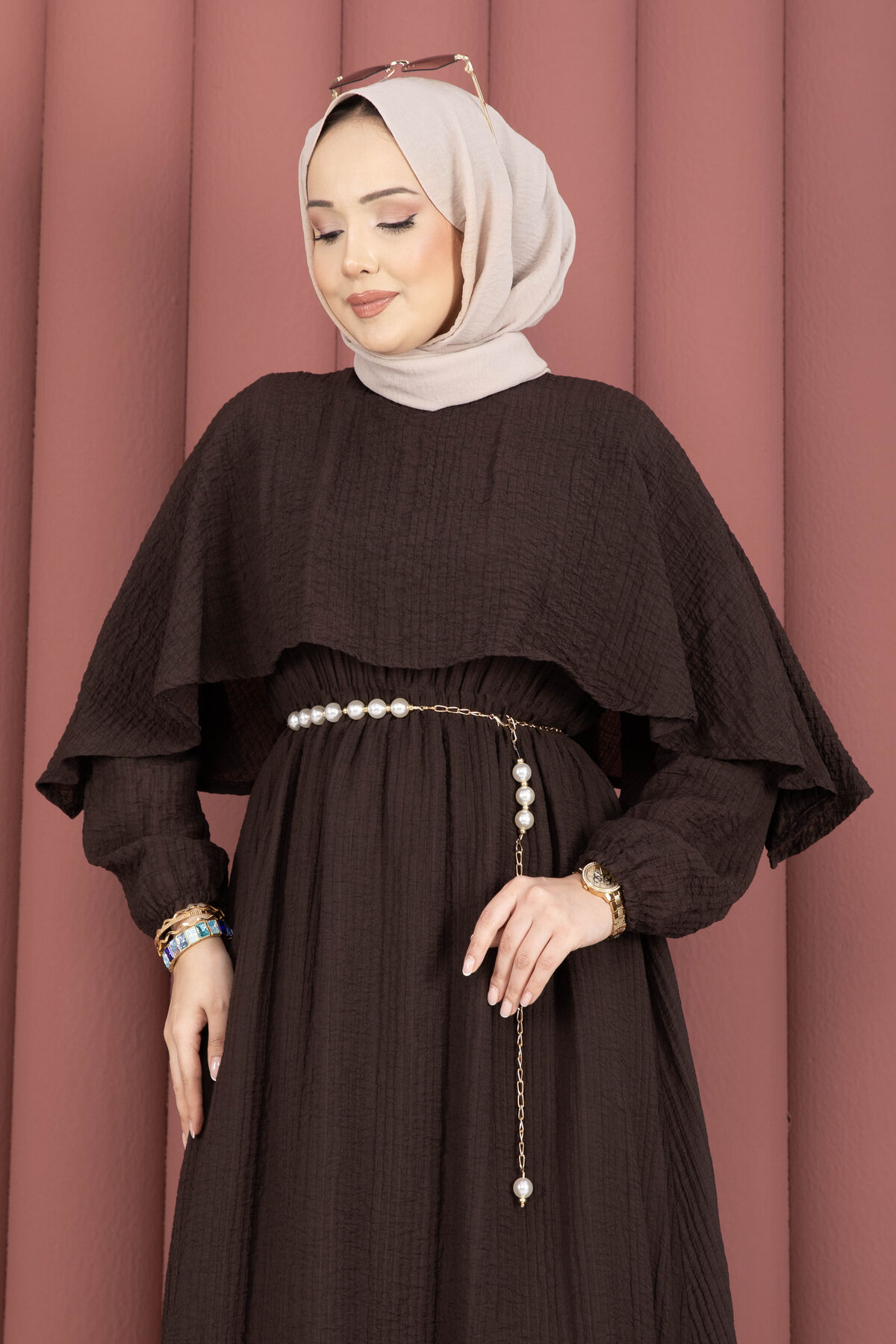 Pelerin Yaka Beli Lastikli Astarlı Yazlık Elbise Kahve
