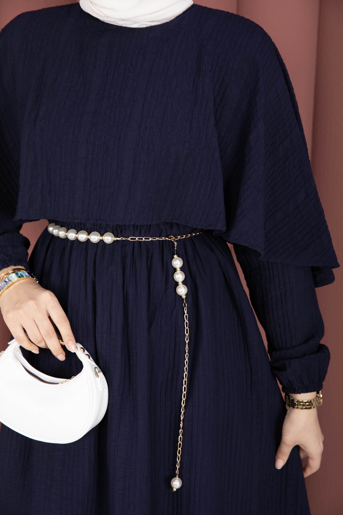 Pelerin Yaka Beli Lastikli Astarlı Gofre Elbise