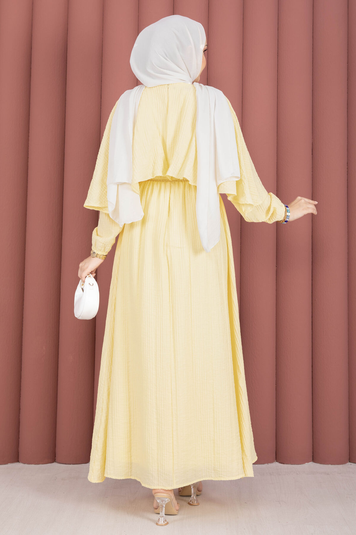 Şıklığı ve rahatlığı bir araya getiren Pelerin Yaka Beli Lastikli Astarlı Yazlık Elbise, gofre kumaşın kendine has dokusu sayesinde zarif ve modern bir görünüm sunar. Kendinden pelerin detayıyla farklılaşan bu model, yaz aylarında hem günlük kullanıma hem de özel davetlere uyum sağlar. Beli lastikli yapısı konforlu bir kullanım sunarken, astarlı oluşu iç göstermeyen şık bir duruş sağlar.