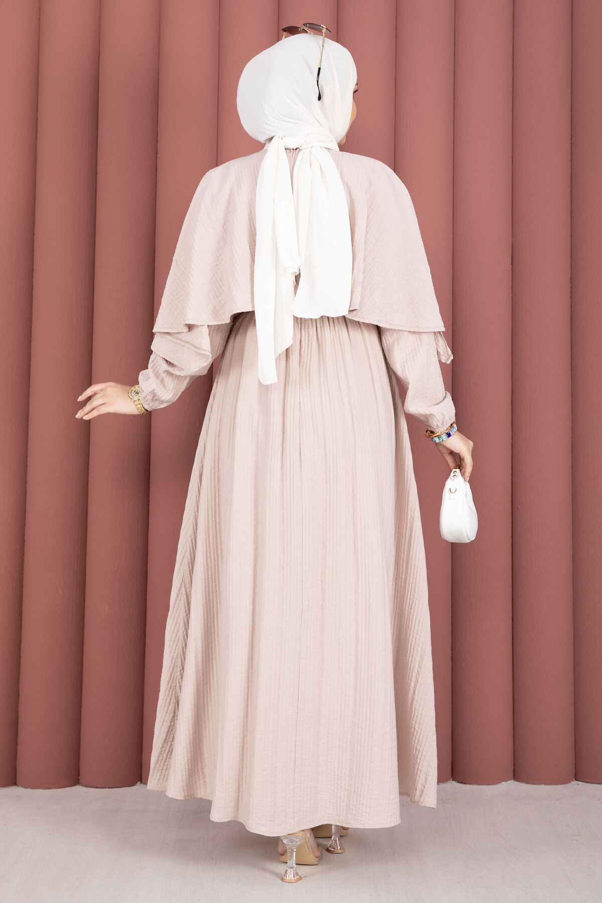 Pelerin Yaka Beli Lastikli Astarlı Yazlık Elbise Vizon