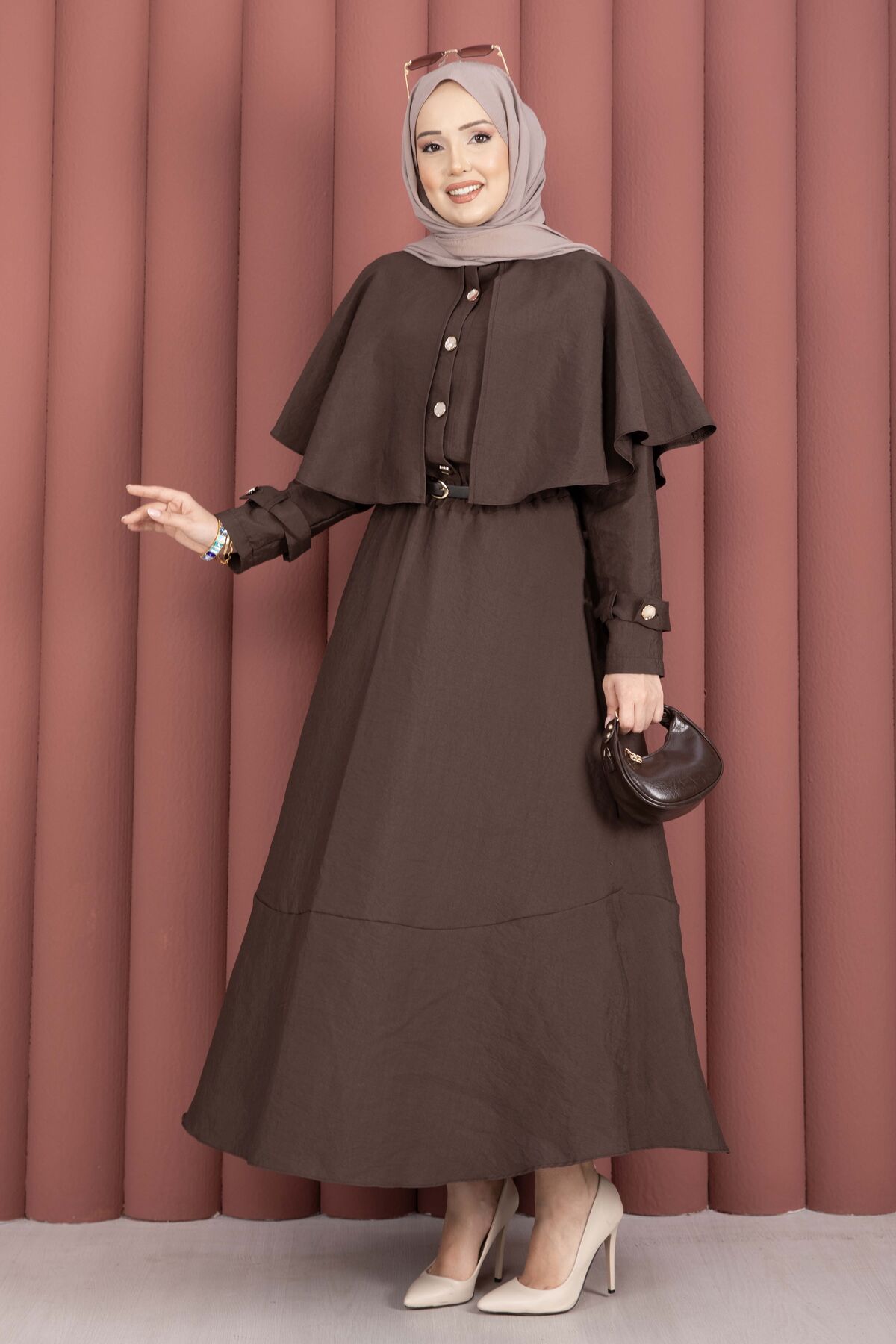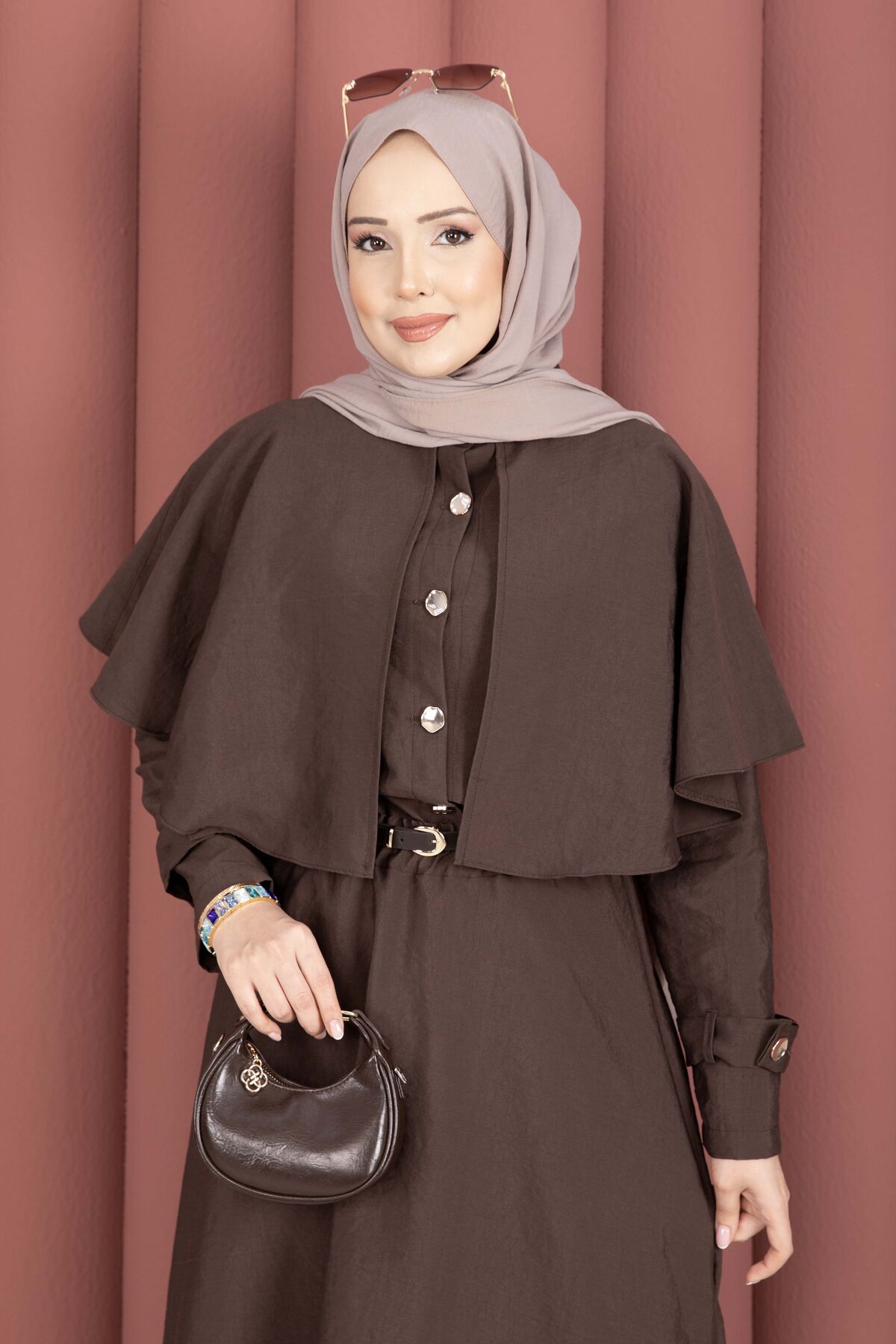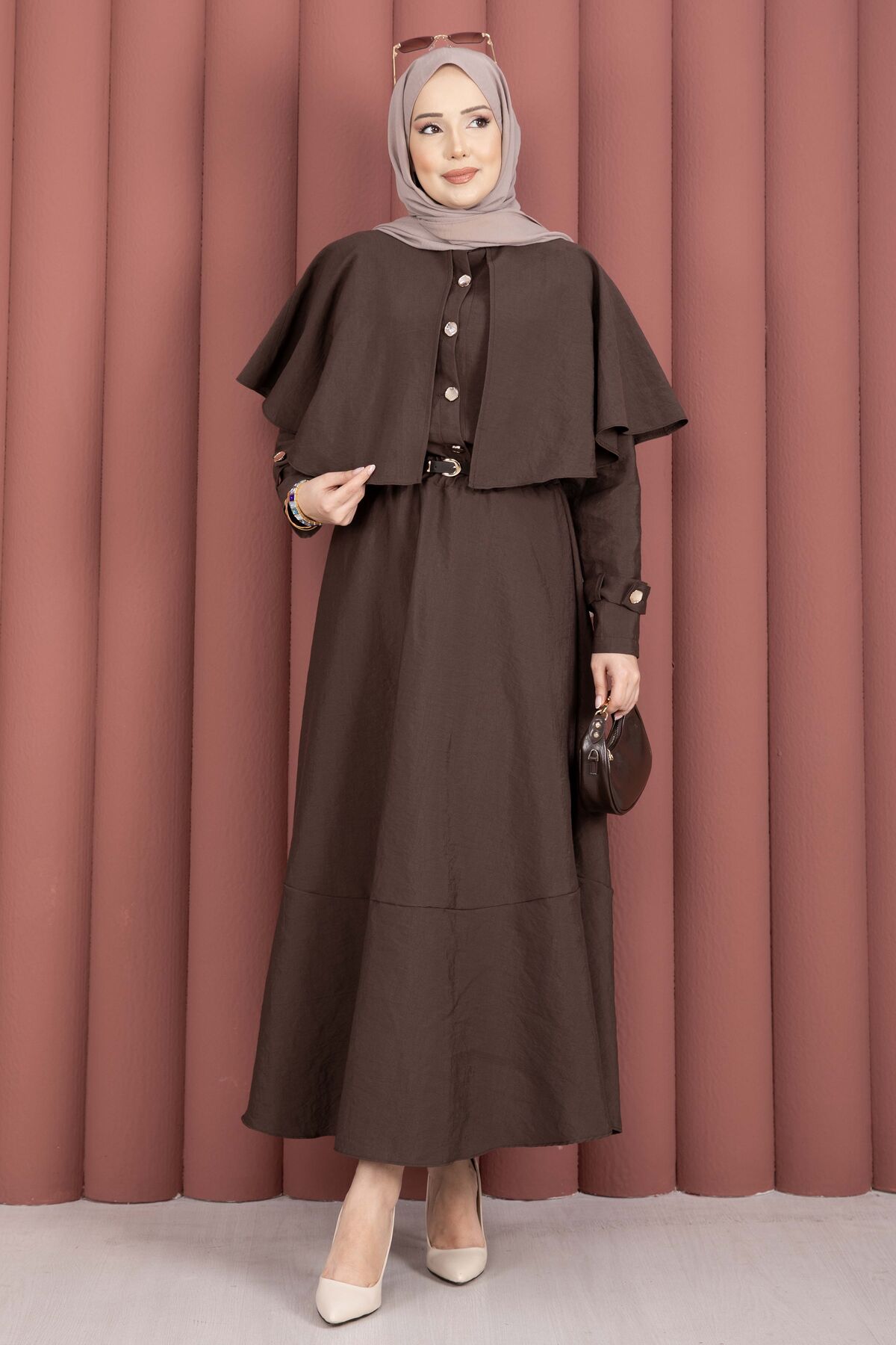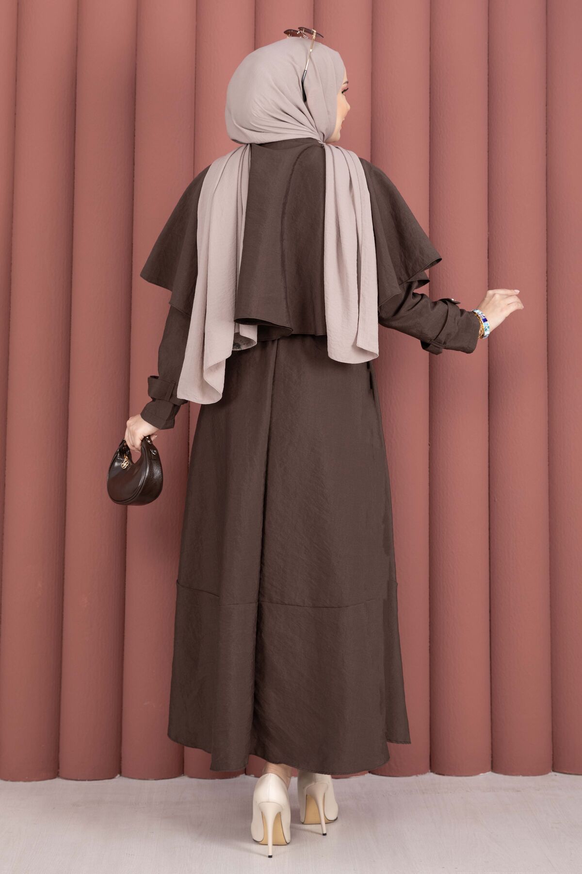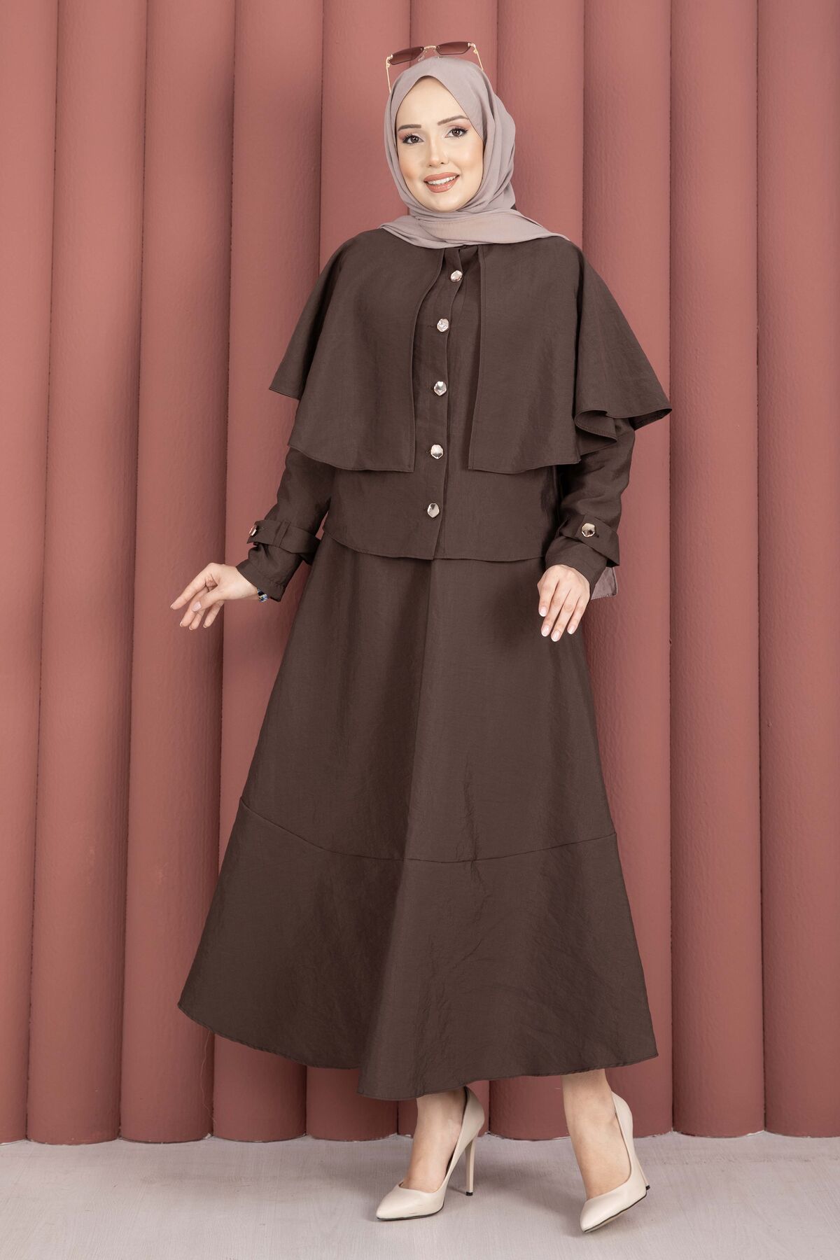 Pelerinli Apolet Detaylı Etekli İkili Takım Kahve