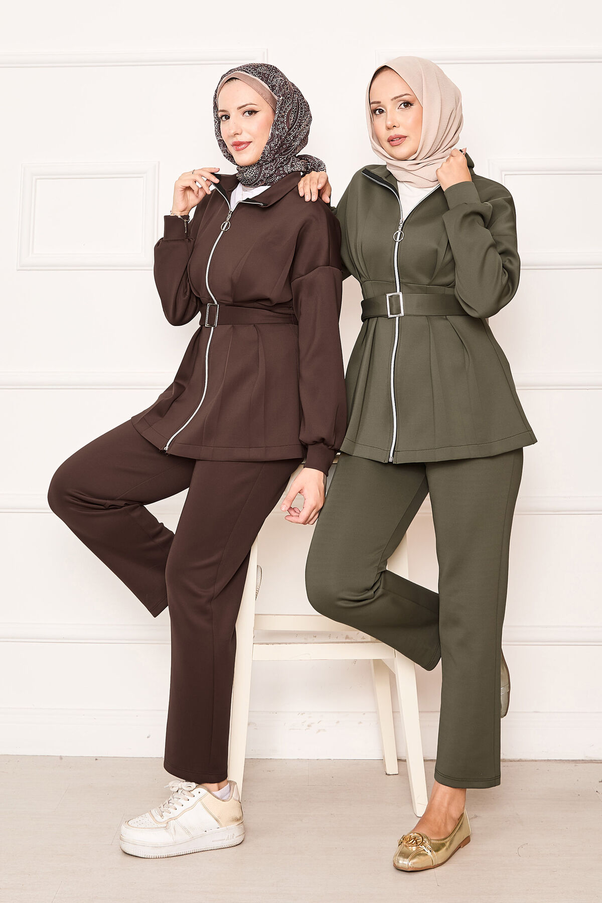 Pile Detaylı Fermuarlı İkili Takım Kahve