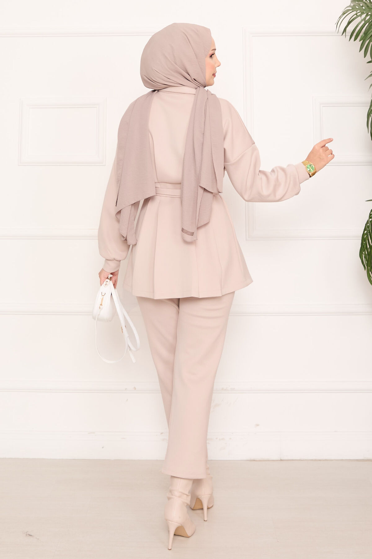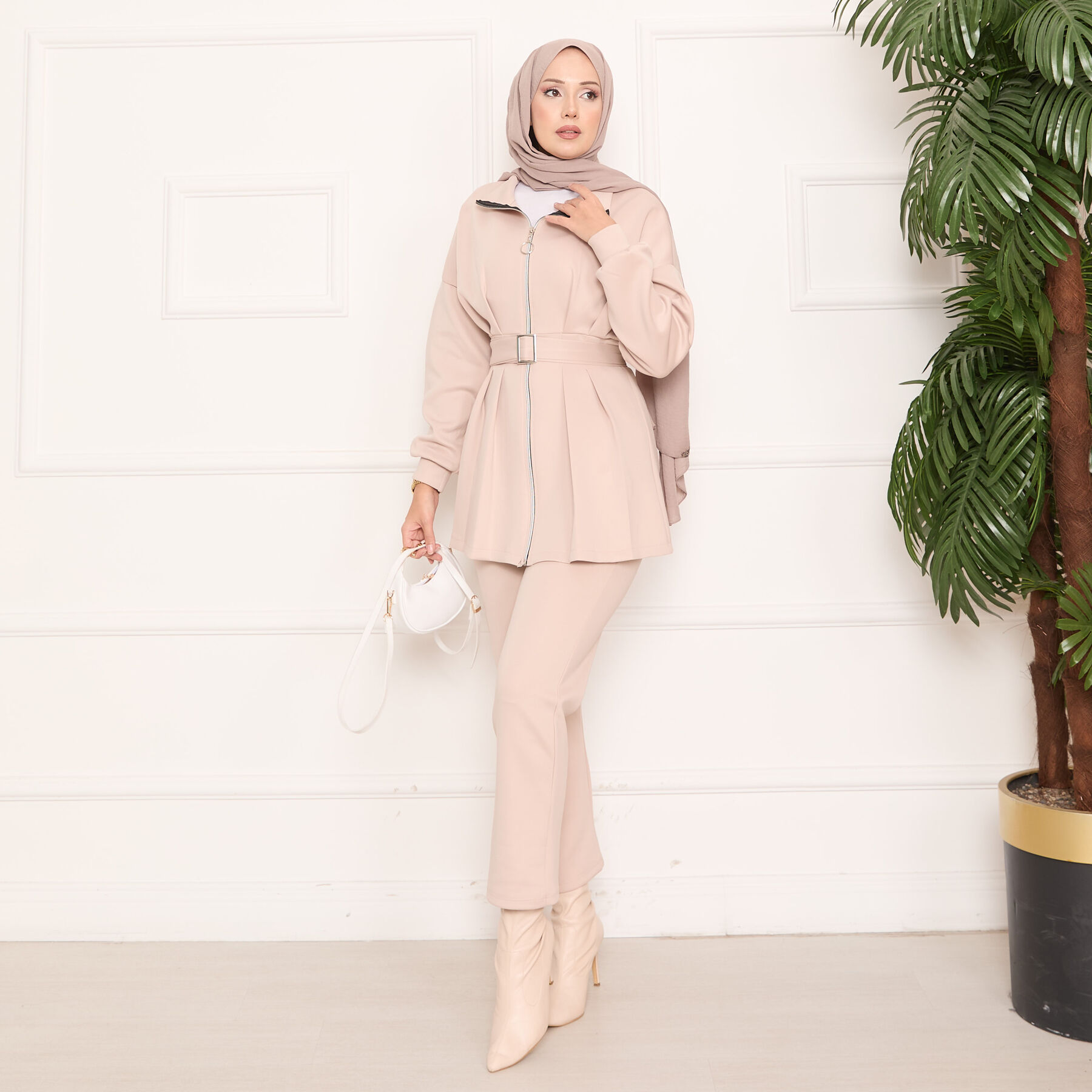 - Ürün mevsimliktir. Ürün tunik, kemer ve pantolon olmak üzere üç parçadan oluşmaktadır. Tunik boydan fermuarlı pile detaylı ve belden seyyar kemerlidir. Pantolon belden lastiklidir