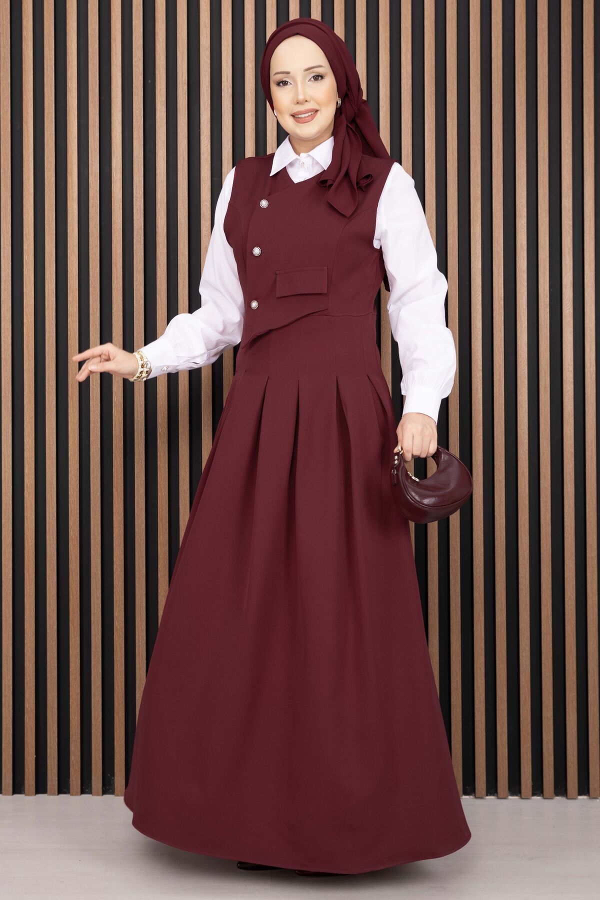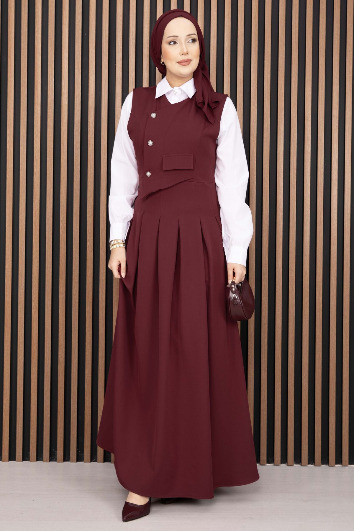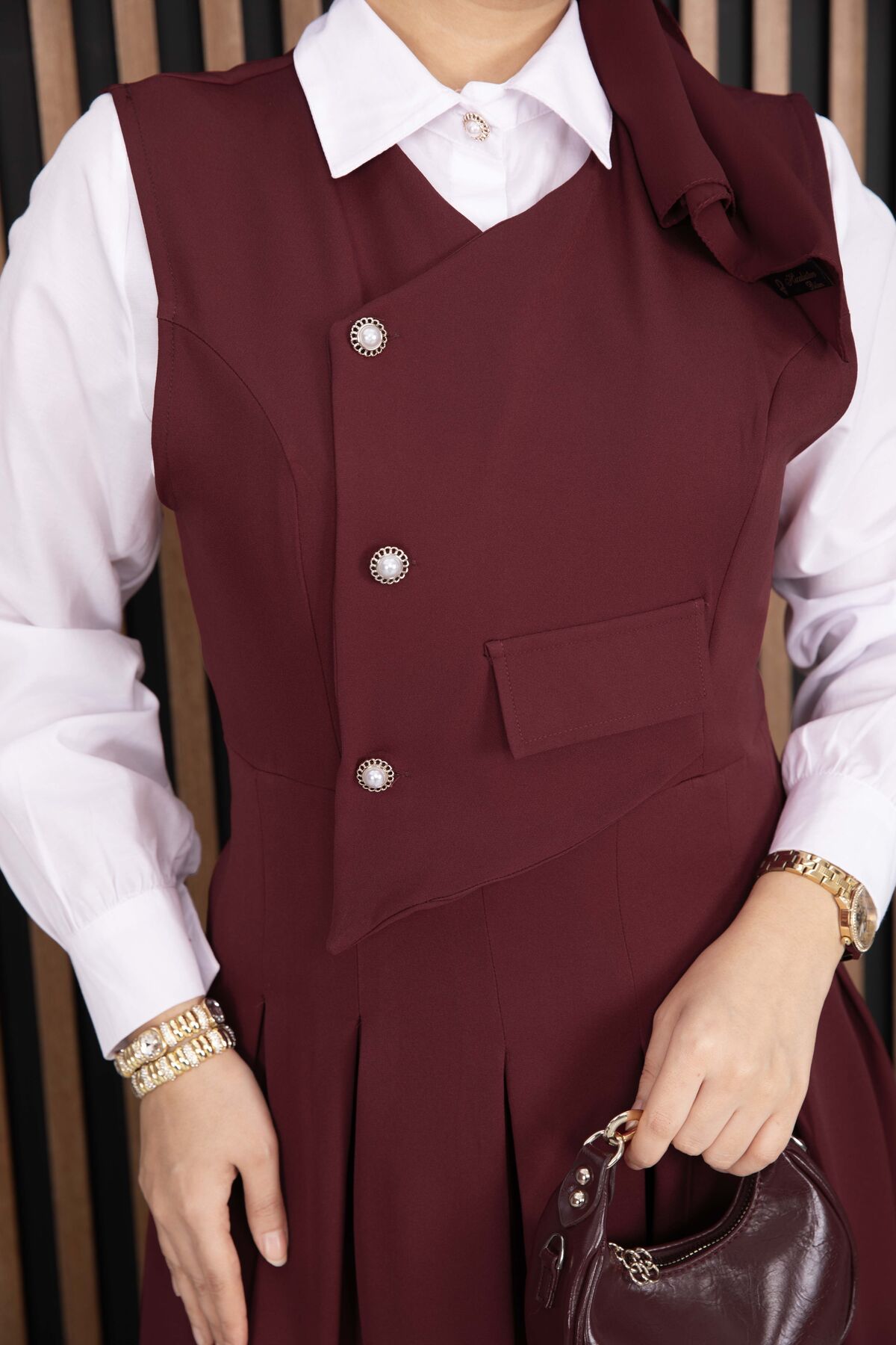 Pile Detaylı Gömlekli Jile Takım Bordo