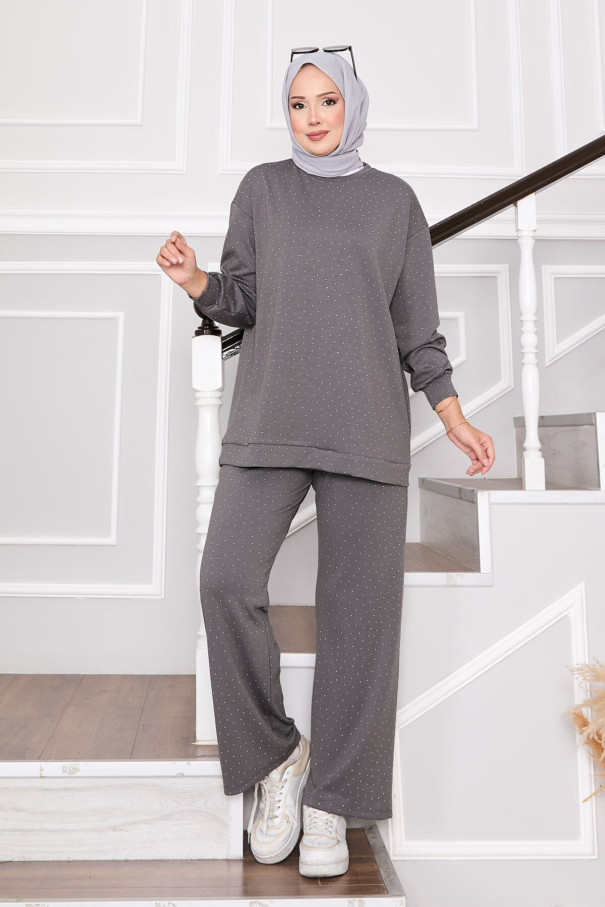 Pırıltılı Bisiklet Yaka İkili Takım Gri