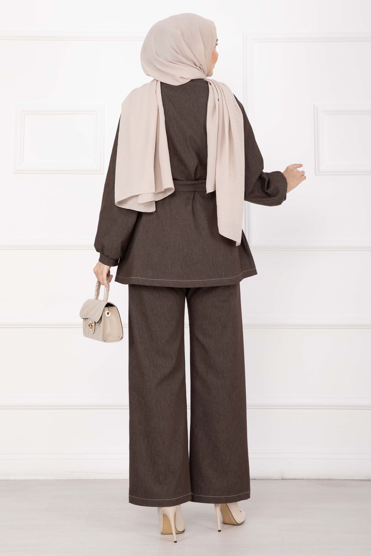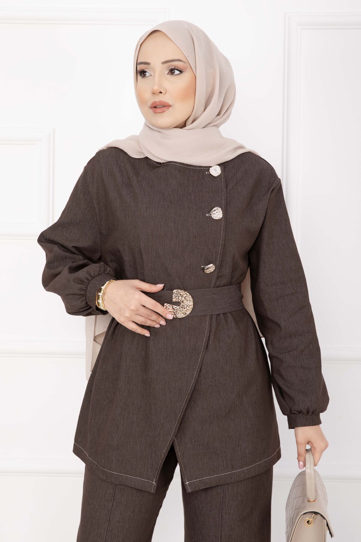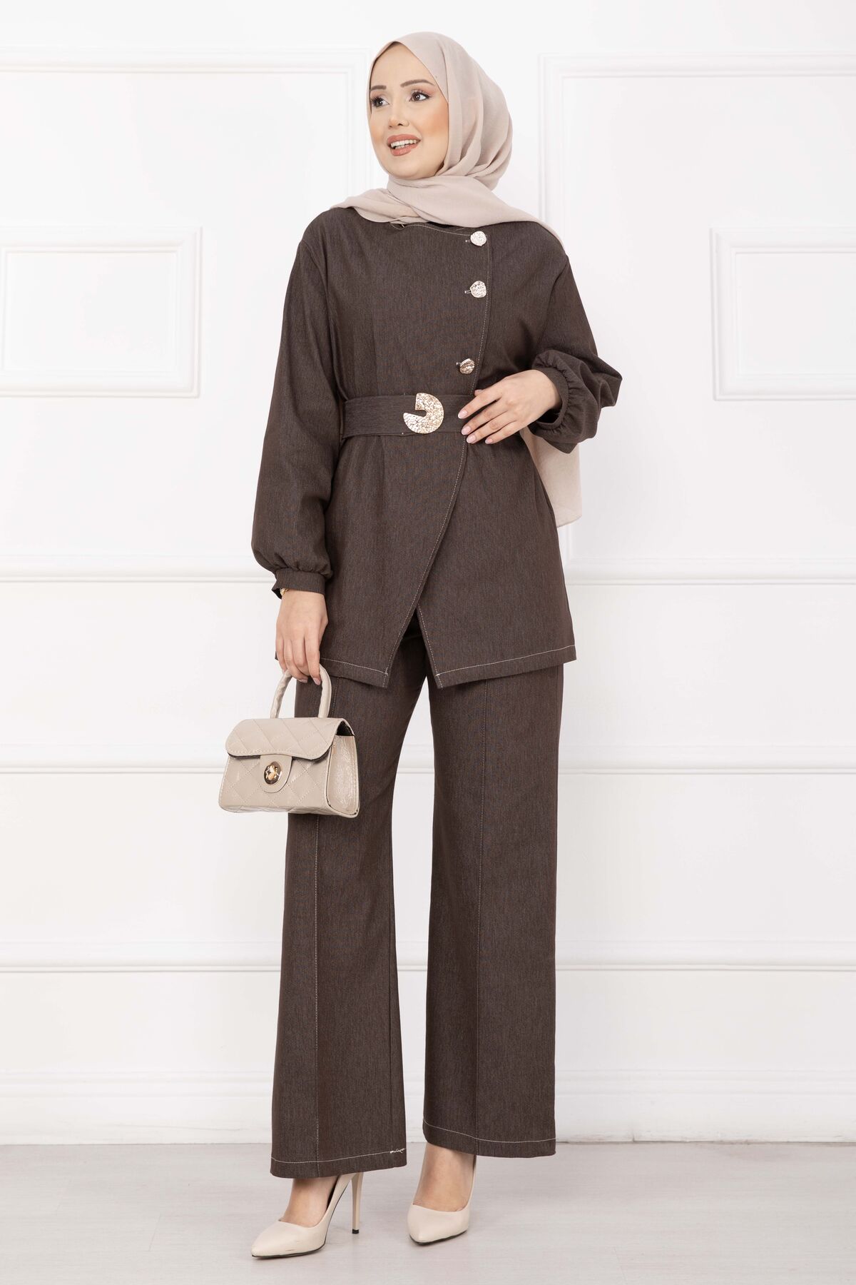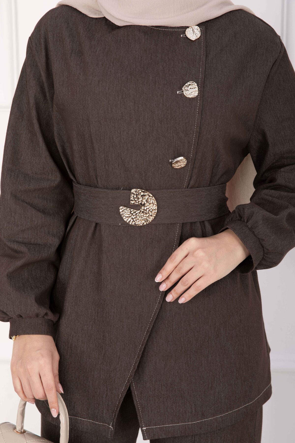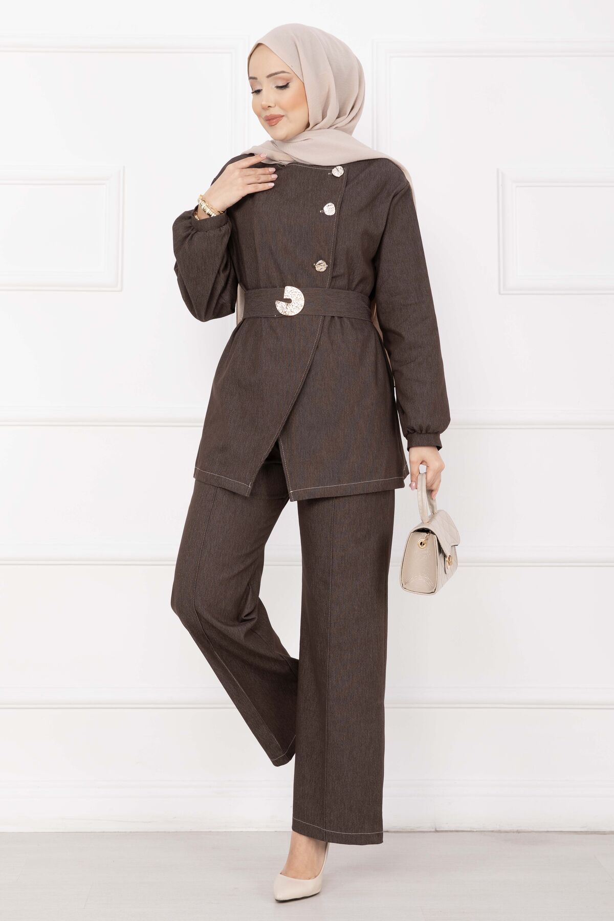Premium Gold Düğmeli Kemerli Kot Takım Kahve