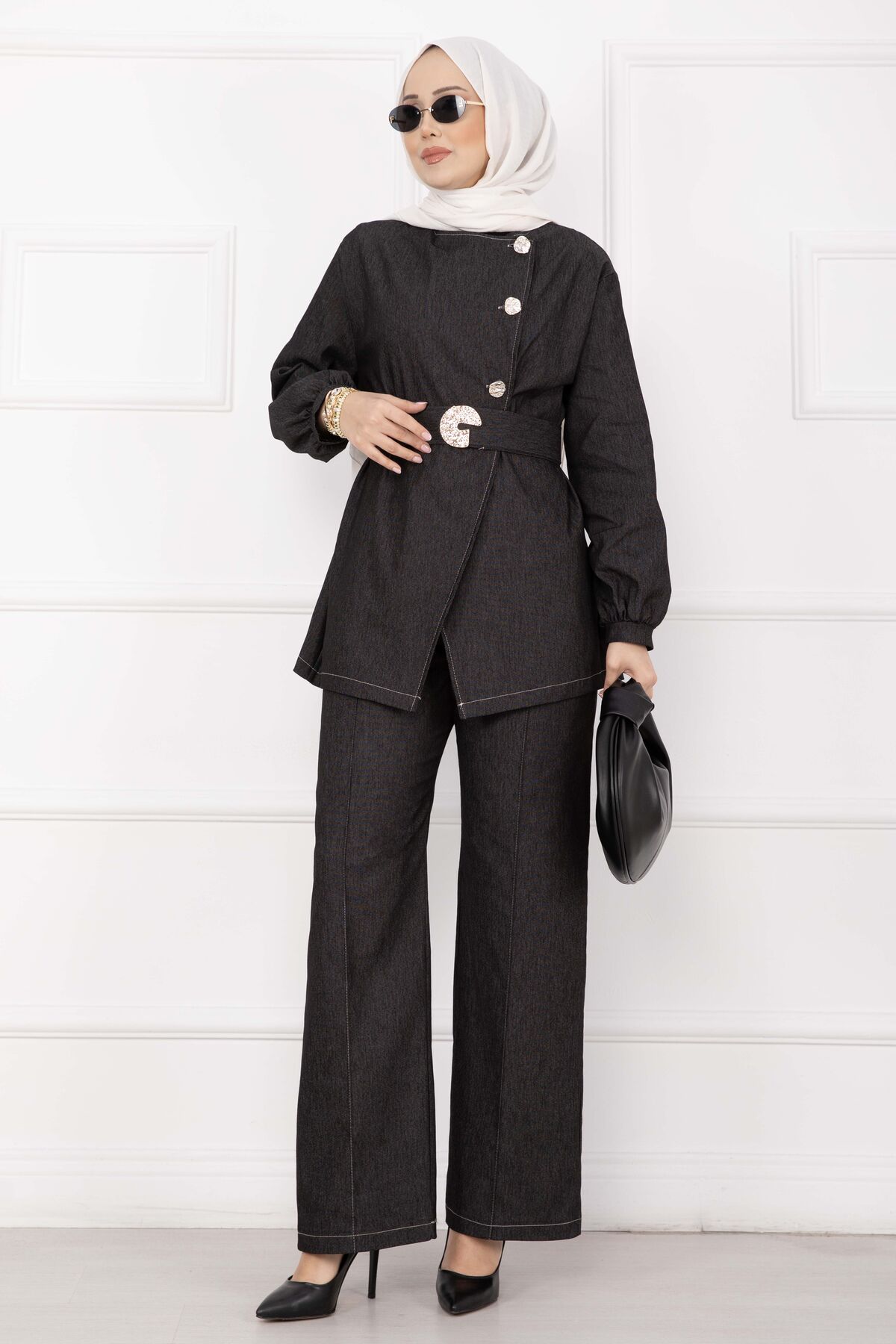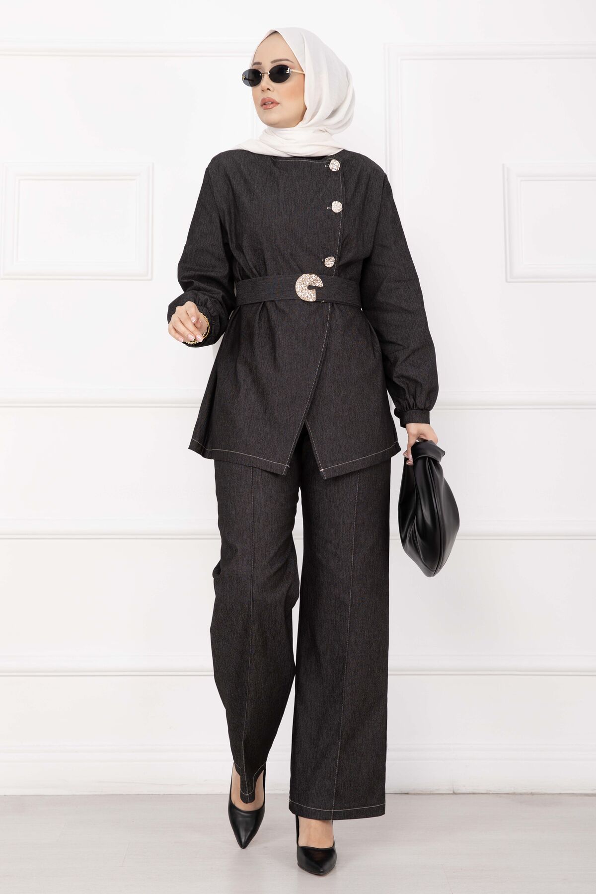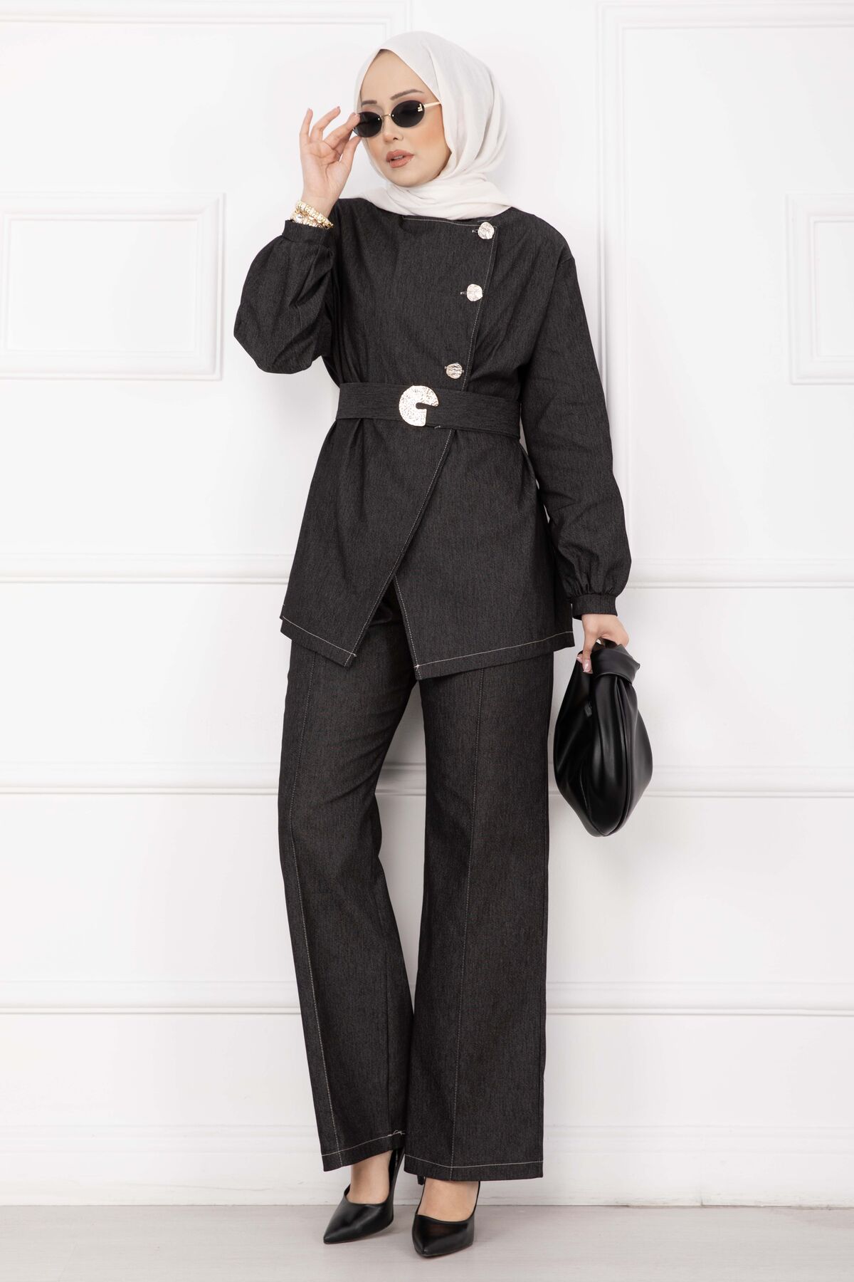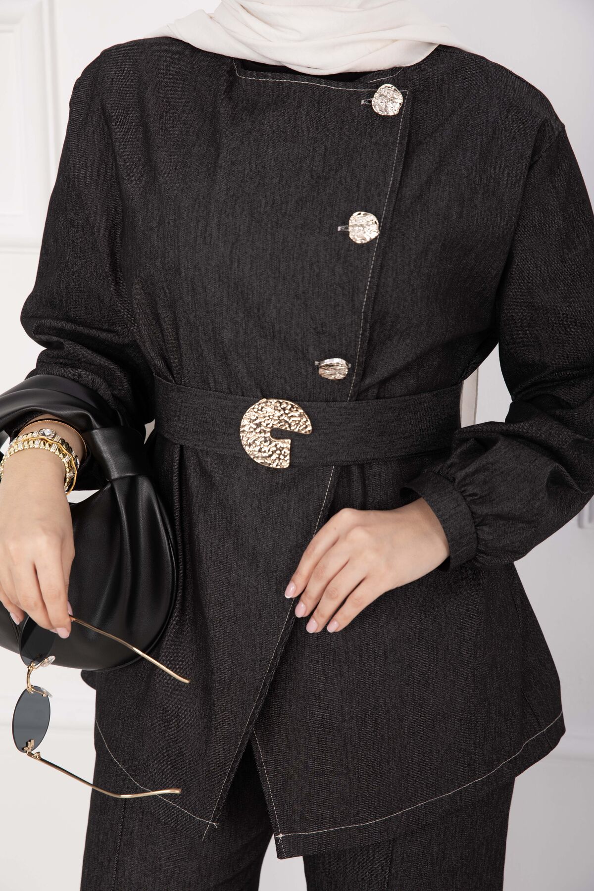Premium Gold Düğmeli Kemerli Kot Takım Siyah