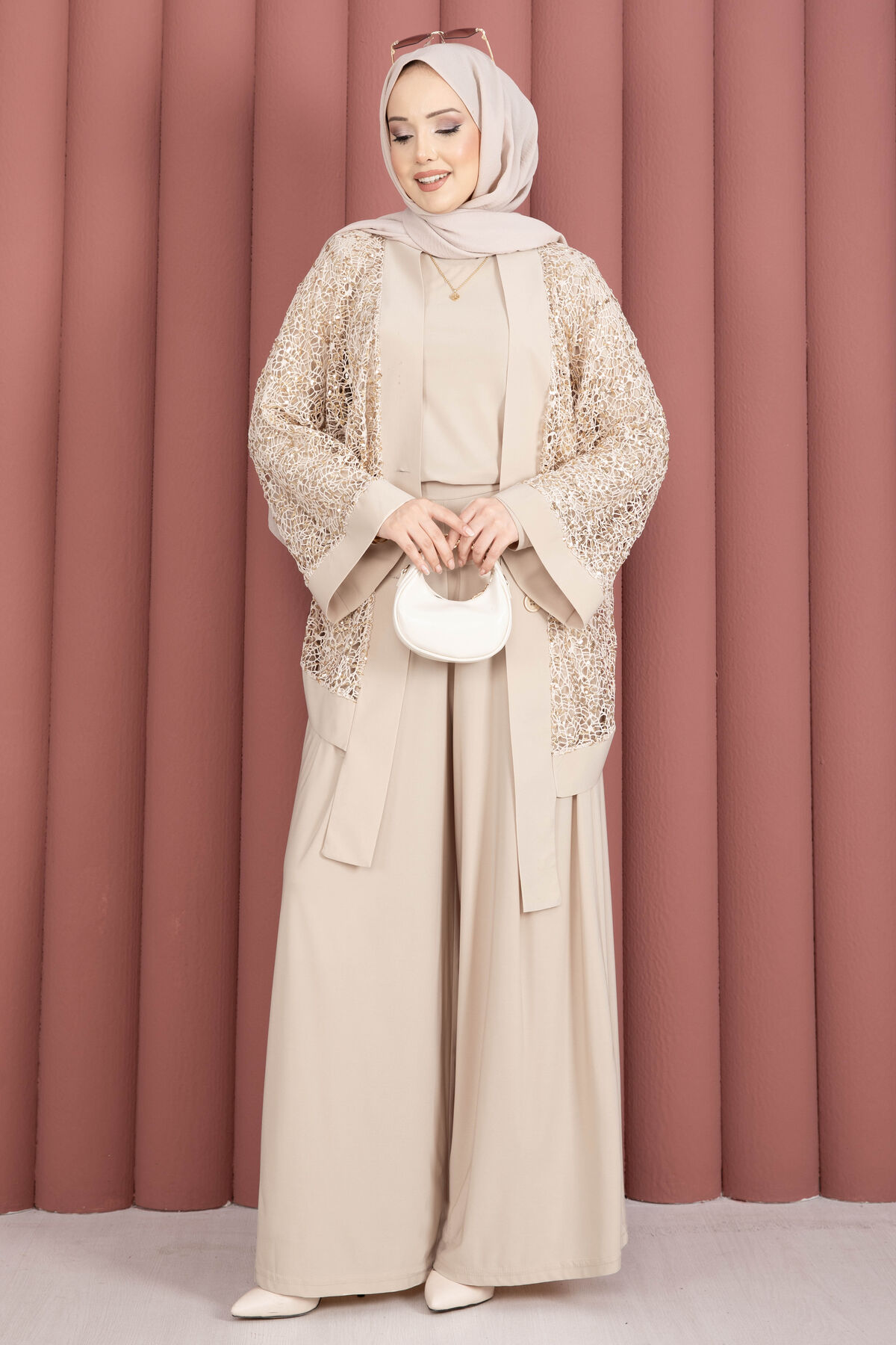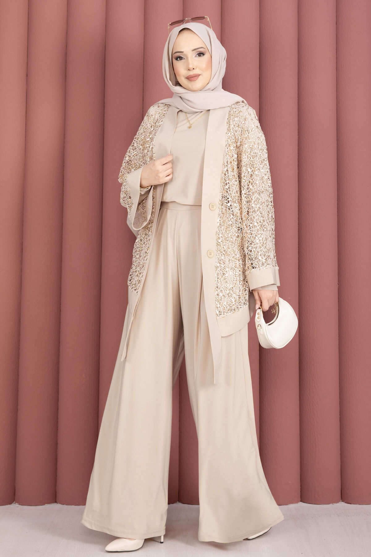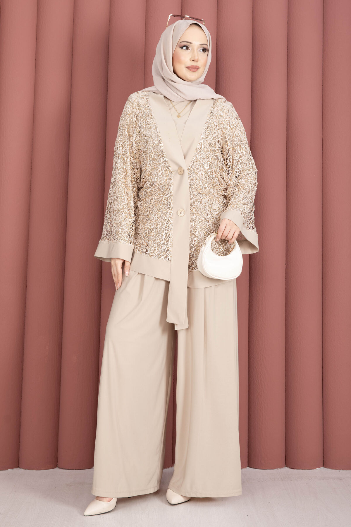 Pul Payetli Ajurlu Üçlü Takım Bej