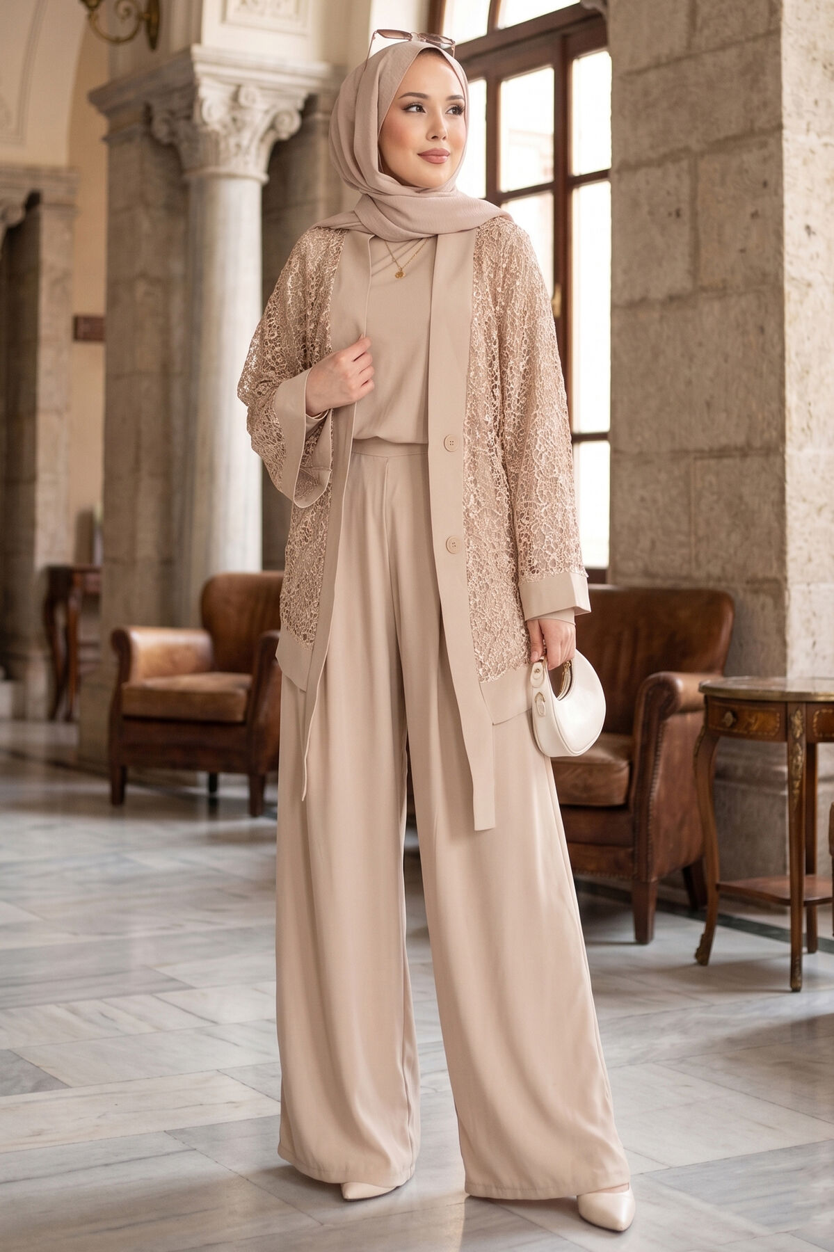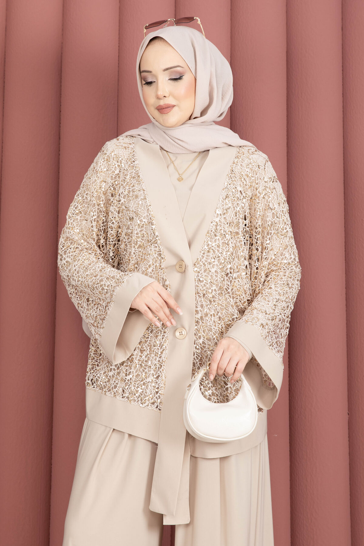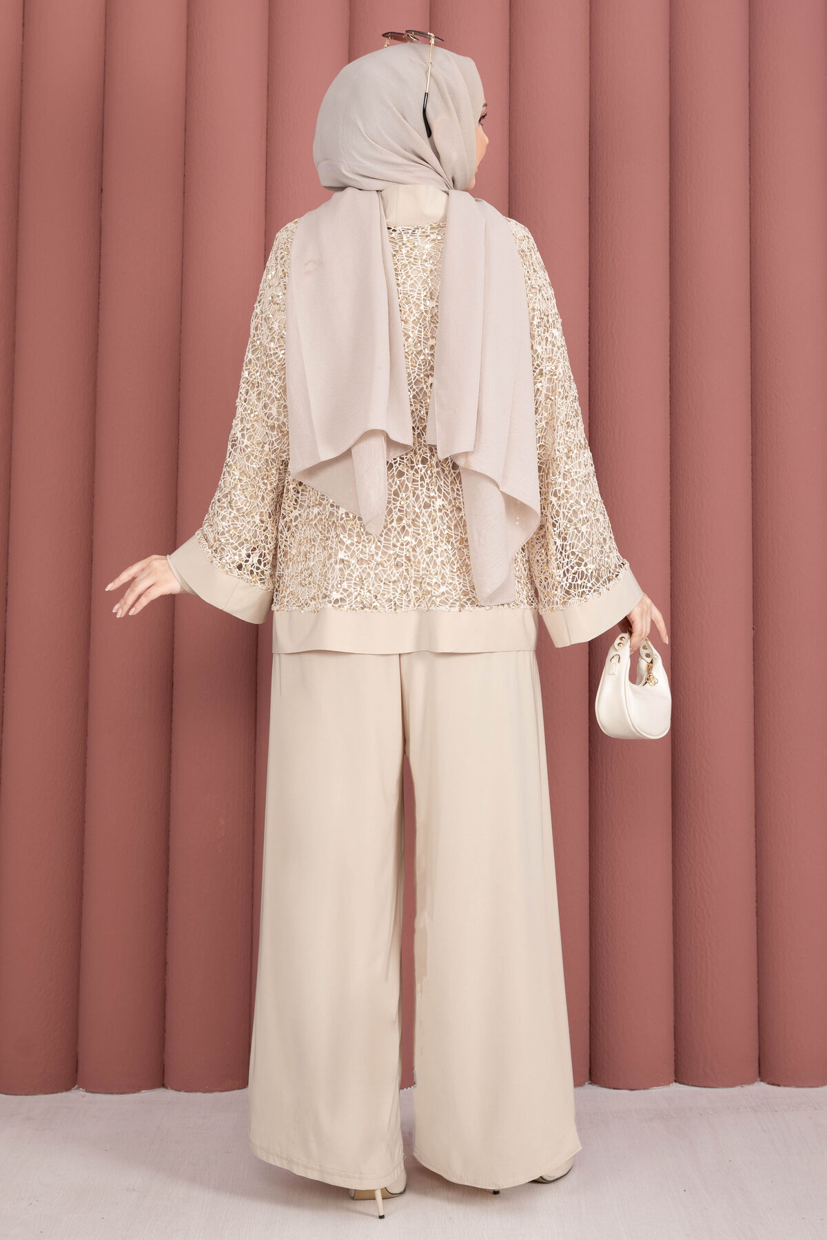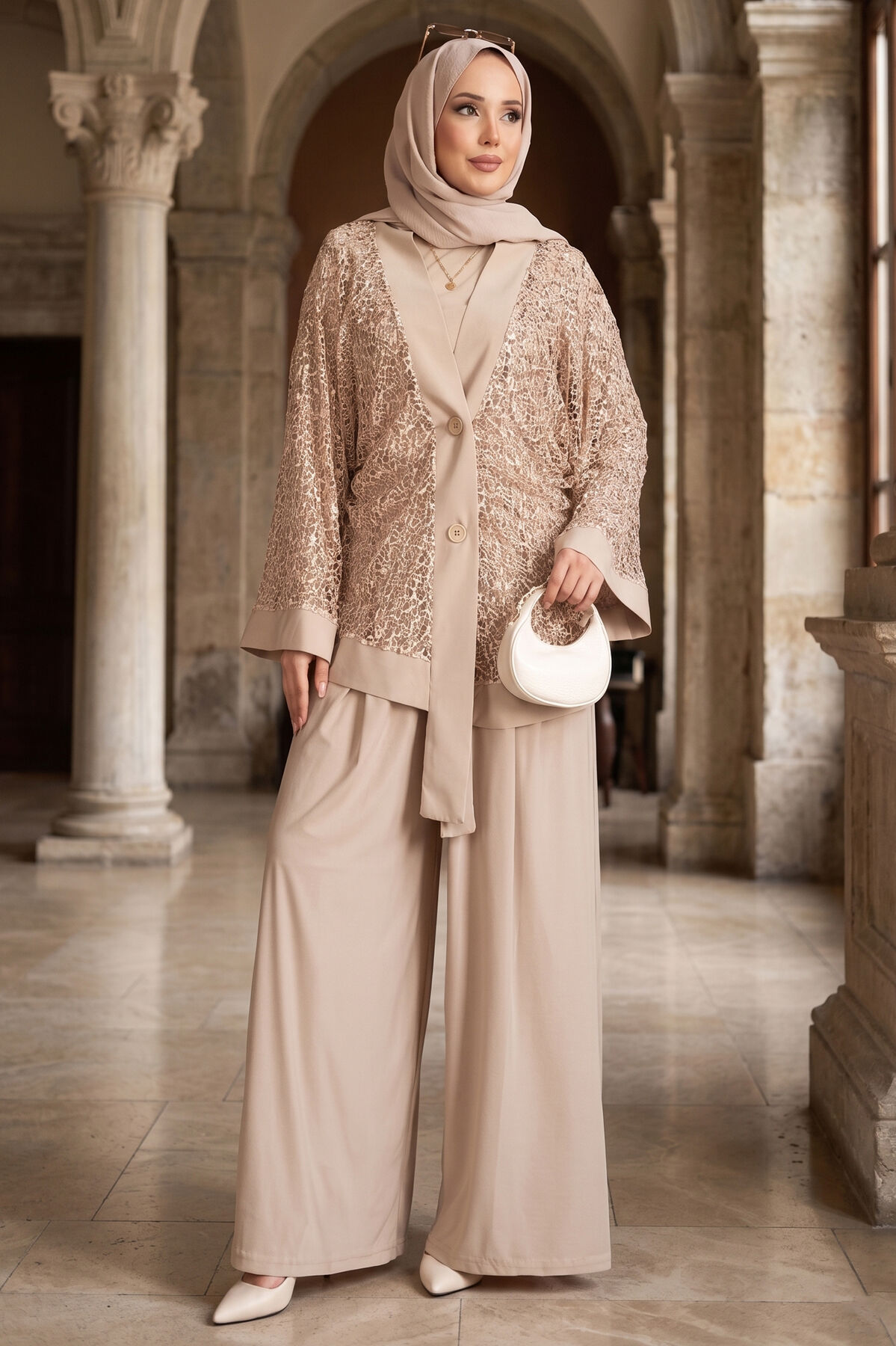 Pul Payetli Ajurlu Üçlü Takım Bej