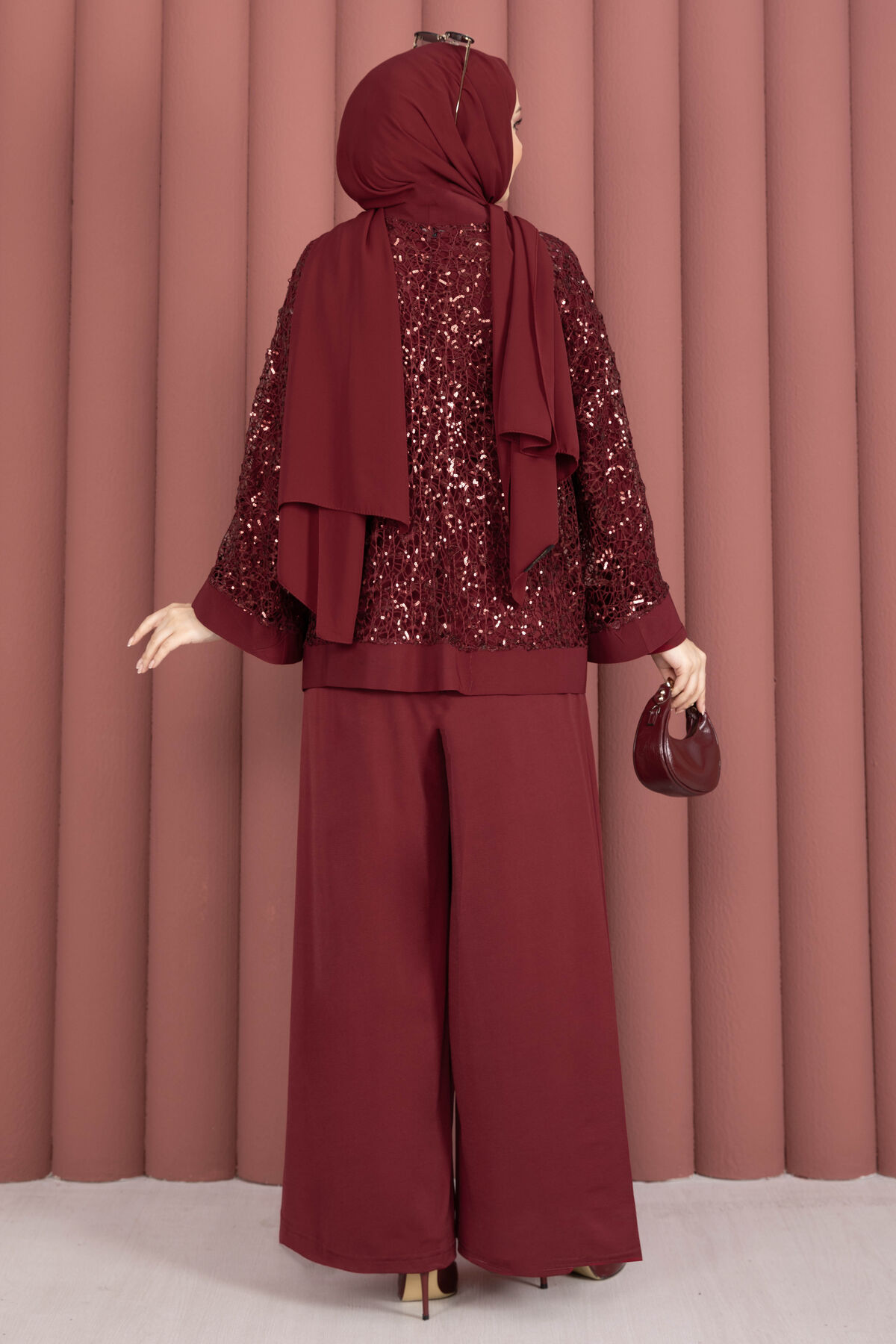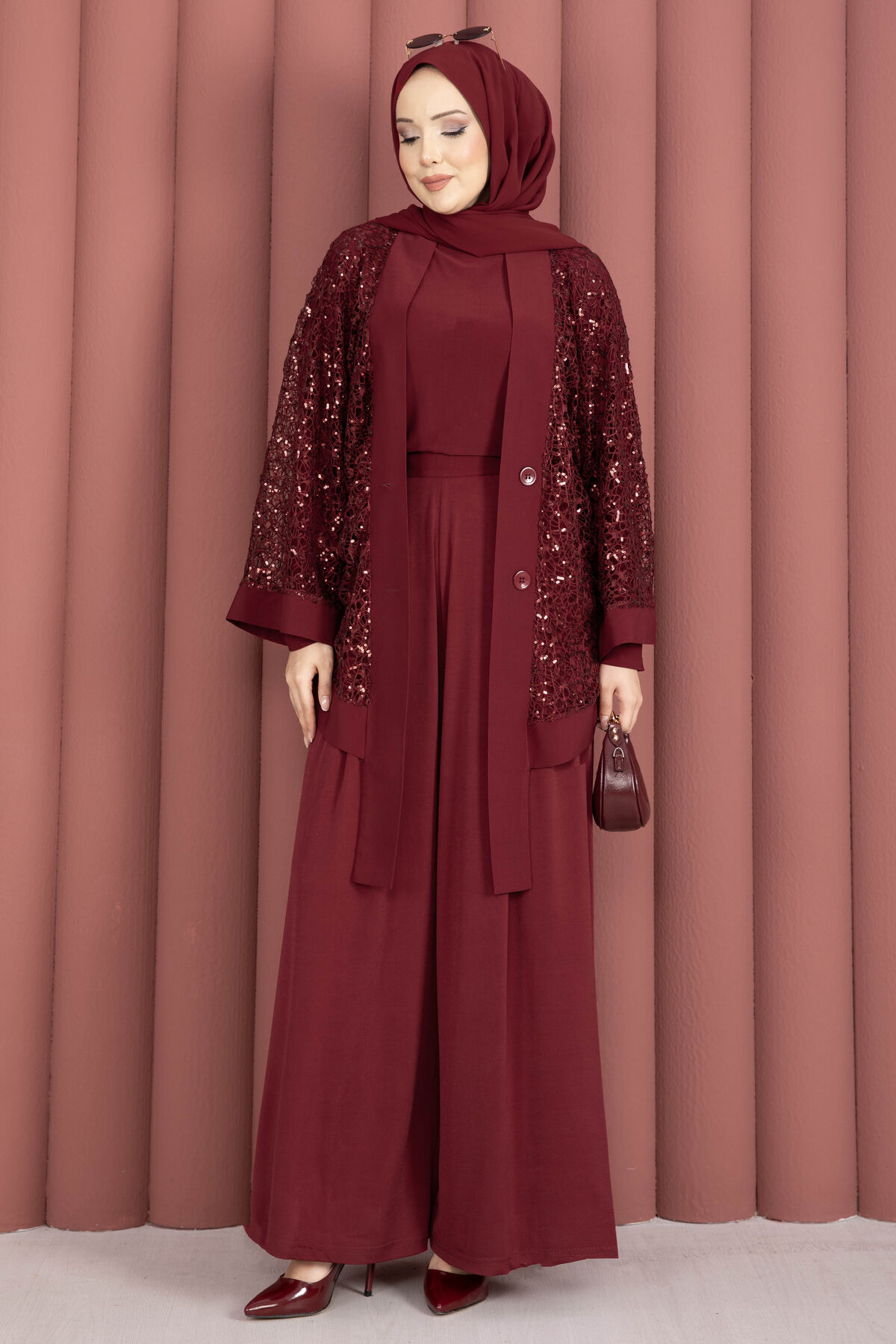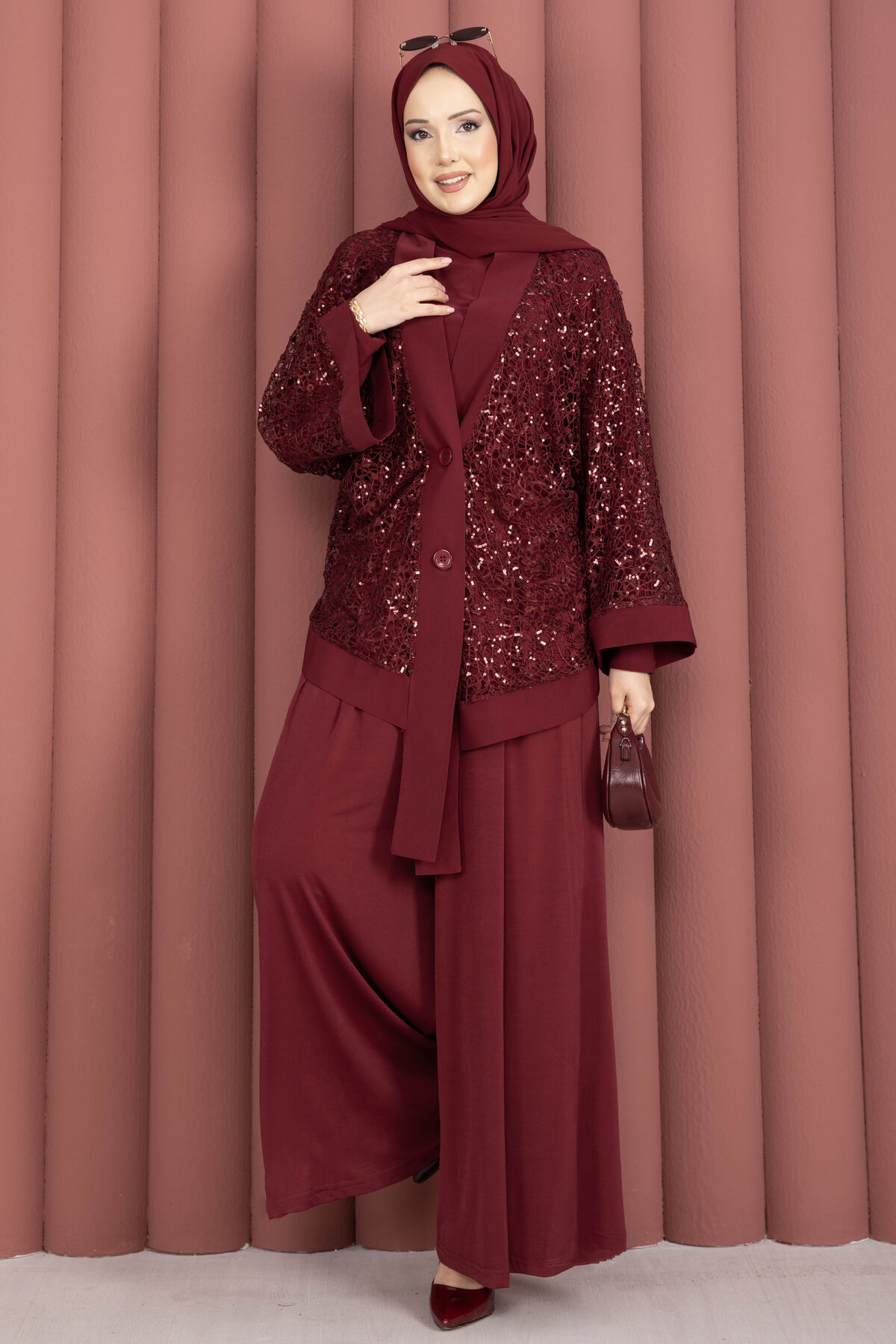 Pul Payetli Ajurlu Üçlü Takım Bordo