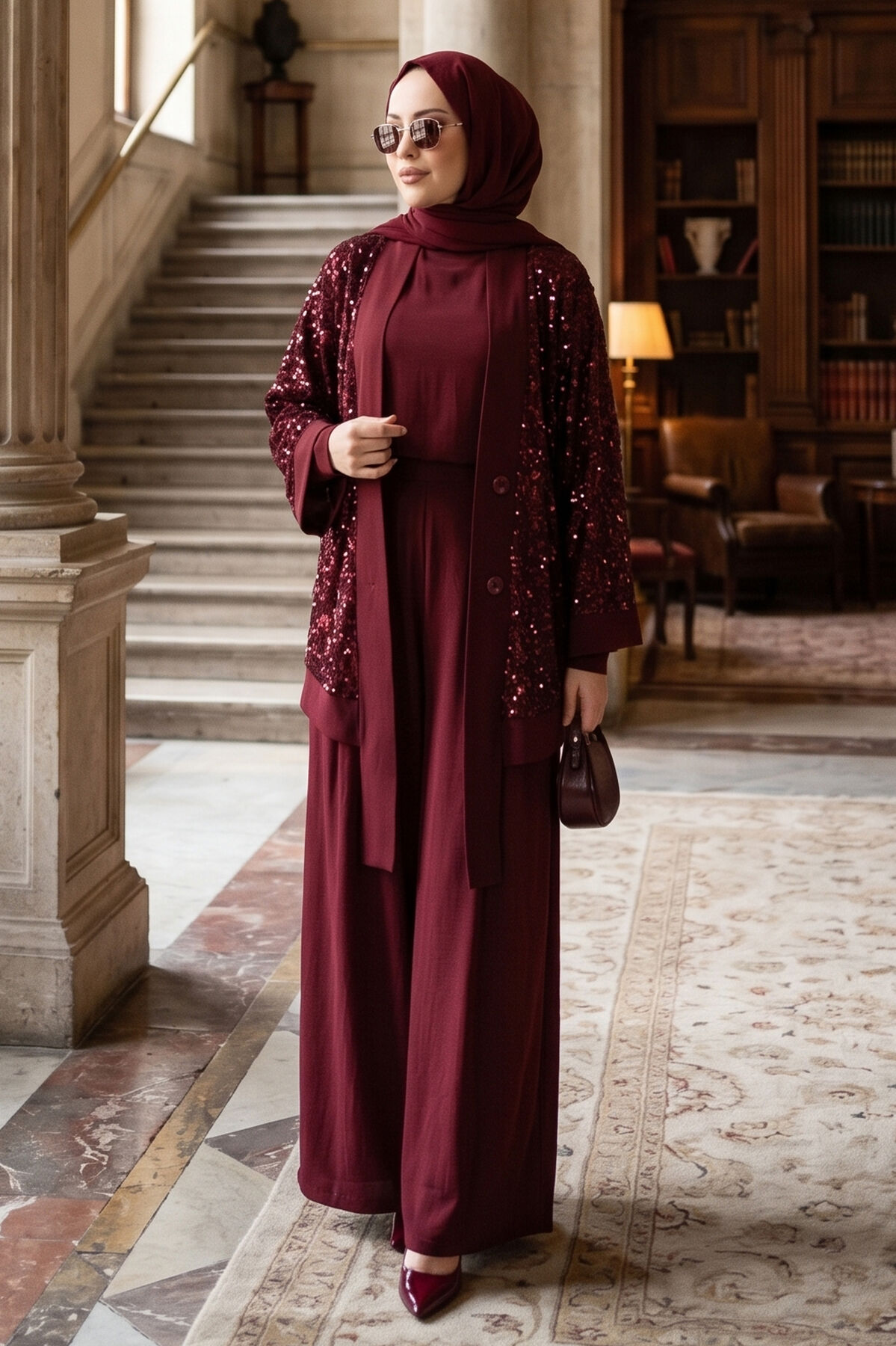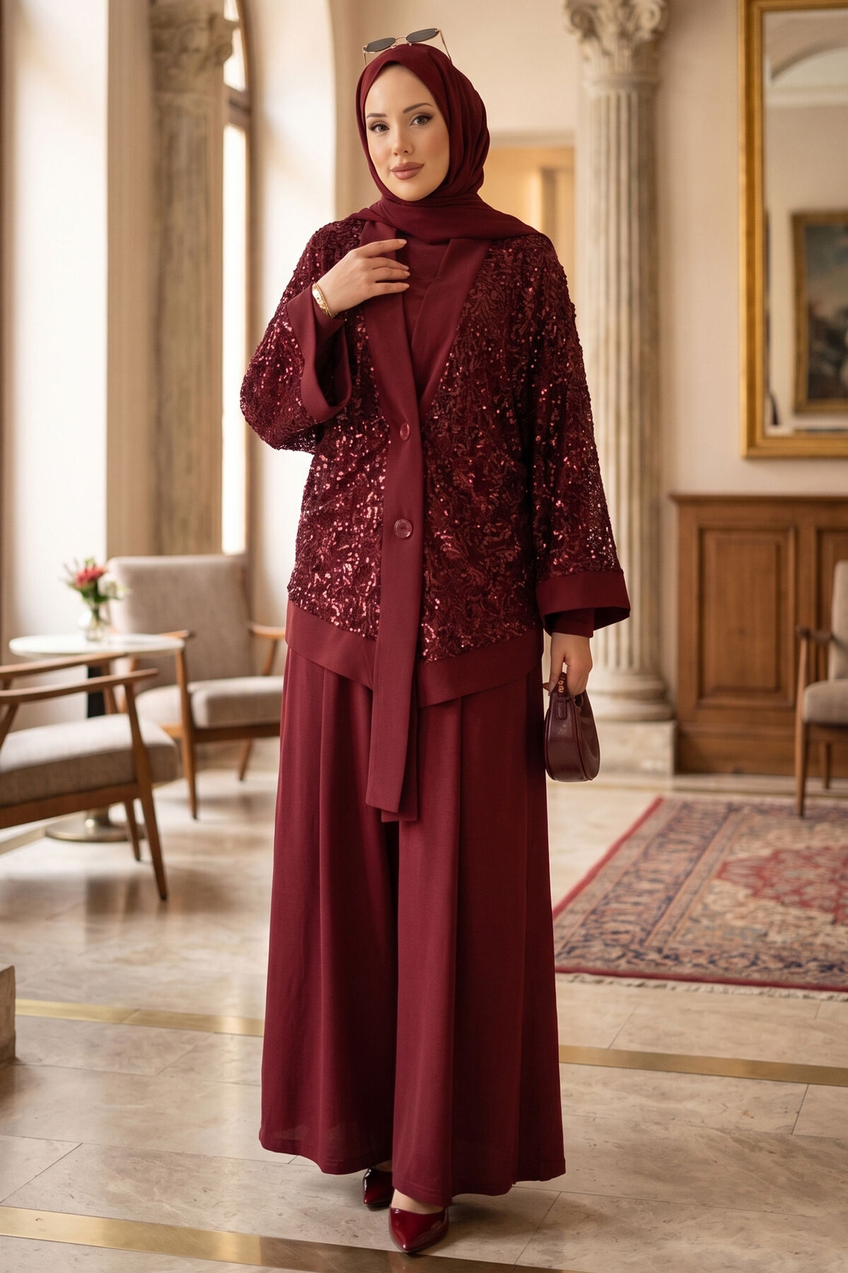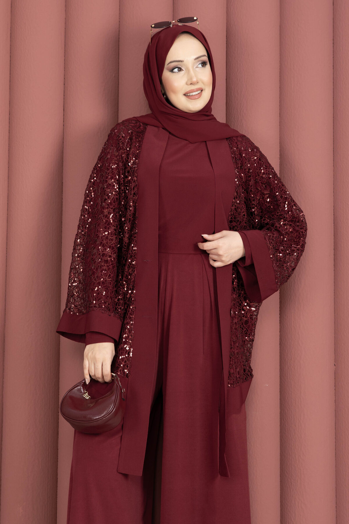 Pul Payetli Ajurlu Üçlü Takım Bordo