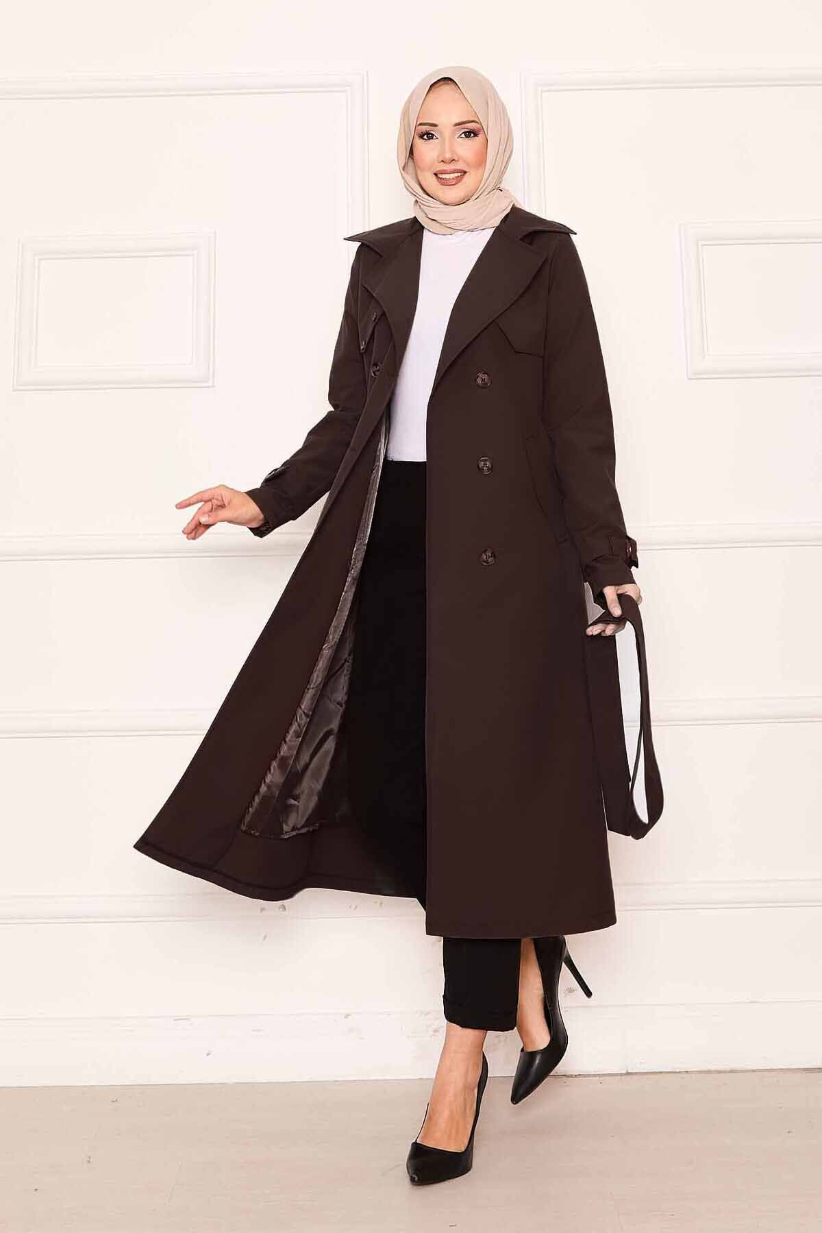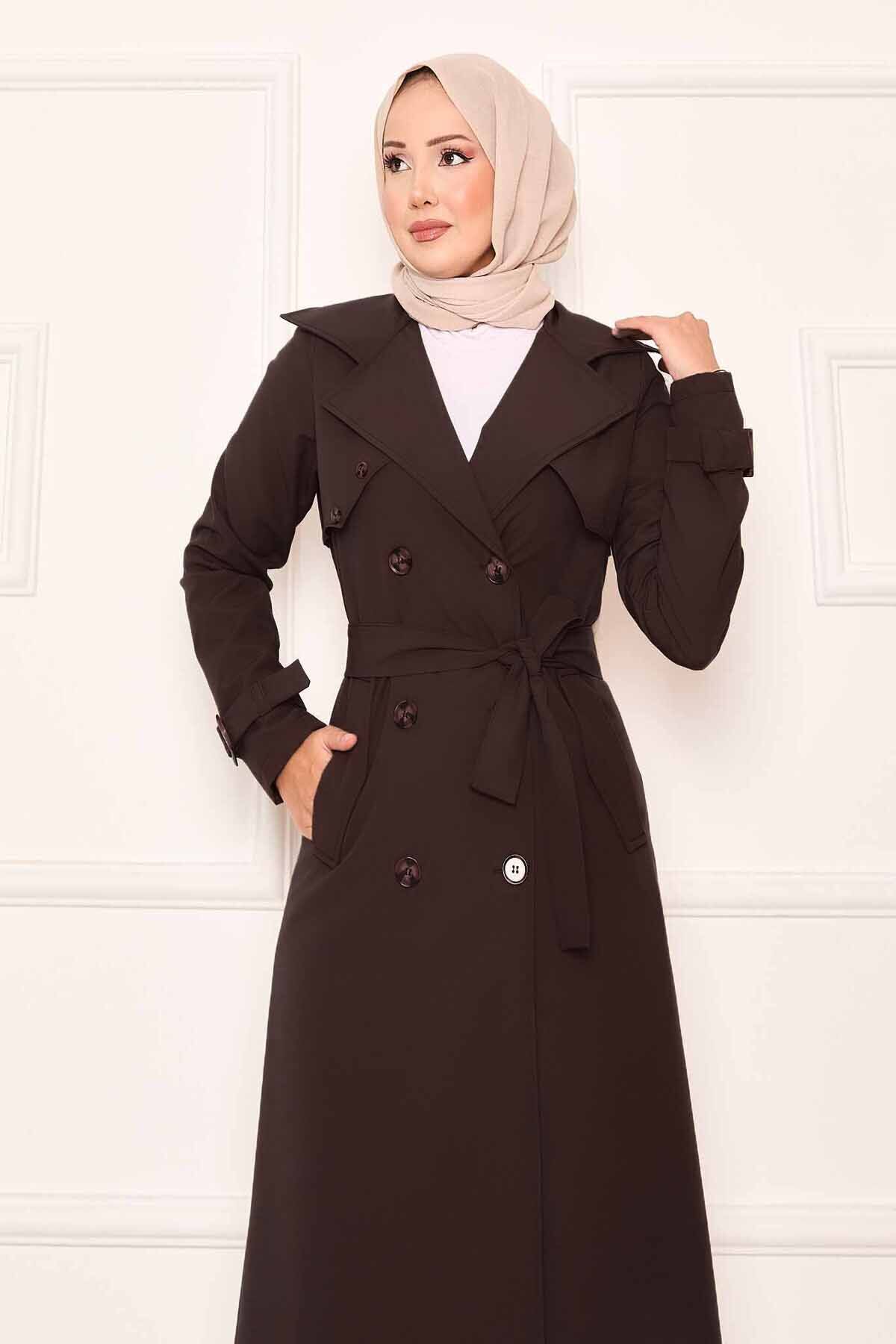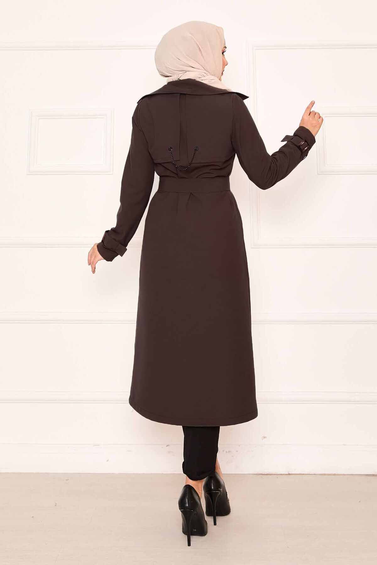 Rahat Kalıp Kruvaze Düğme Detaylı Kolları Ayarlanan Trençkot Kahve