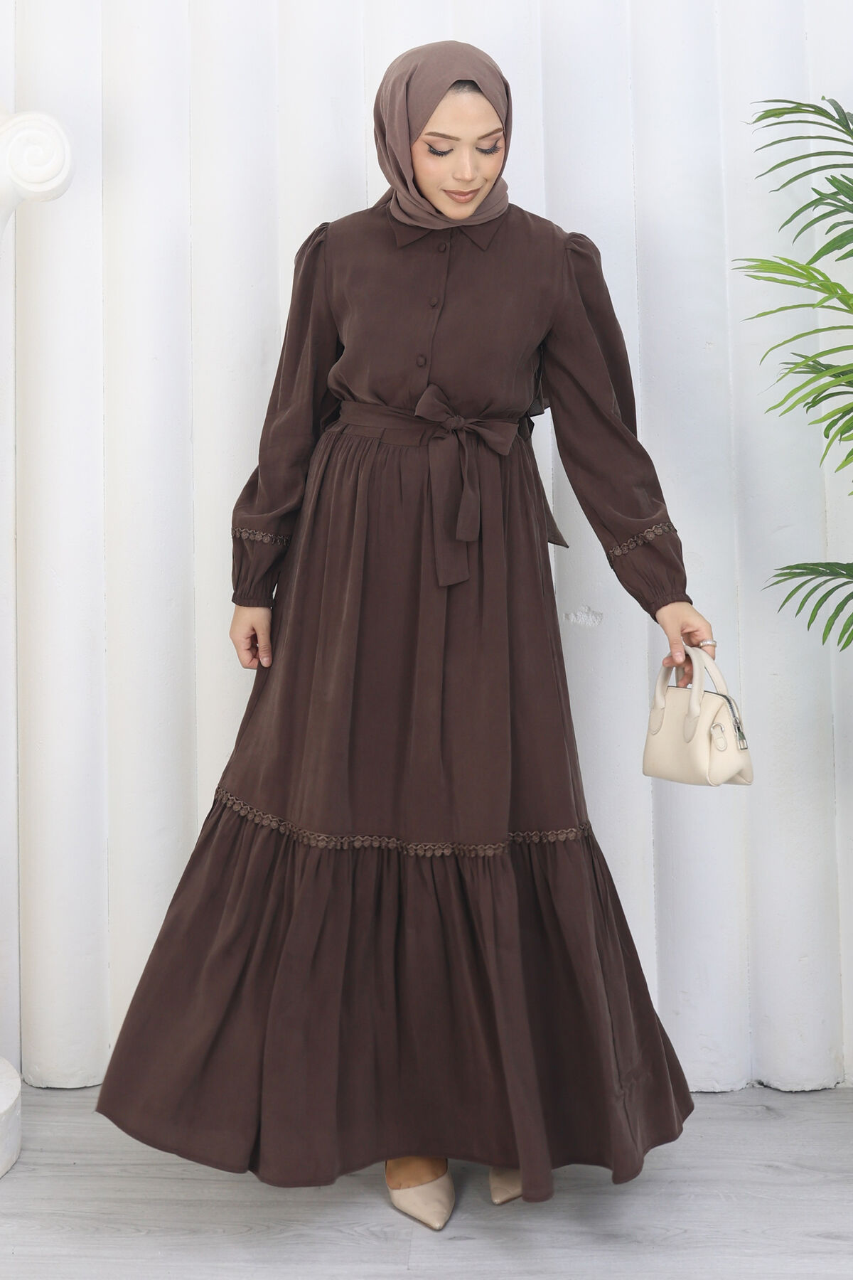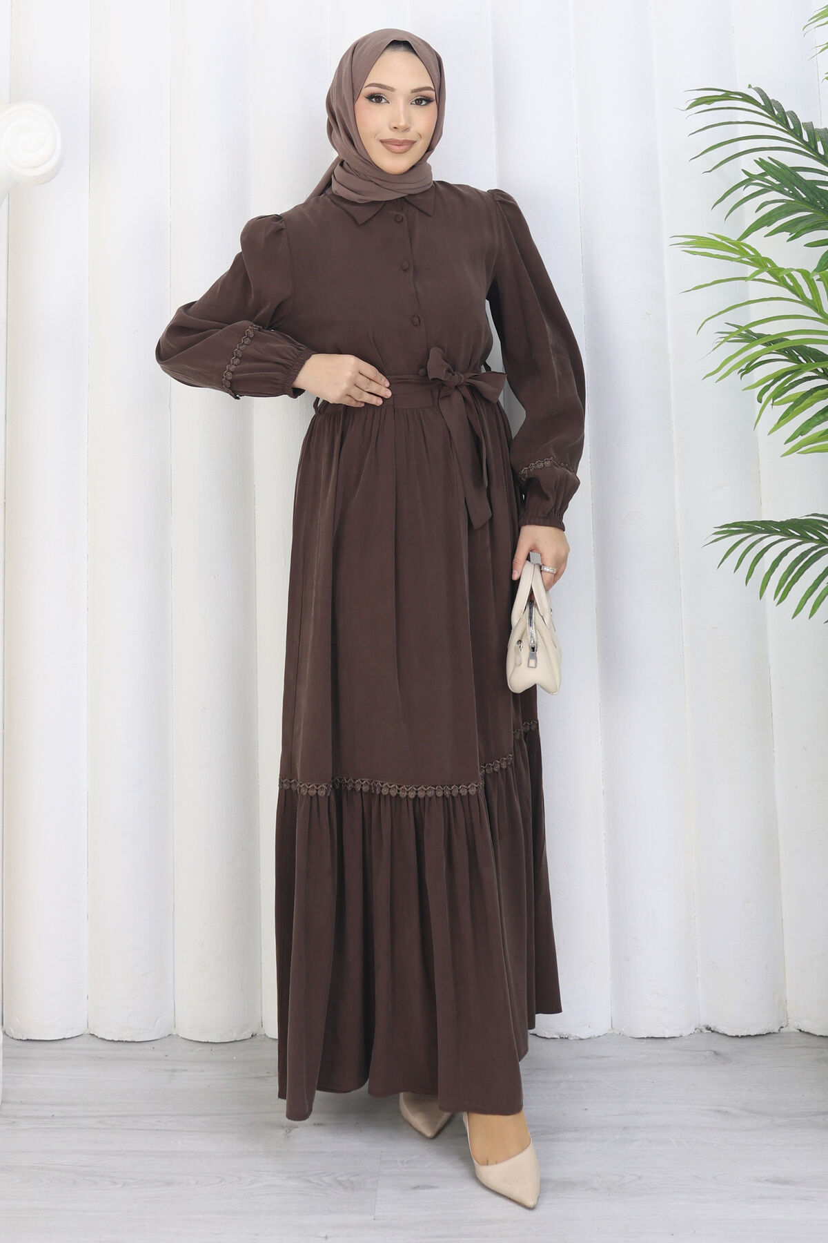 Rose Kuşaklı Yarım Düğmeli Elbise Kahve