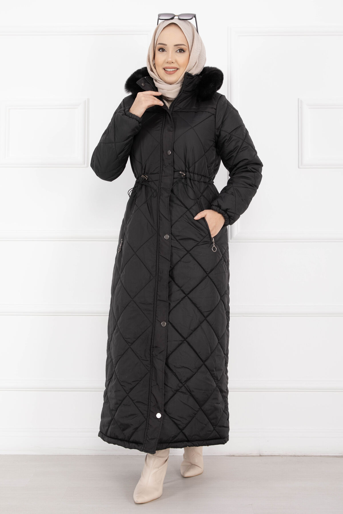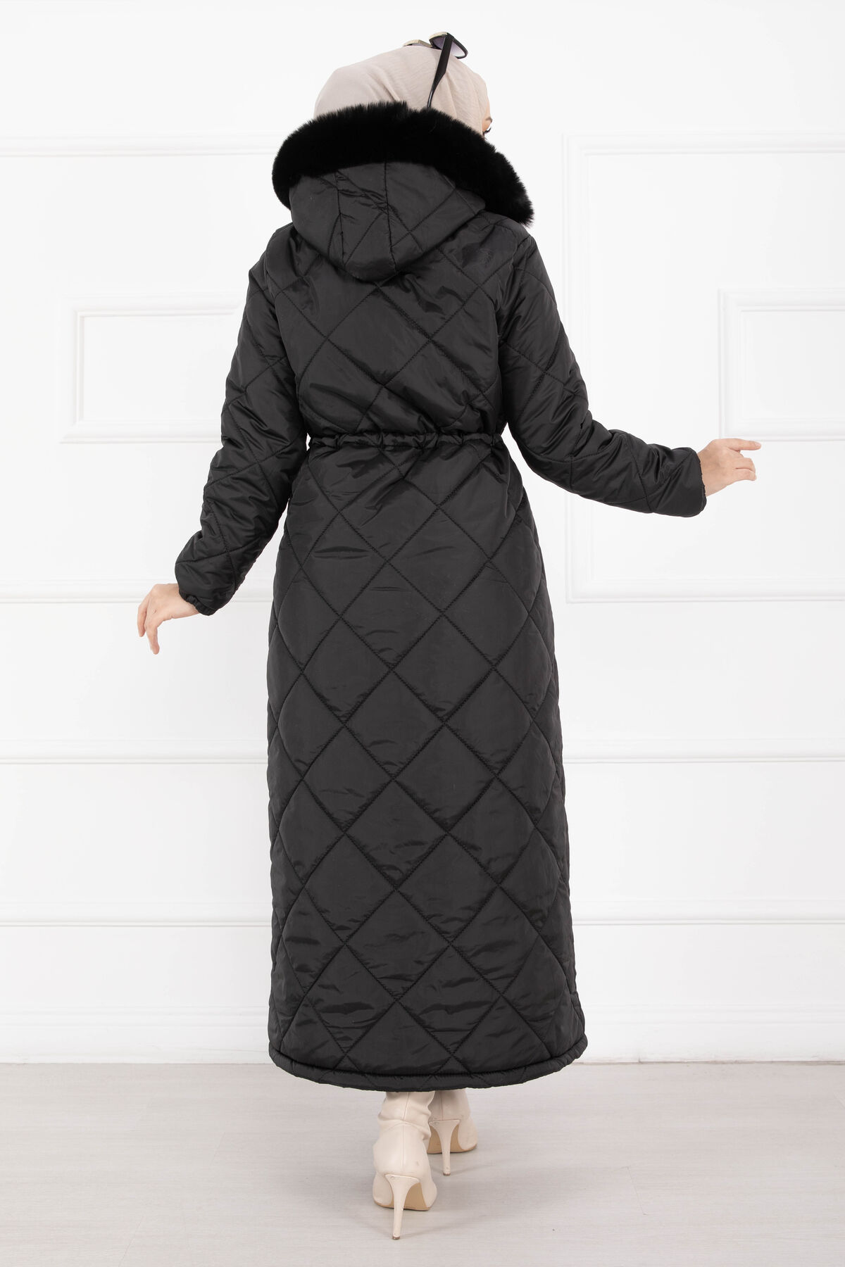 Royal Kapitone Kürk Kapüşonlu Uzun Şişme Mont Siyah