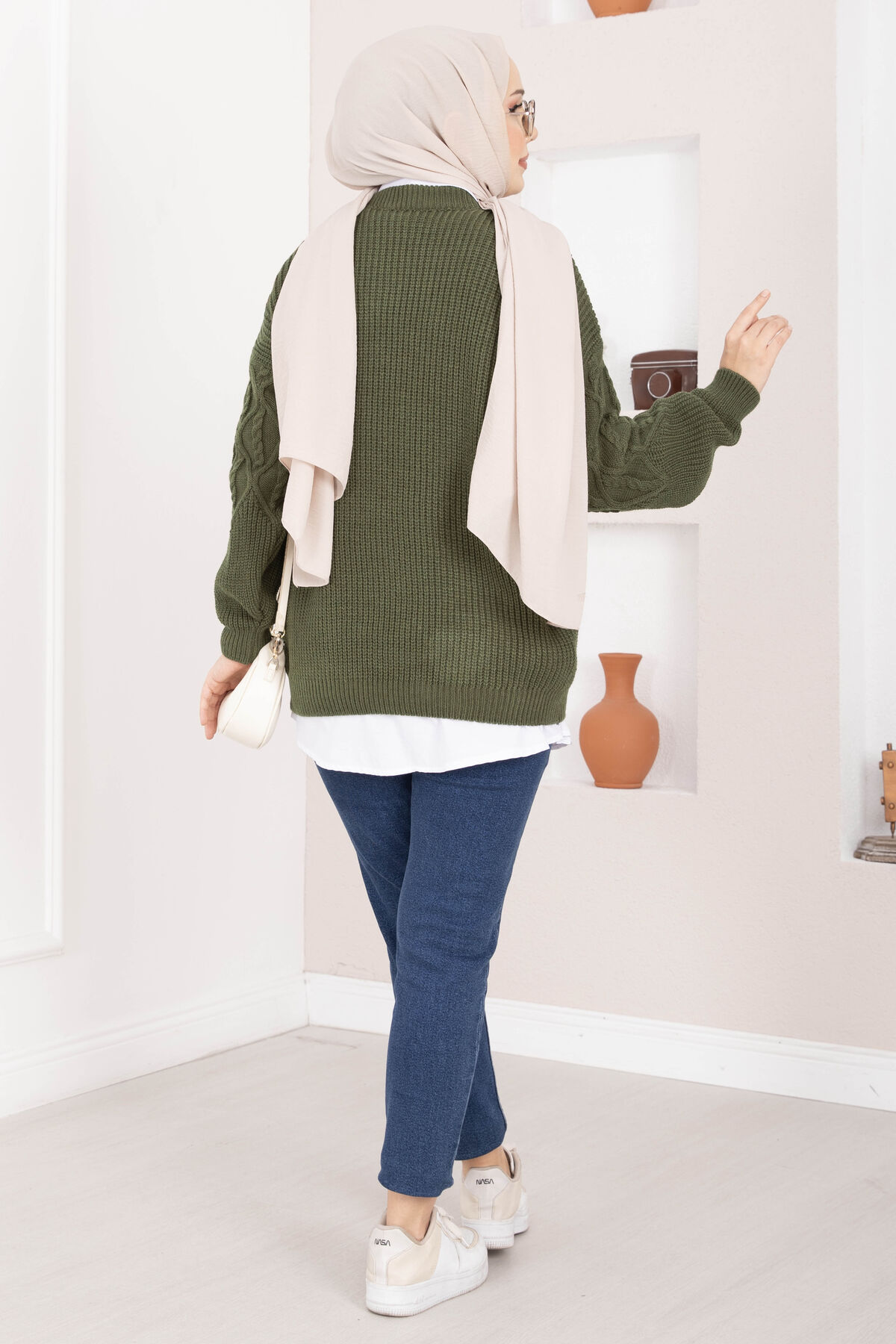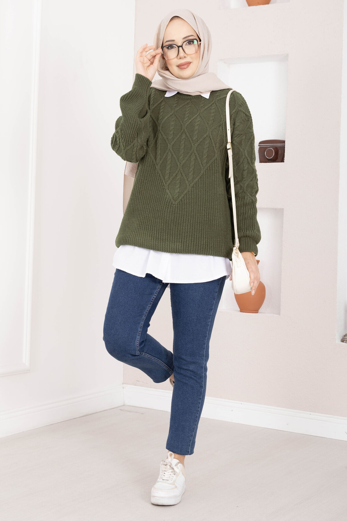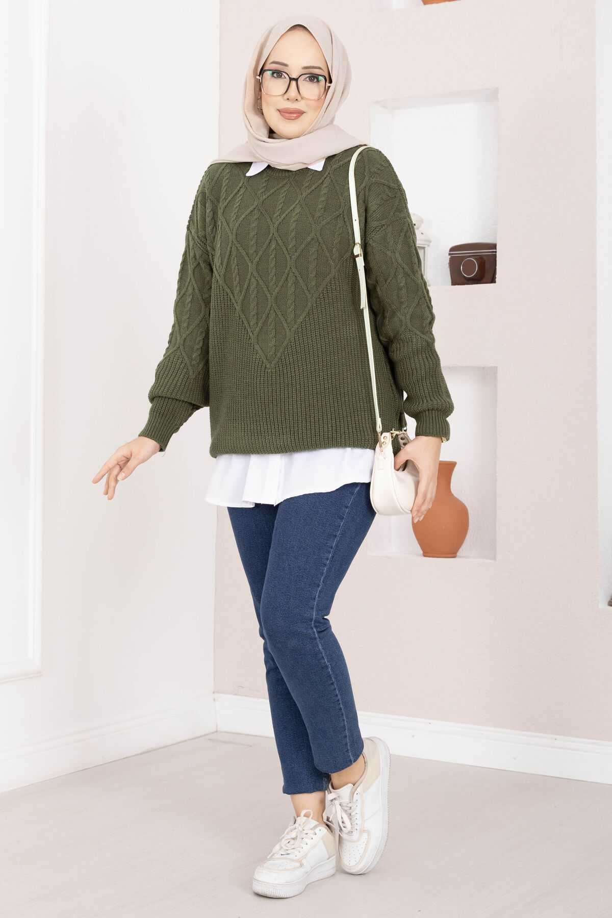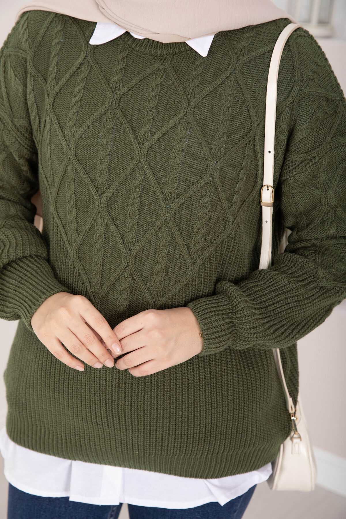 Saç Örgü Desenli Triko Kazak Haki