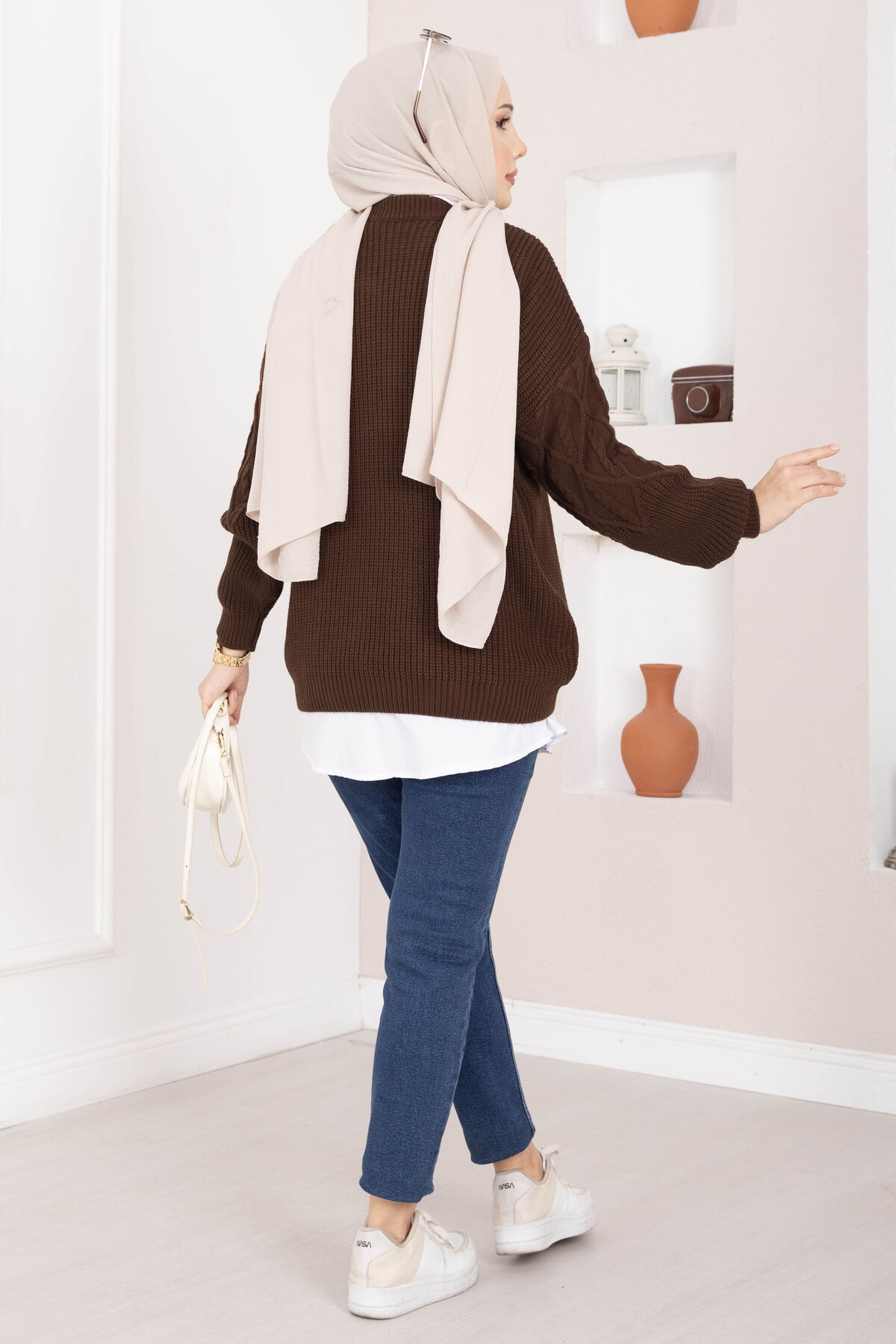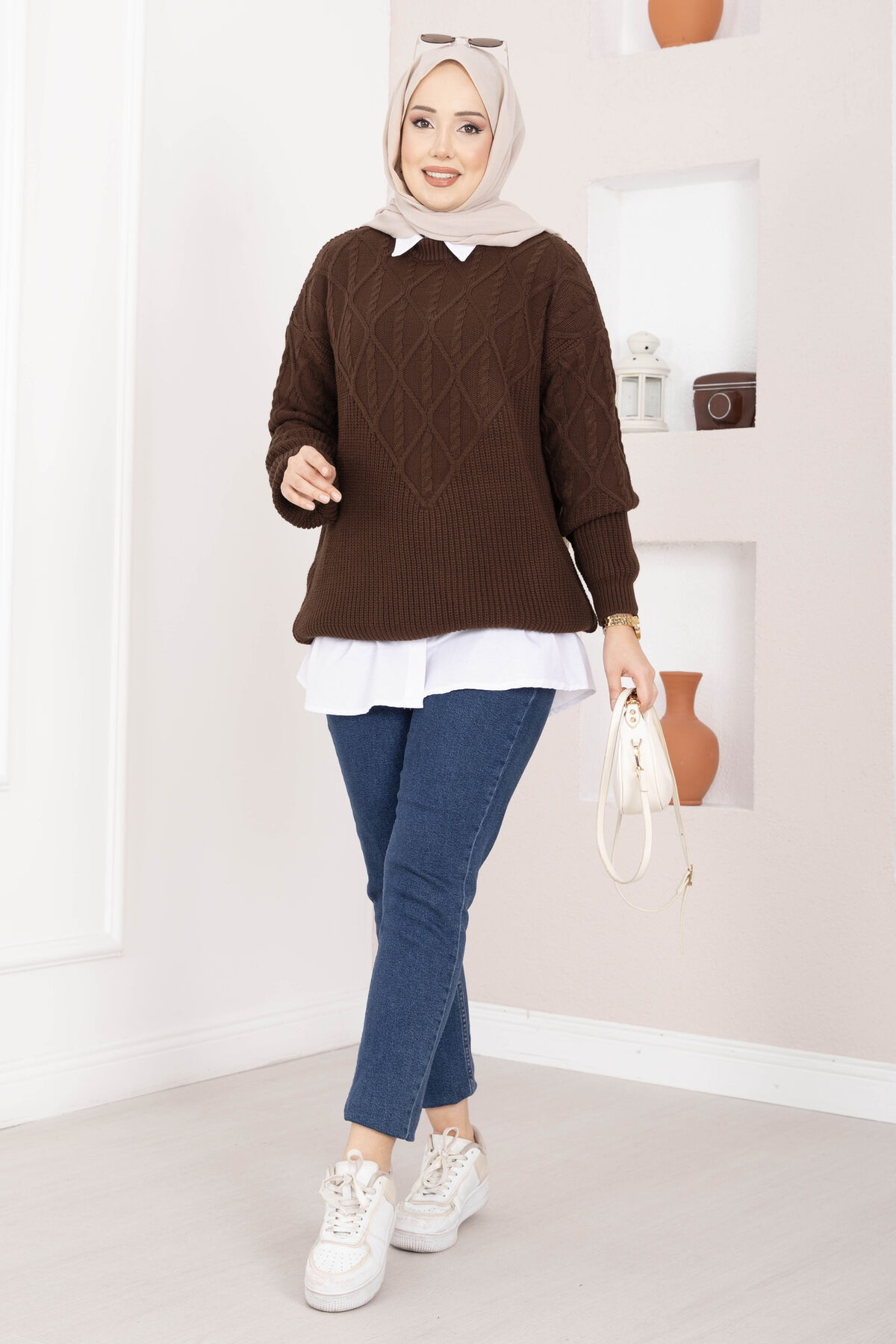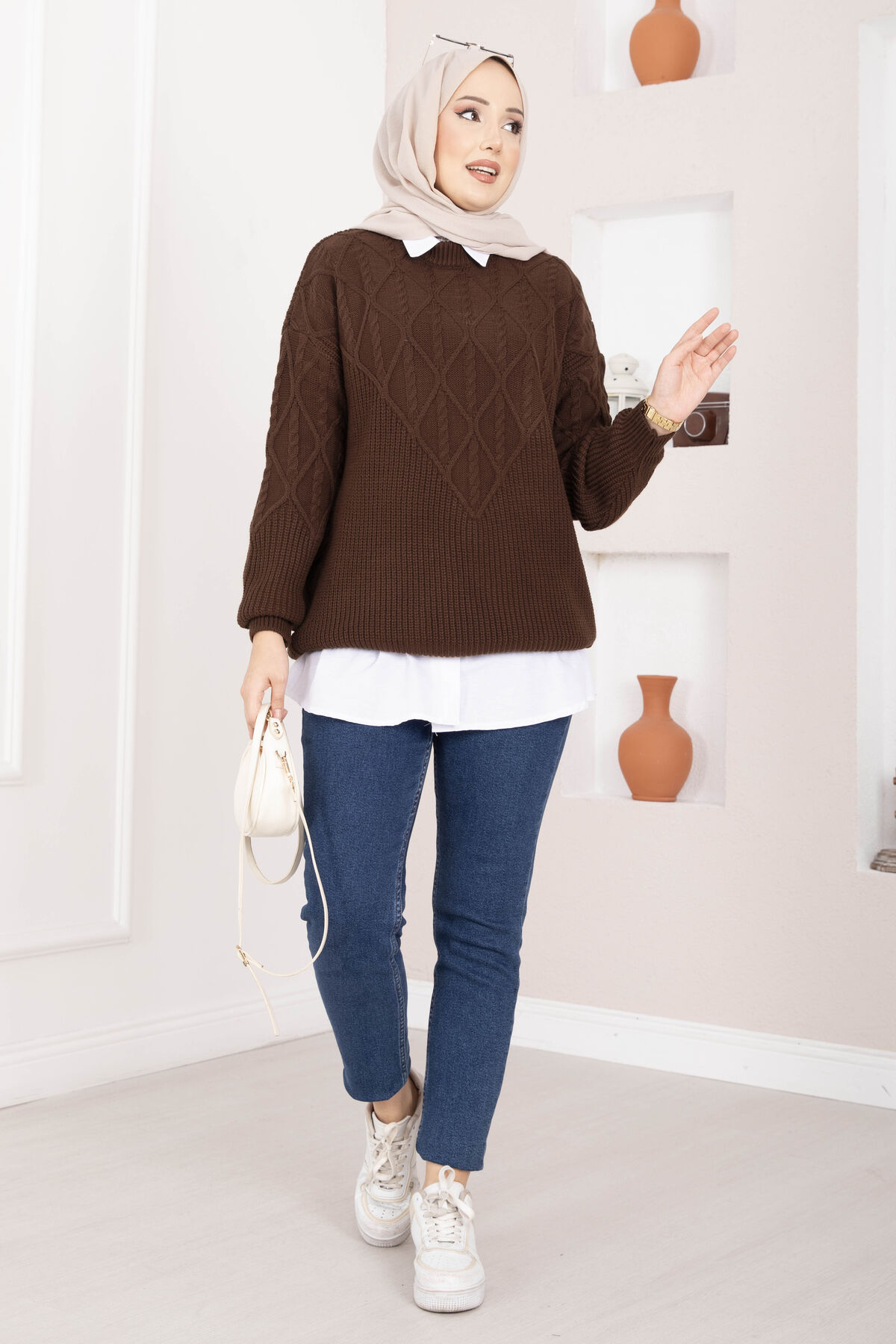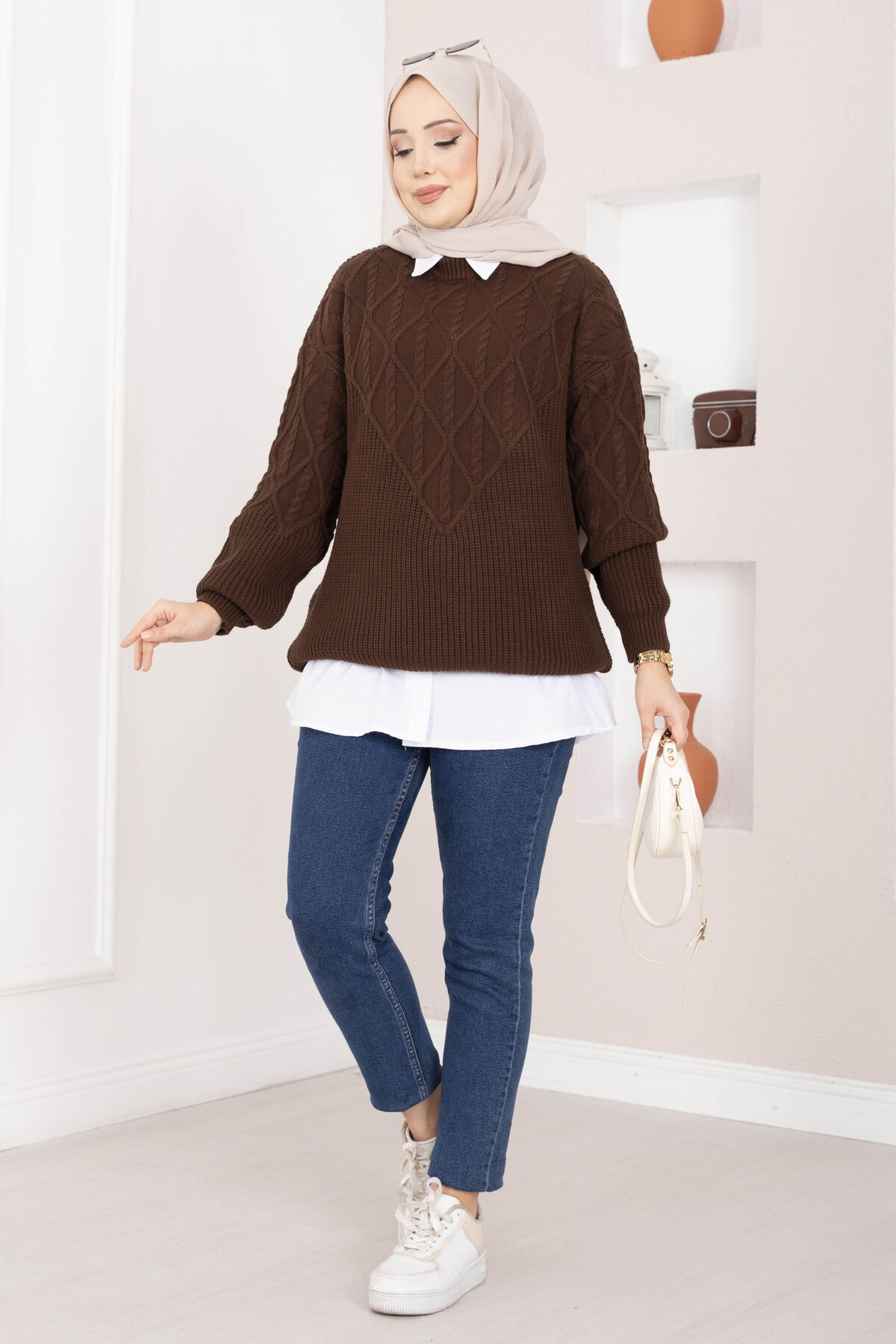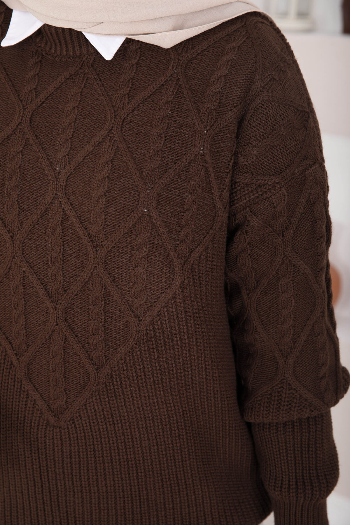 Saç Örgü Desenli Triko Kazak Kahve