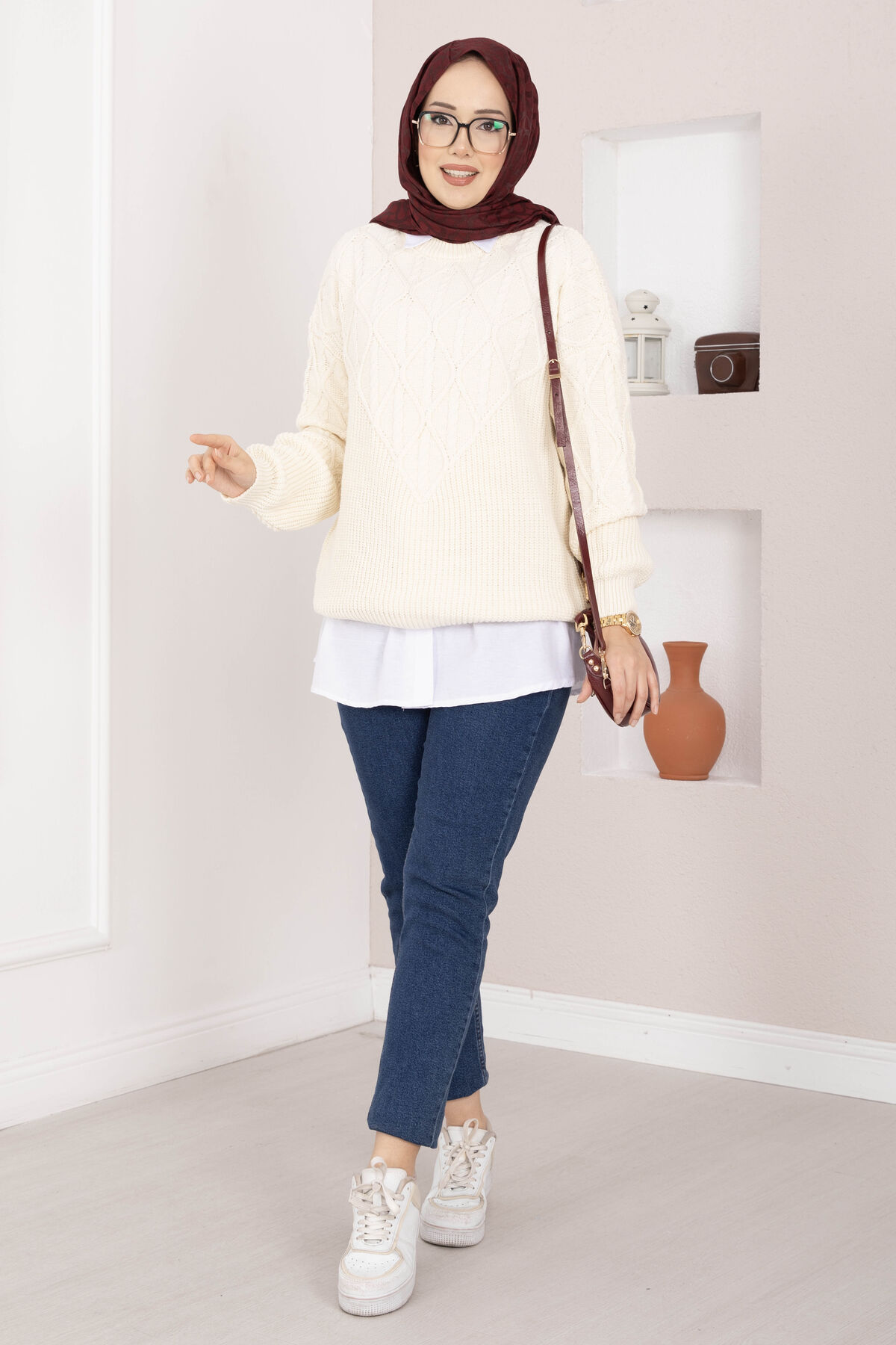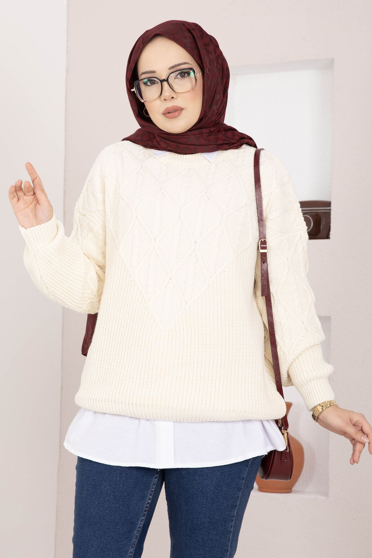 Saç Örgü Desenli Triko Kazak Krem