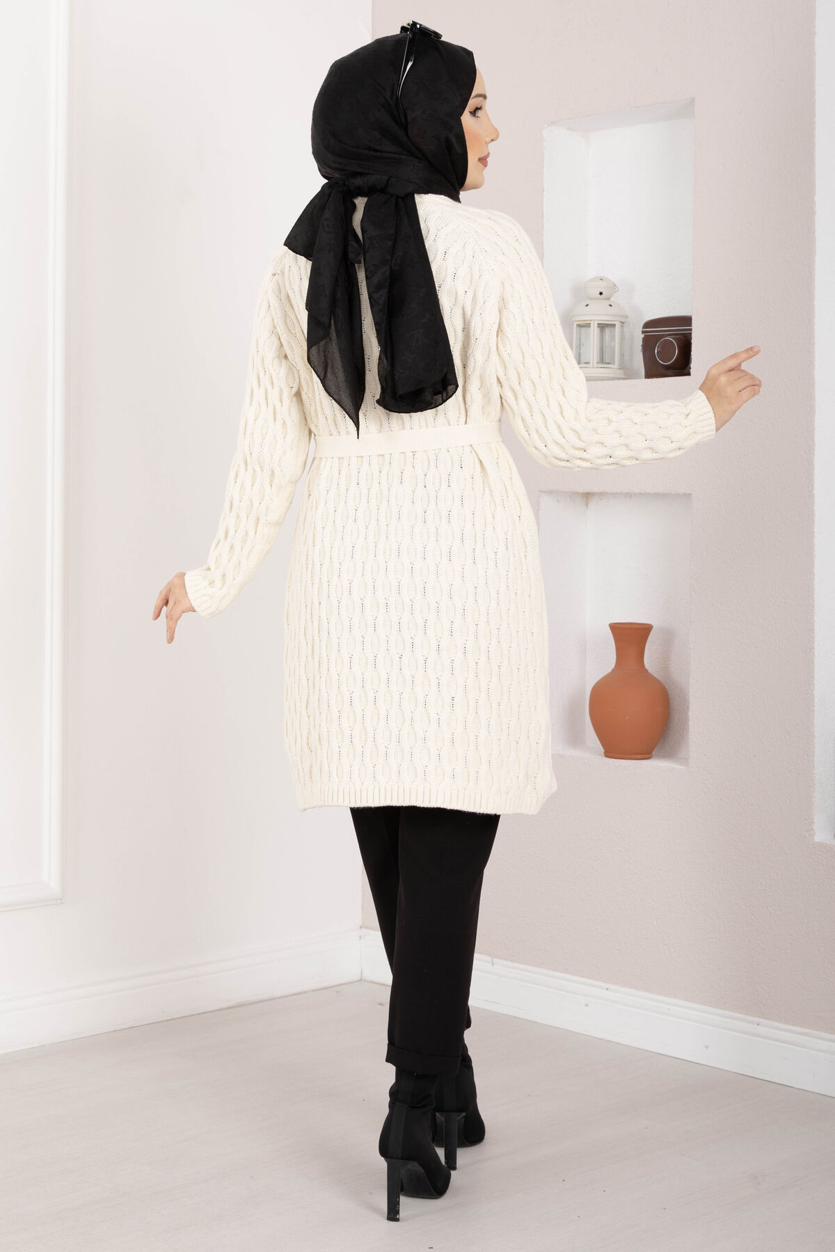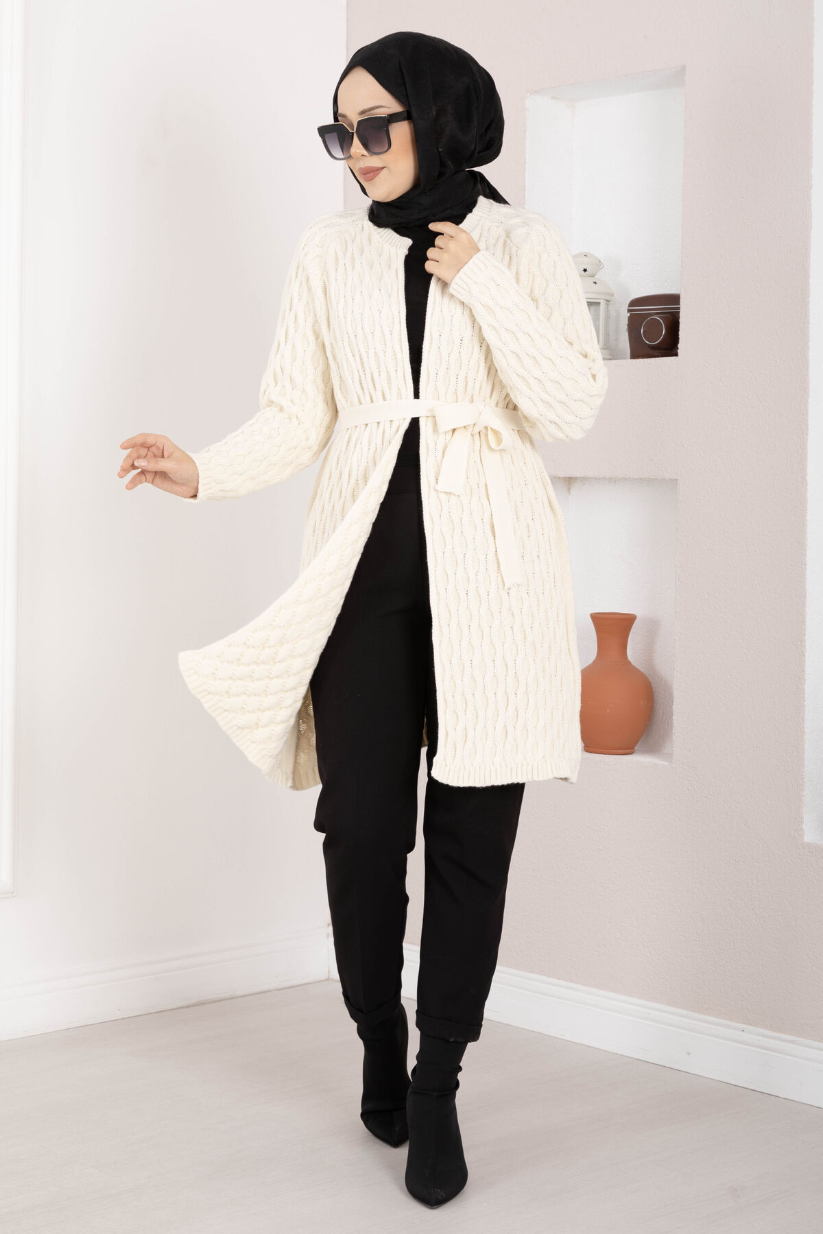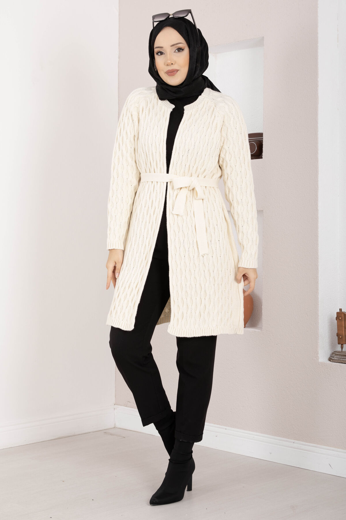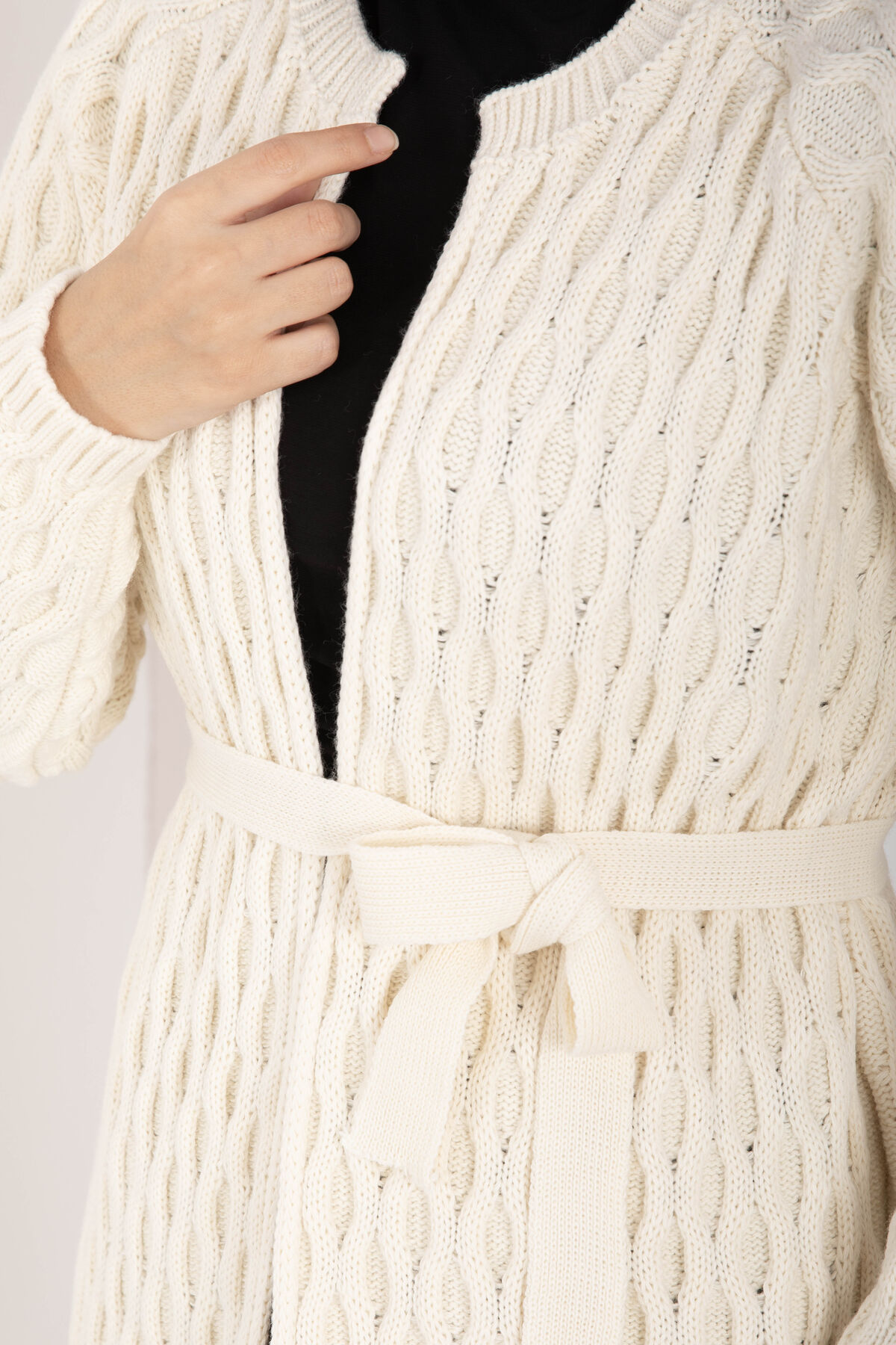 Saç Örgü Kuşaklı Triko Hırka Ekru