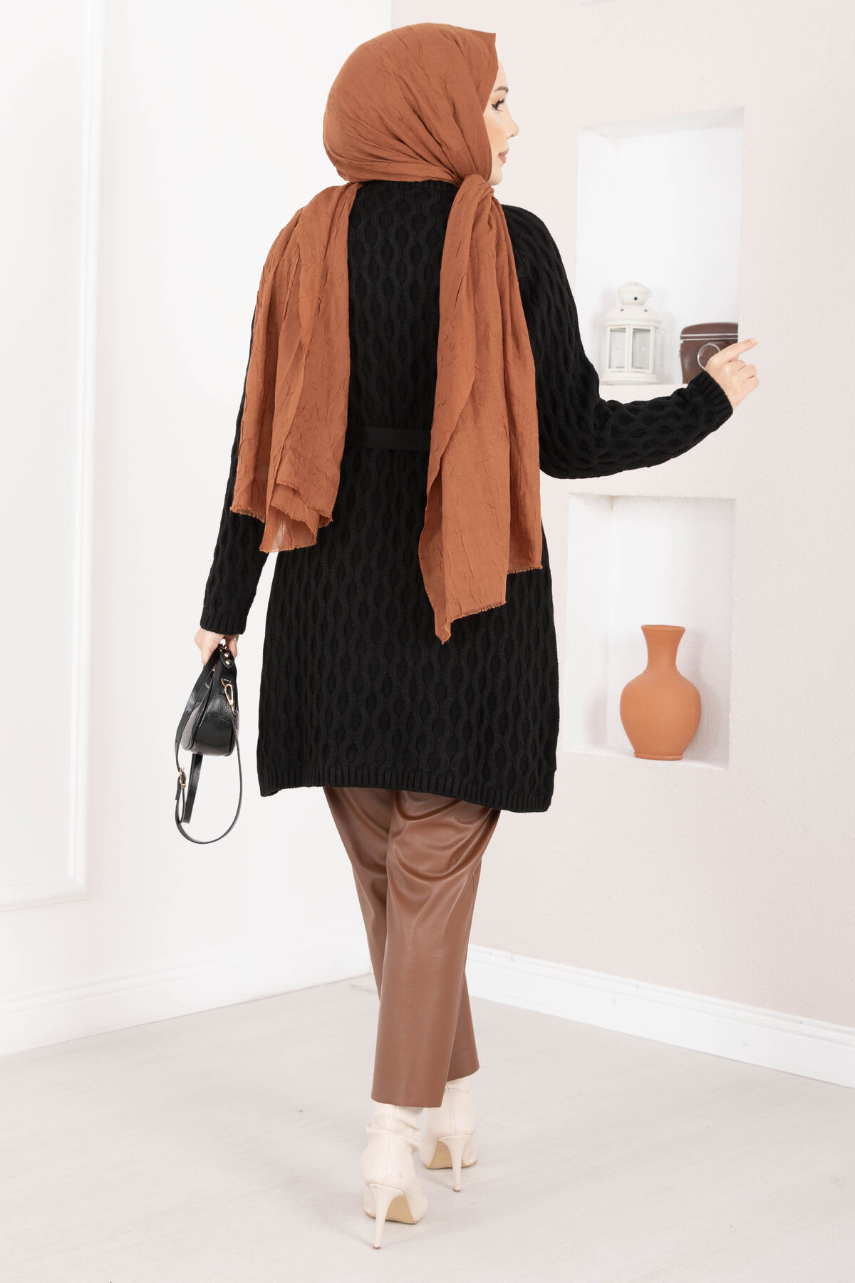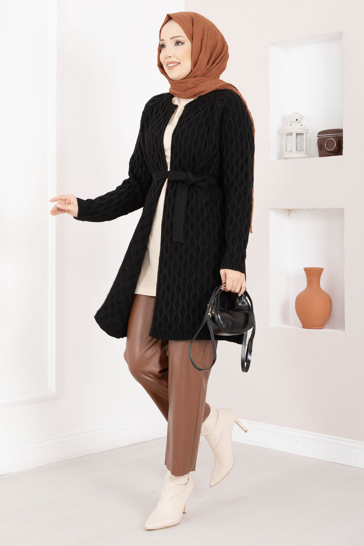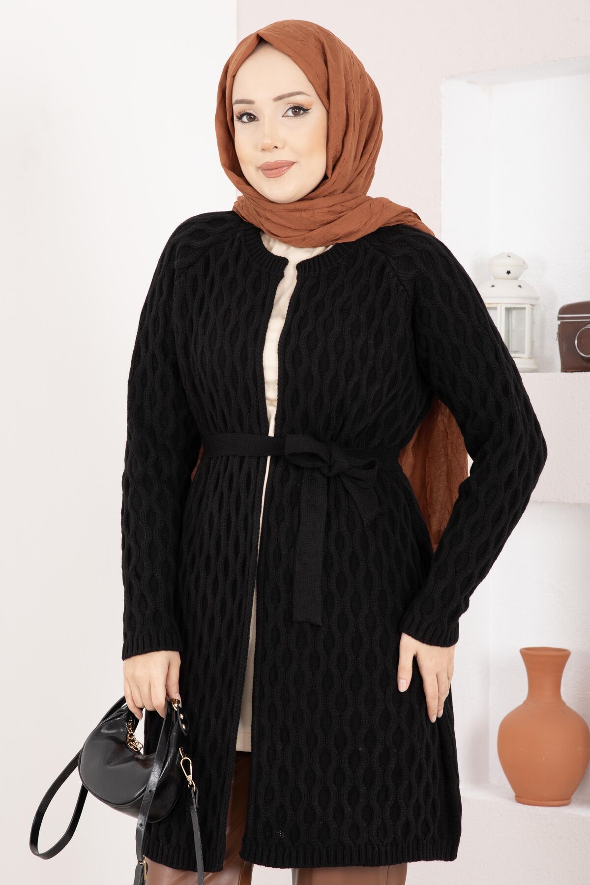 Saç Örgü Kuşaklı Triko Hırka Siyah