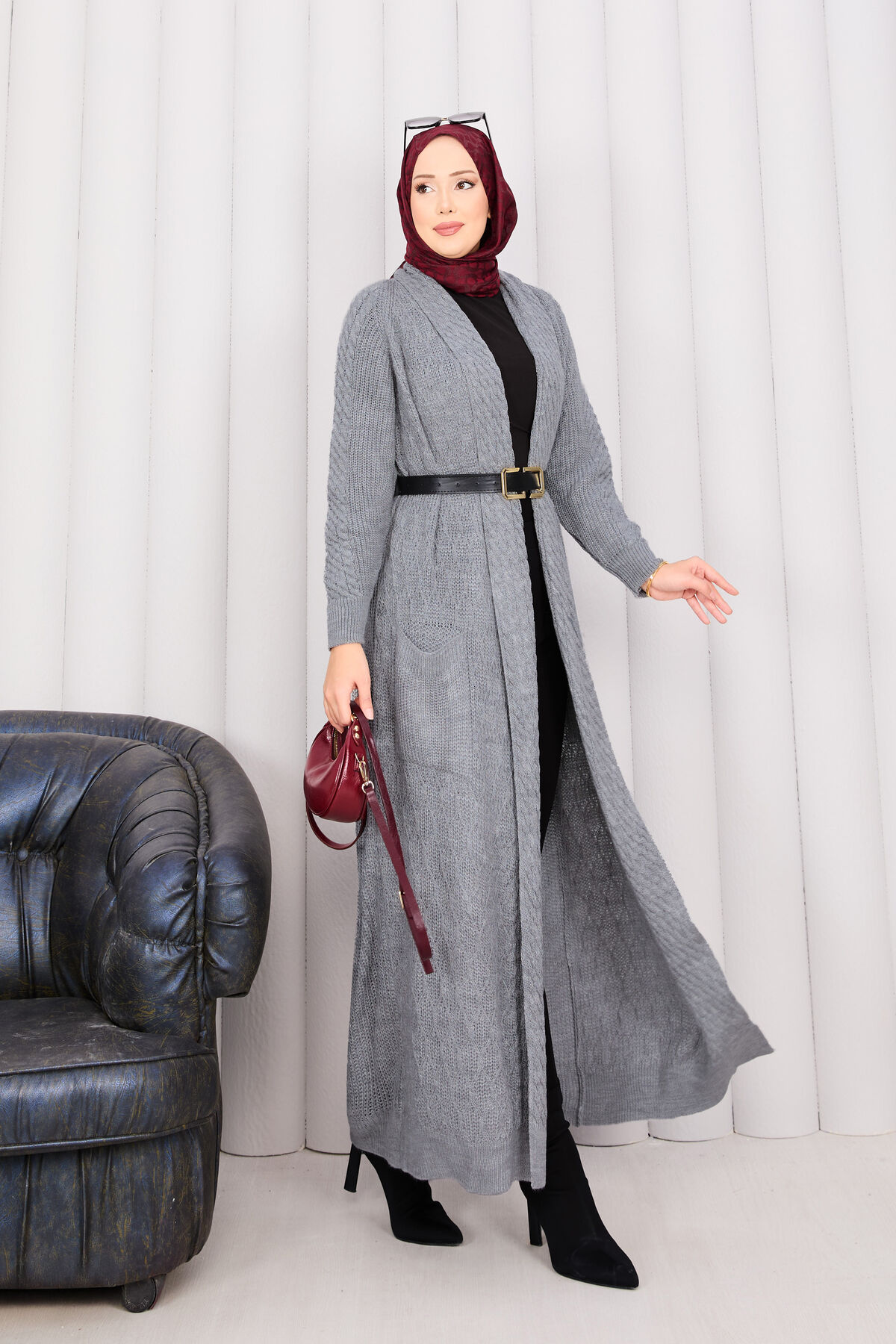 Saç Örgü Şal Yaka Tesettür Triko Hırka Gri