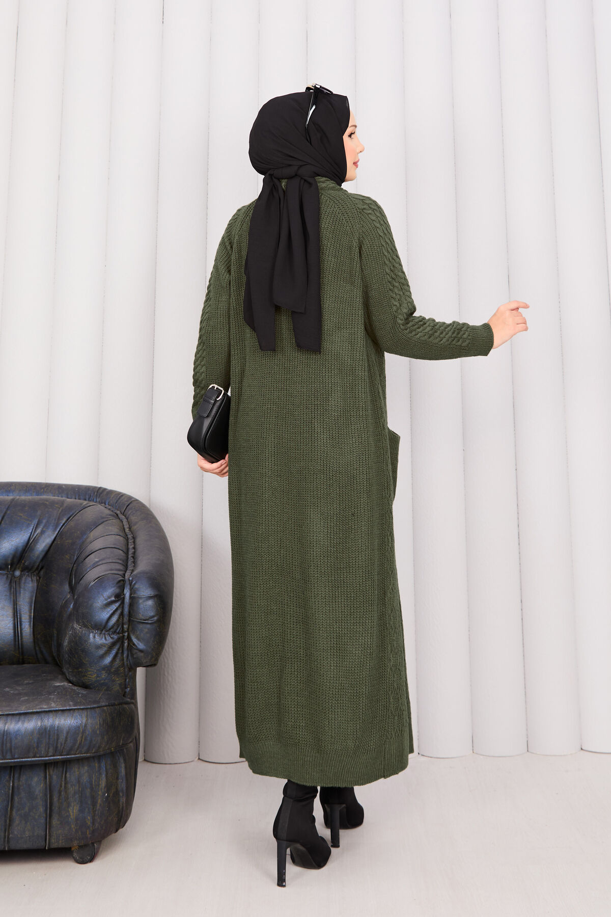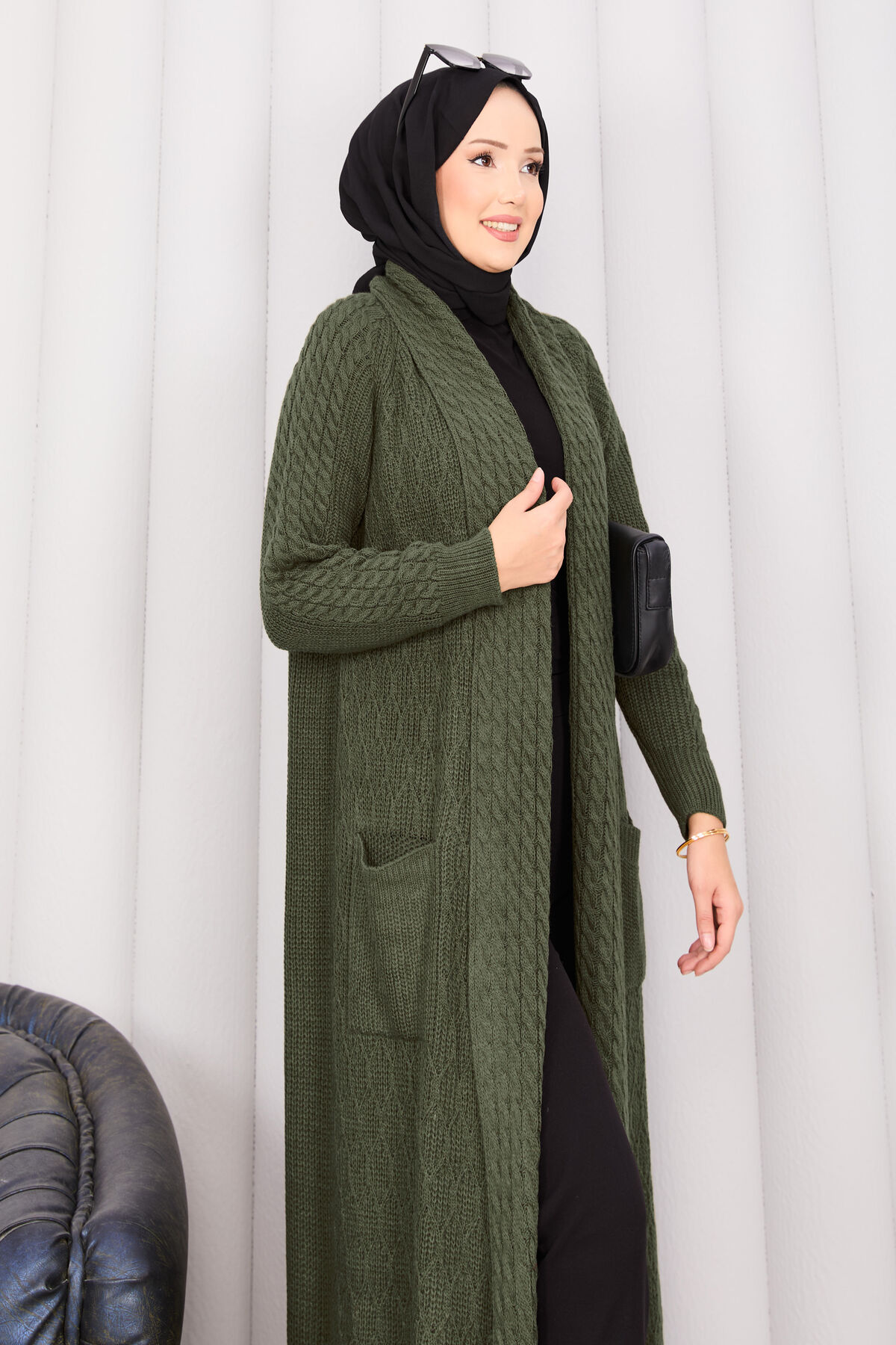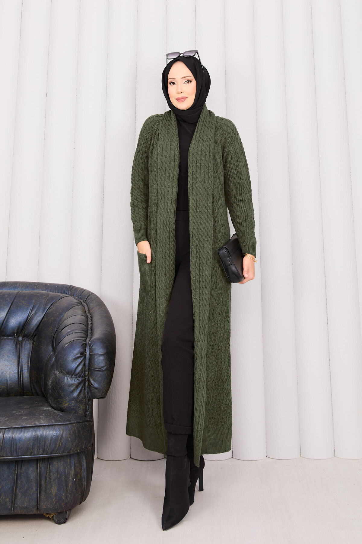 Saç Örgü Şal Yaka Tesettür Triko Hırka Haki