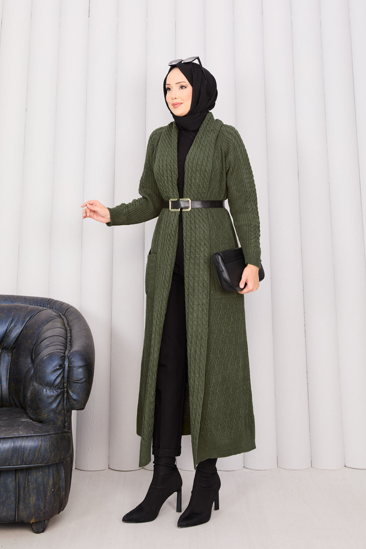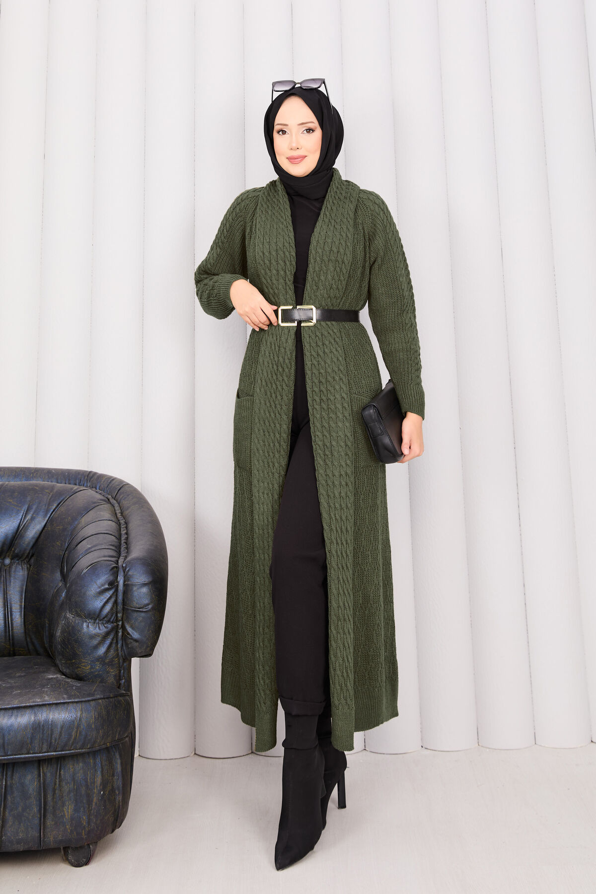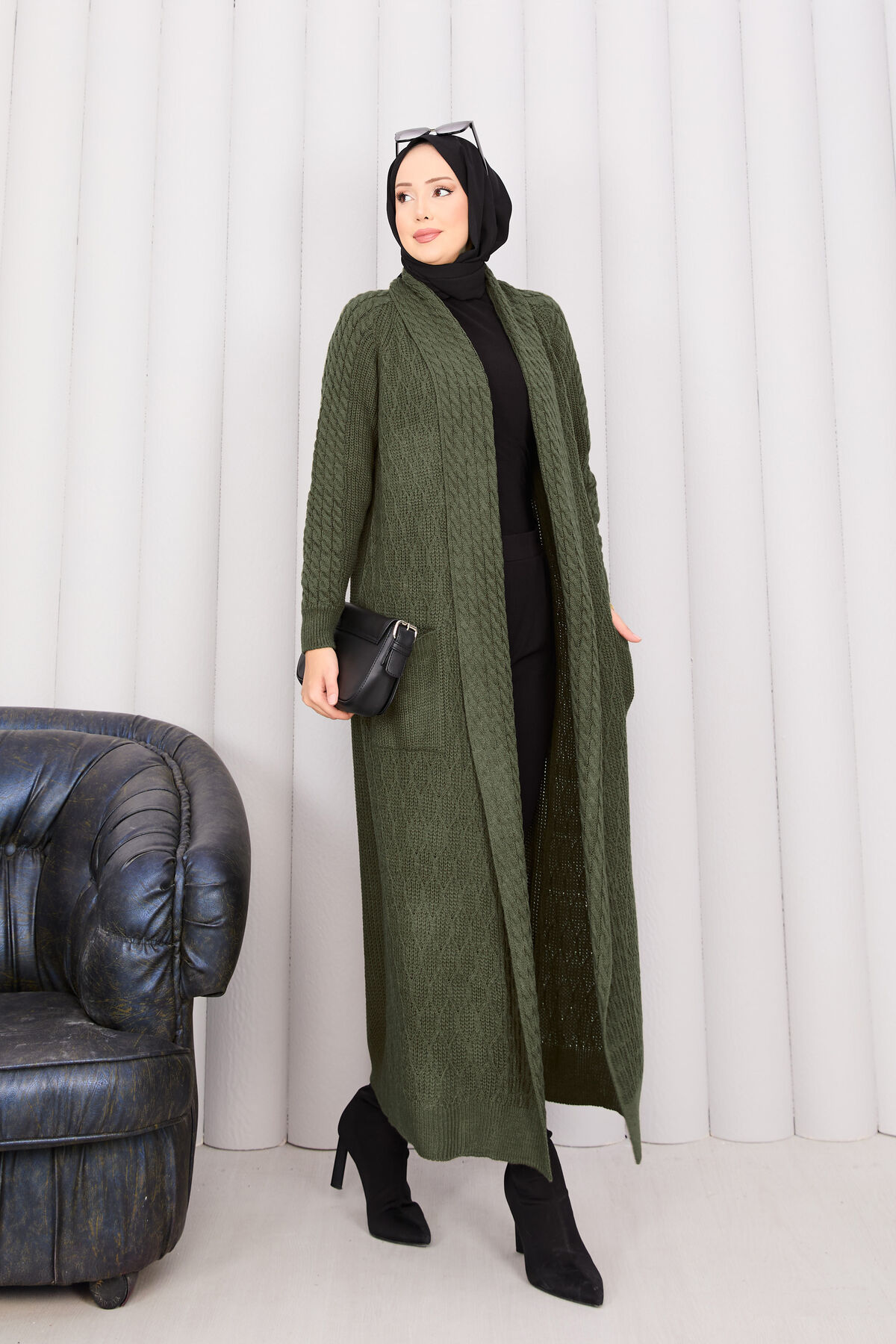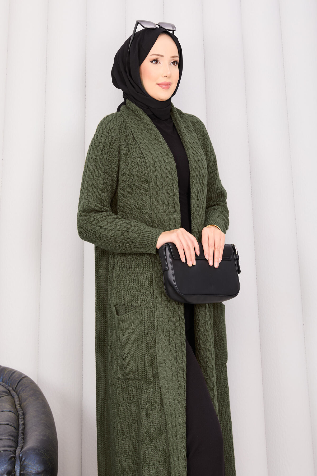Saç Örgü Şal Yaka Tesettür Triko Hırka Haki