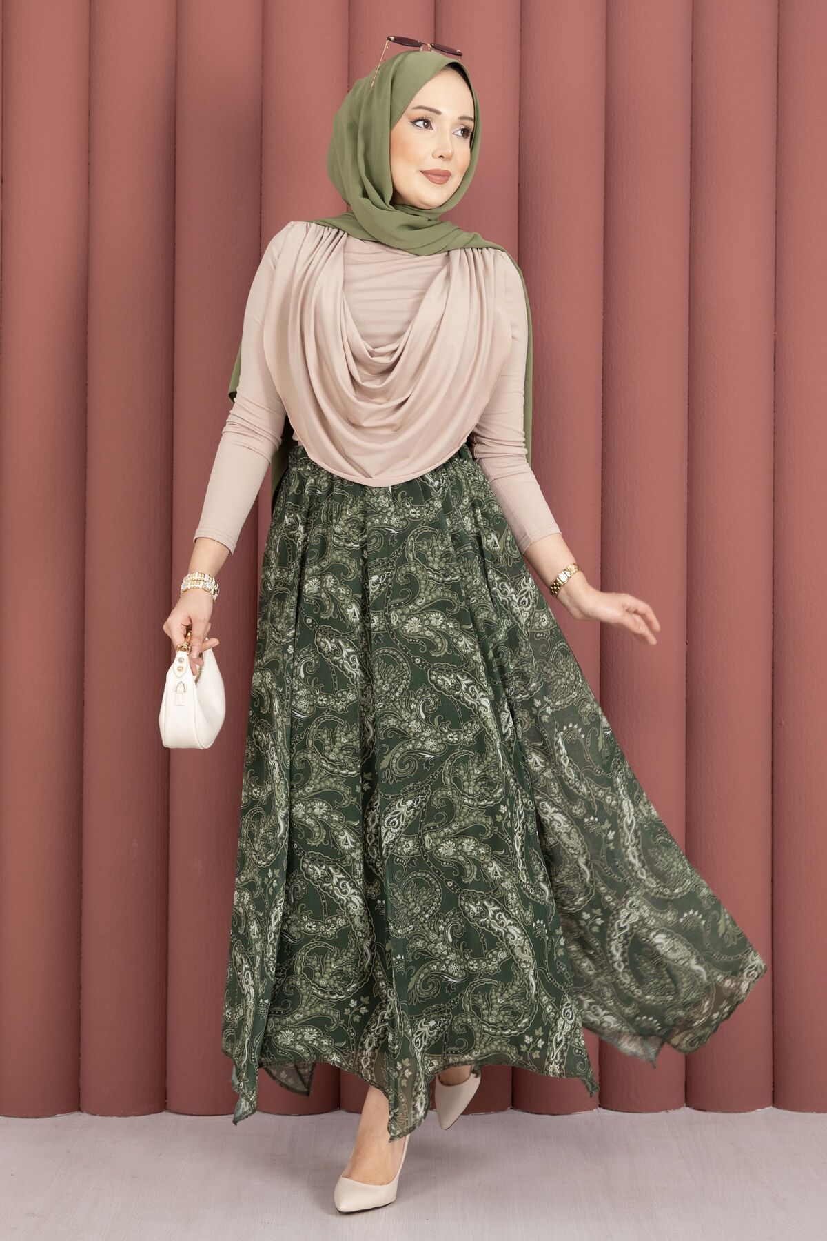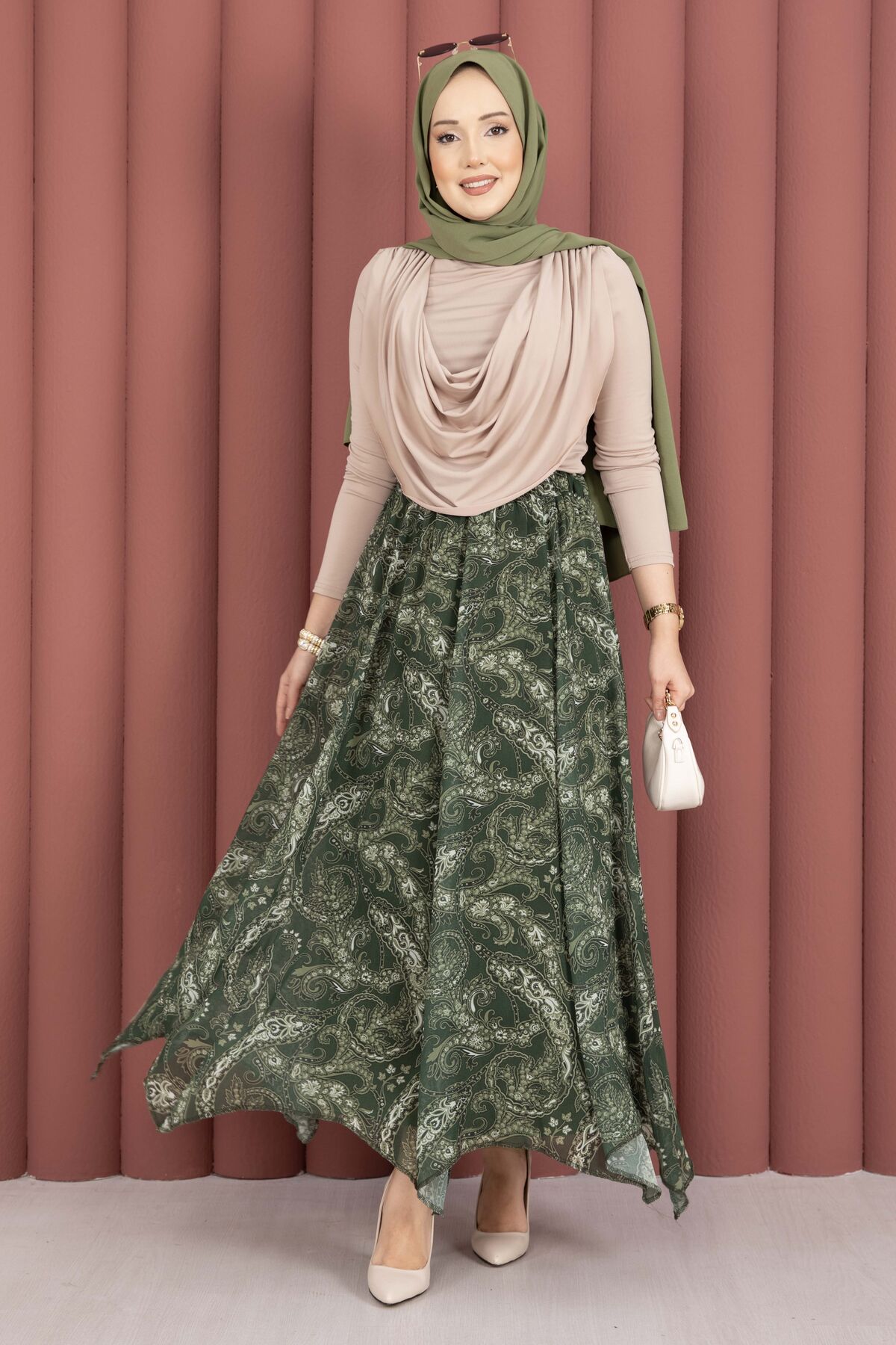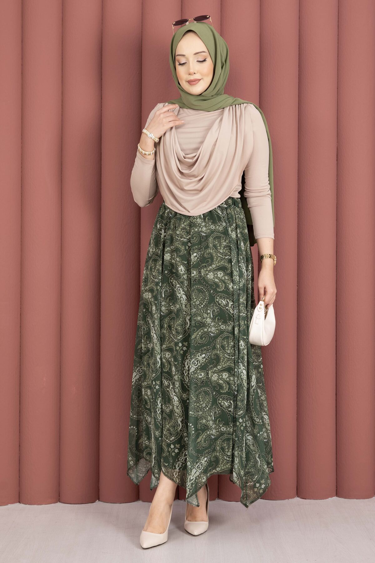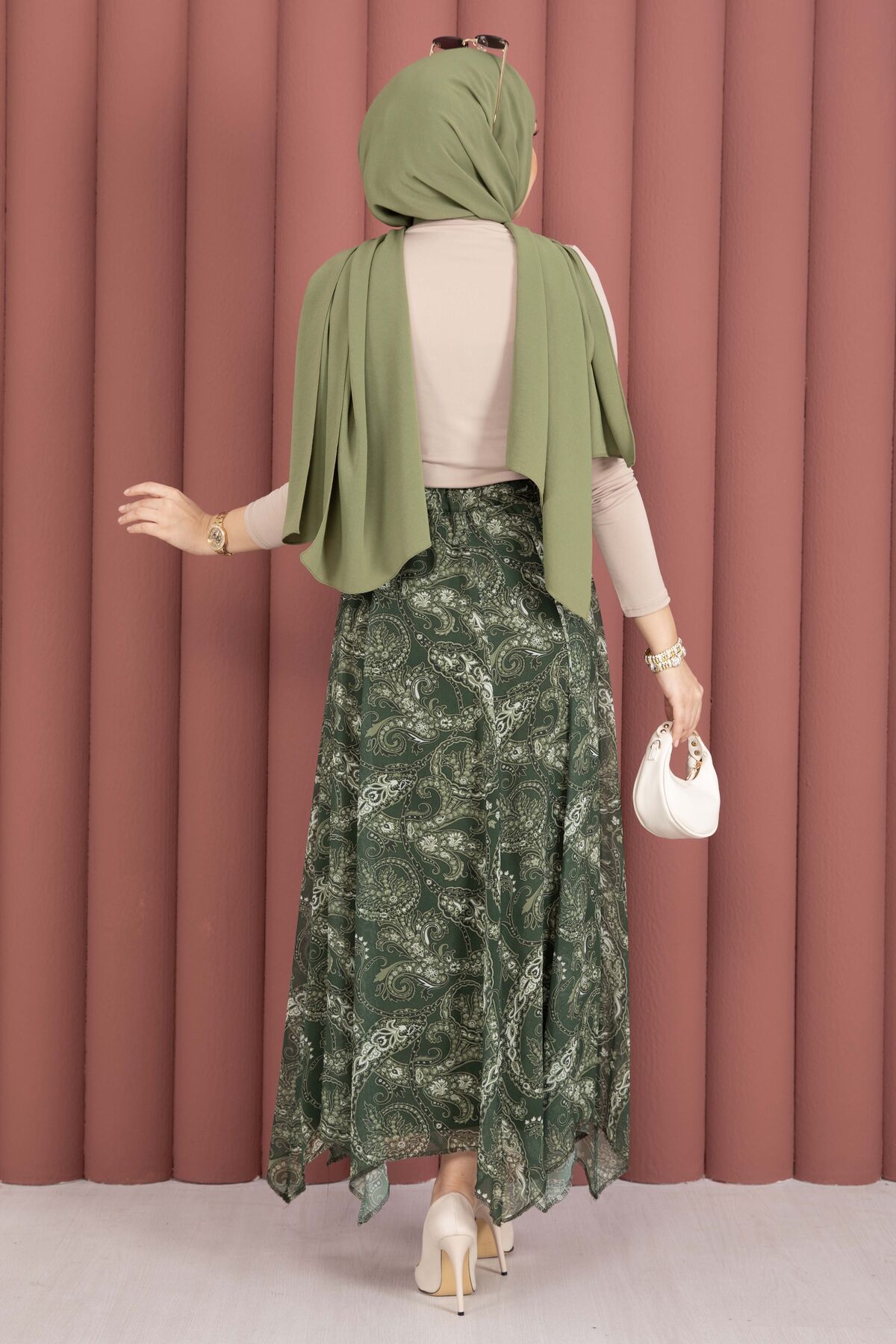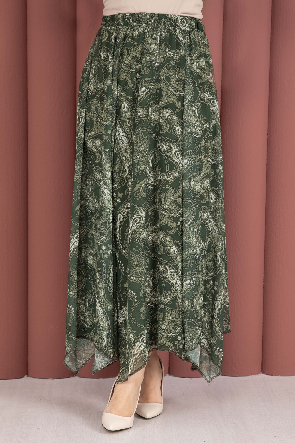 Şal Desen Asimetrik Kesim Şifon Etek Haki